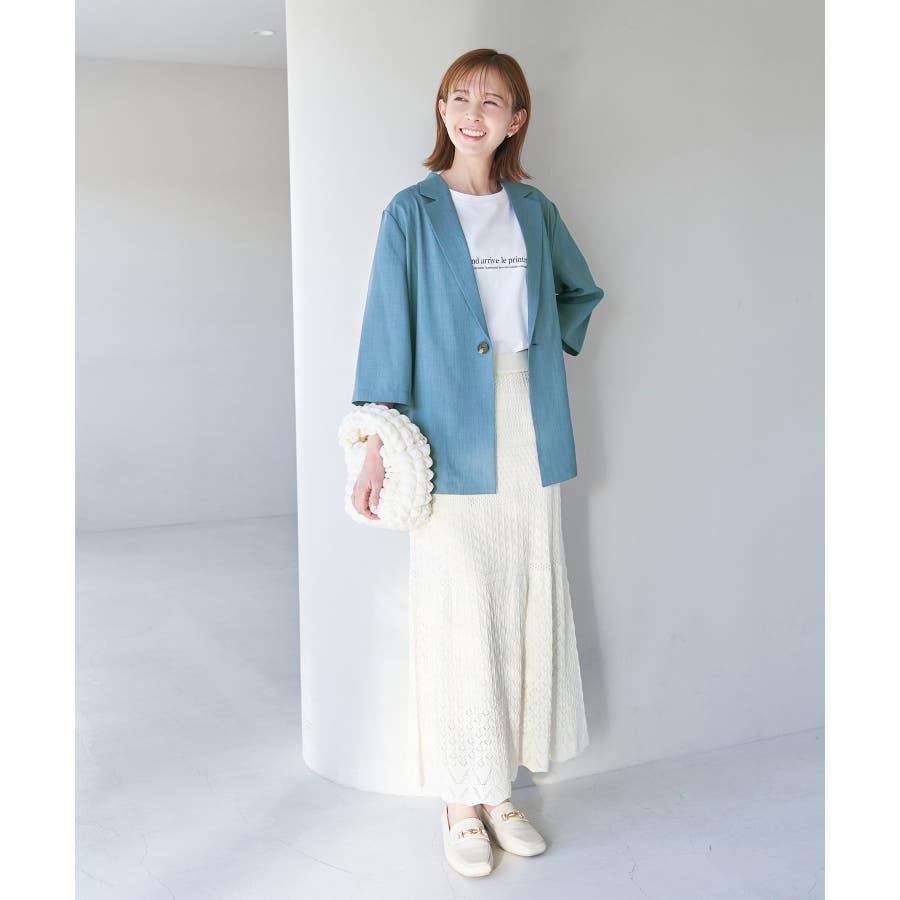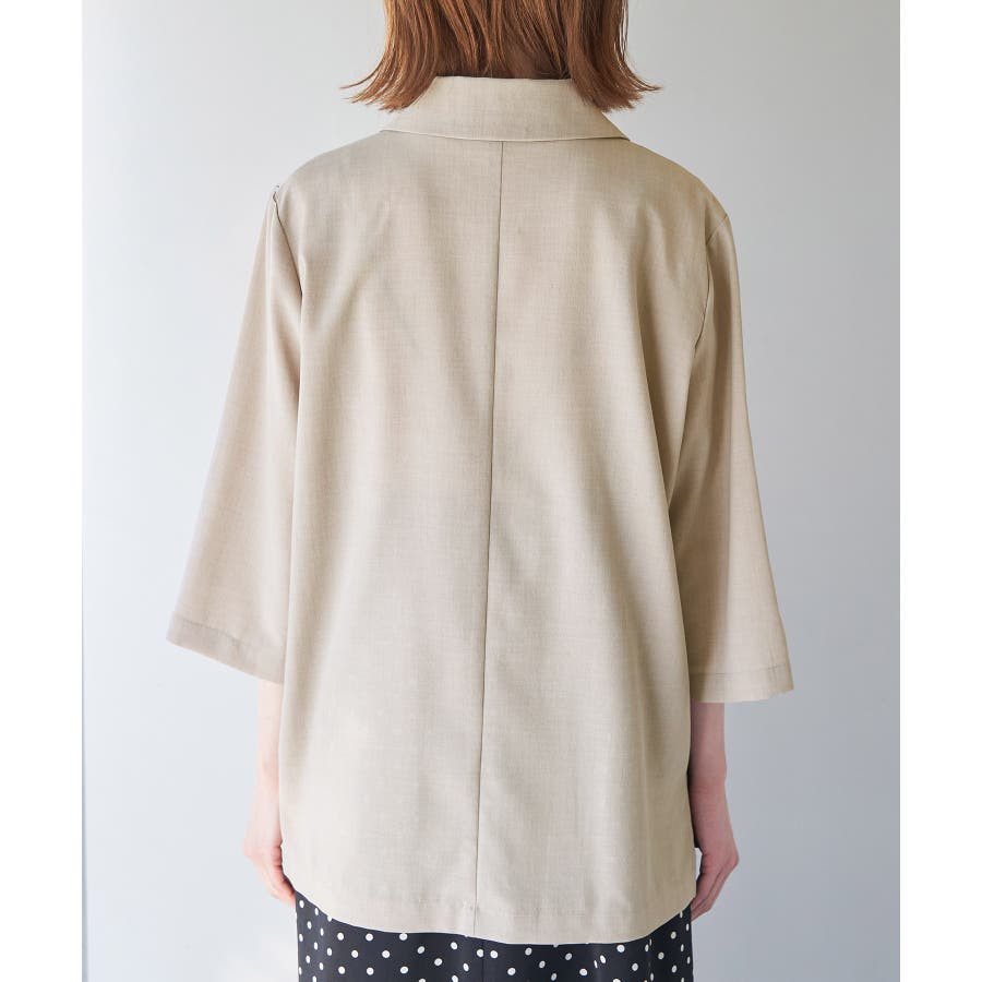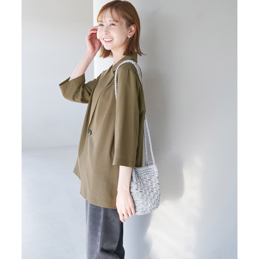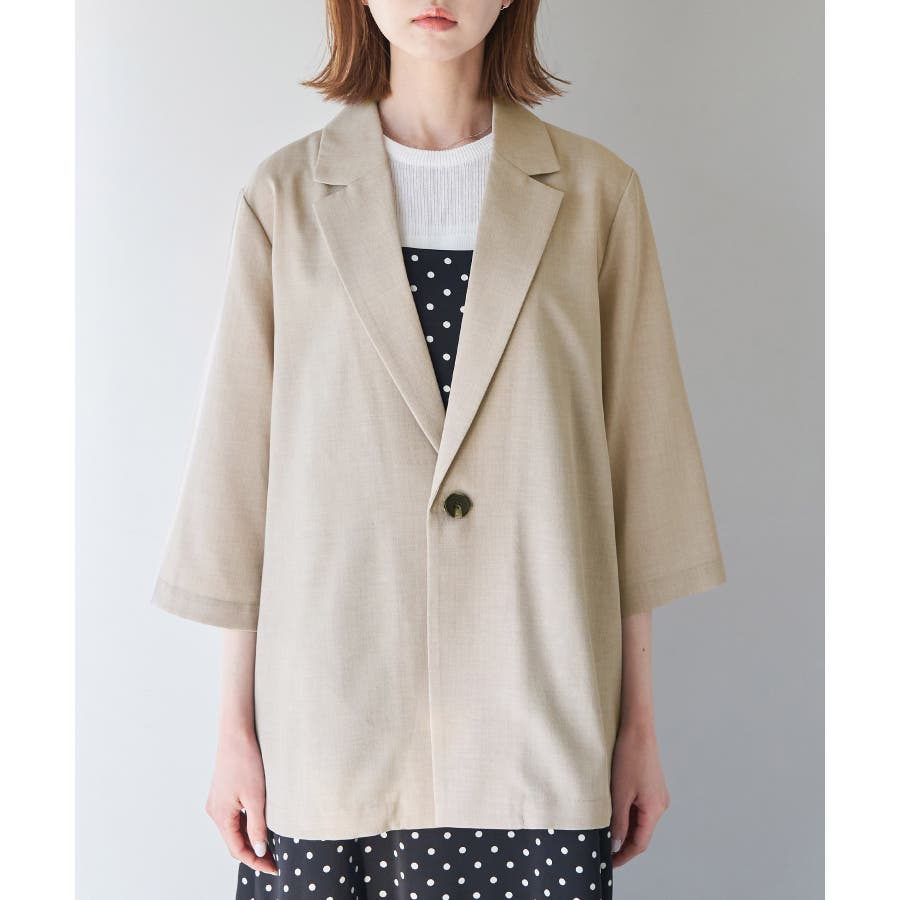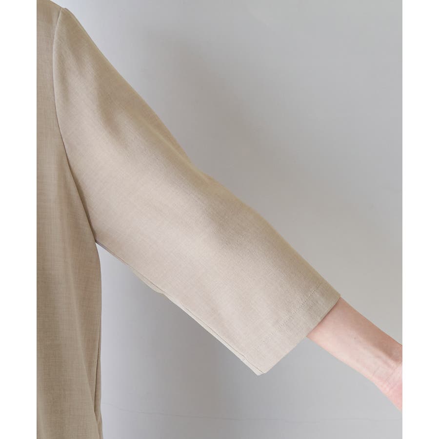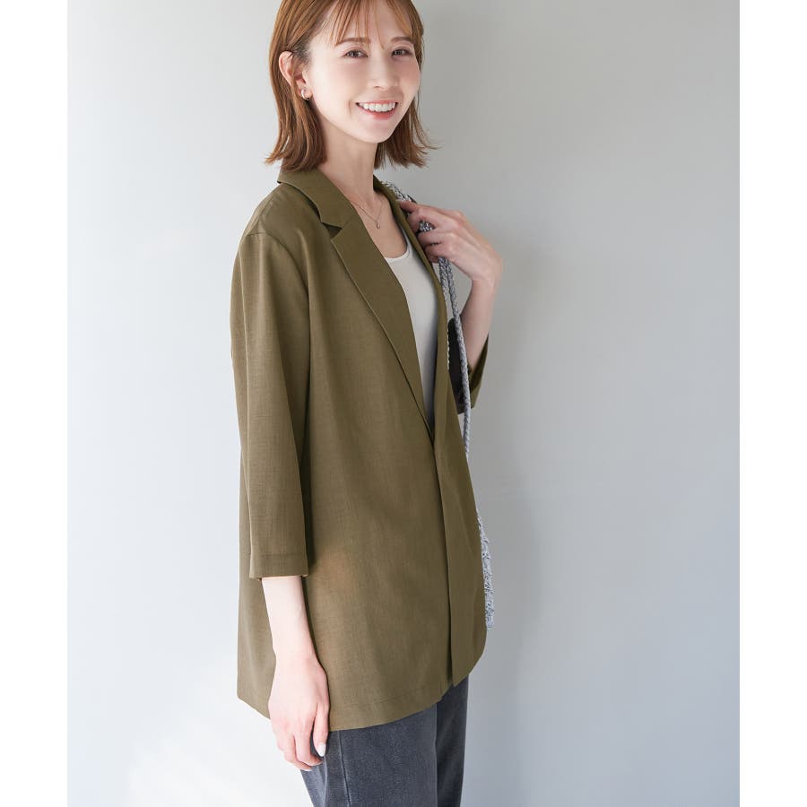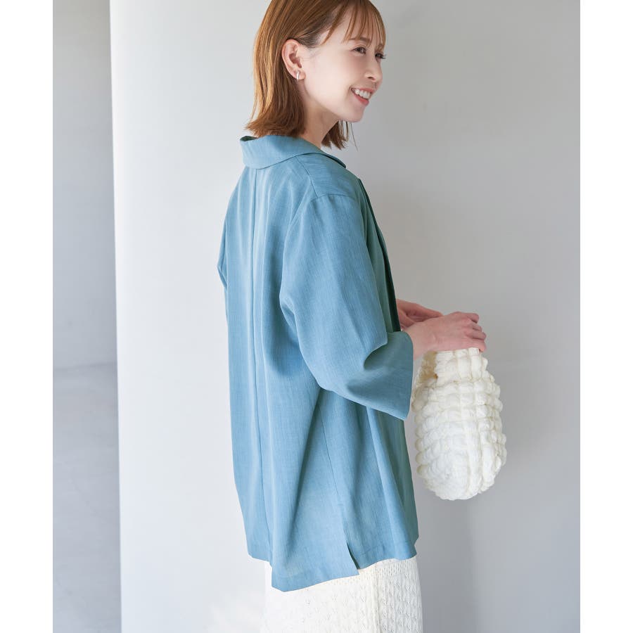 【素材感】 ・再生ポリエステルを使用した、サステナブルなアイテム。 ・清涼感のある涼しげな素材。 【デザイン・シルエット】 ・シアーで軽やかなテーラードジャケット。 ・袖先スリット入りでターンバックが可能。 ・メンズライクなゆったりフォルムで、ややカジュアルなフラットヘムを採用。 ・同素材でショート丈(品番:GDV13310)も展開。 【カラー】 ・カラーによって原産国が異なります。 チャコール(06)ベージュ(27)カーキ(36):カンボジア ターコイズ(49):中国 【スタイリングポイント】 ・夏らしいショートパンツとのスタイリングも一押し。 ・ロングワンピースにさらりと羽織って。 ・同シリーズでパンツ(品番:GDS13300)、スカート(品番:GDC13300)も展開しているので、セットアップスタイルもおすすめ。 ----------------------------- 裏地:なし 透け感:光に当てるとややあり 伸縮性:なし 生地感・厚さ:薄手 ポケット:なし 季節:春・夏 ----------------------------- ※撮影時の光、お使いのモニター環境によって色の見え方が違う場合がございます。 ※前回好評だった(品番:GDV12300)よりも袖口を短く、すっきりとした印象に。ボタンの色も変更しています。 ※重量は、サンプルの38サイズでの計測になります。 ※モデル身長:165cm 着用サイズ:38