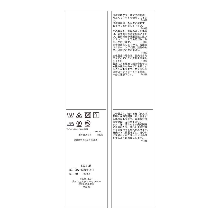 | 38 | 67cm | 40cm | 108.6cm | 40cm | 175g | (袖口)32 (袖幅)18.6 |