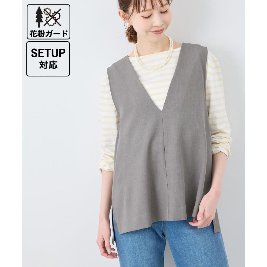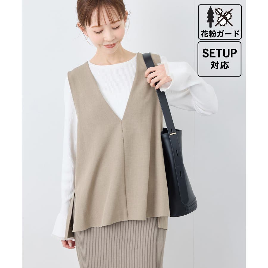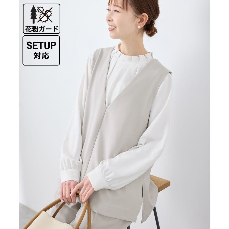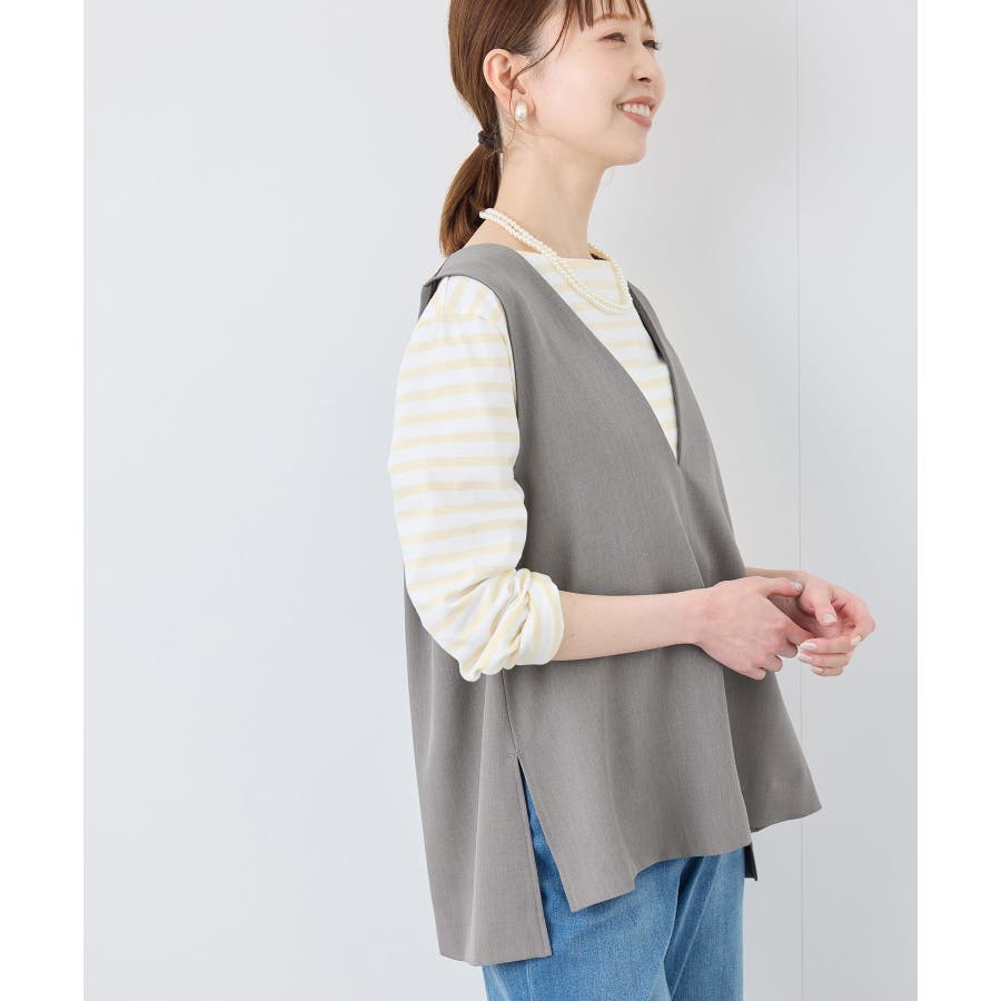 【素材感】 ・ほんのり光沢のあるツイル素材で仕立て、フォーマルシーンやハレの日にも適した上品な印象。 ・花粉が付着しにくく、落としやすい加工を施した花粉ガード機能で、春のお出かけや通勤、お仕事にも最適。 【デザイン・シルエット】 ・すっきりとしたVネックと長めに施したサイドスリットがポイント。 ・ヒップに掛かるほどのレングスで、お腹やヒップをさりげなくカバーしつつ美しいシルエットを演出。 ・シンプルで合わせやすいデザインは、フォーマルからカジュアルまで幅広いシーンで着回し可能。 ・同シリーズでジャケット(品番:GDV15070)も展開。 【カラー】 ・チャコール、ライトグレー、ベージュ、ネイビーの4色展開で、オフィスカジュアルからデイリーまで使いやすいカラーバリエーション。 ※チャコール(06)は一部店舗限定カラーとなります。 【スタイリングポイント】 ・ワイドパンツやロングスカートとのコーディネートが今季のおすすめ。 ・春先は薄手のタートルネックやシャツを重ねた着こなしで季節感を演出。 ・暖かくなったら、ノースリーブのトップスやワンピースの羽織りとして活躍。 ・カラーによっては、同シリーズのパンツ(品番:GDS15070)とのセットアップも可能で、卒園/卒業式や入園/入学式などのセレモニー/オケージョンにも対応。 ----------------------------- 裏地:なし 透け感:なし 伸縮性:ややあり 生地感・厚さ:普通 ポケット:なし 季節:春・夏・秋・冬 ----------------------------- ※撮影時の光、お使いのモニター環境によって色の見え方が違う場合がございます。 ※モデル身長:165cm 着用サイズ:38