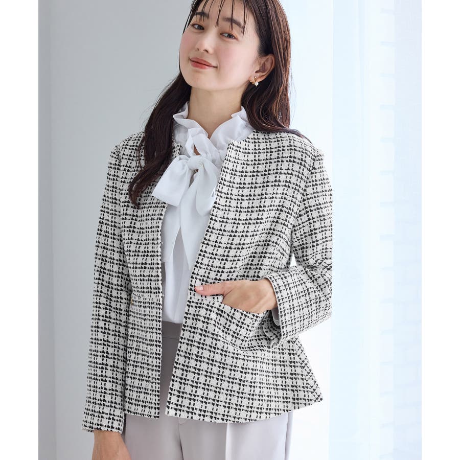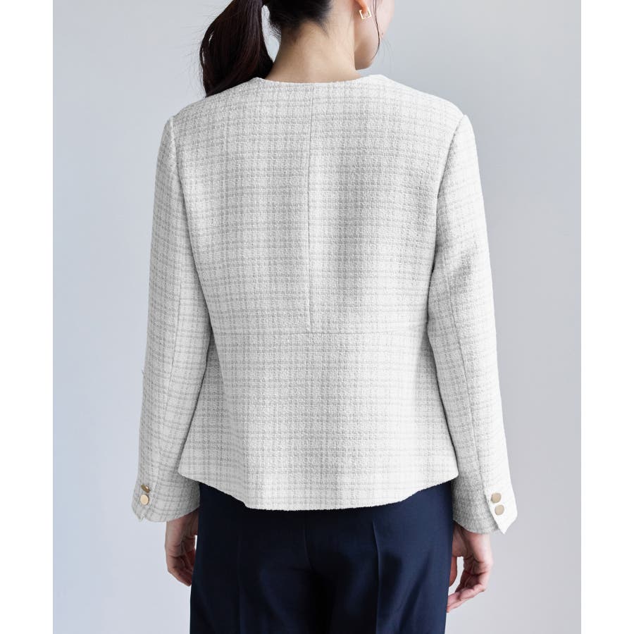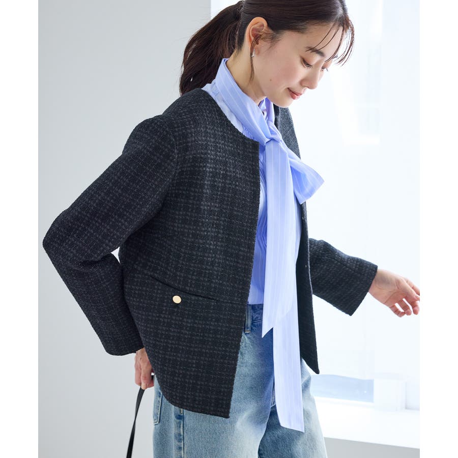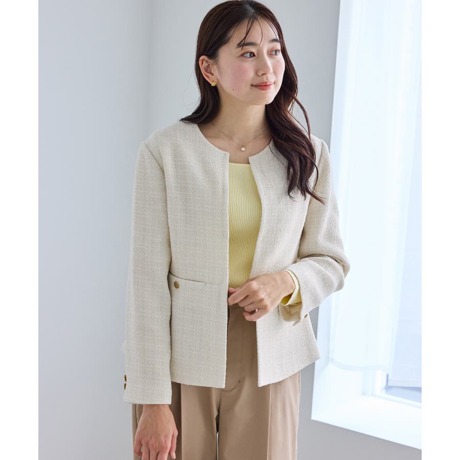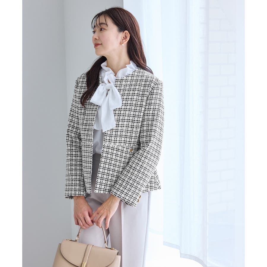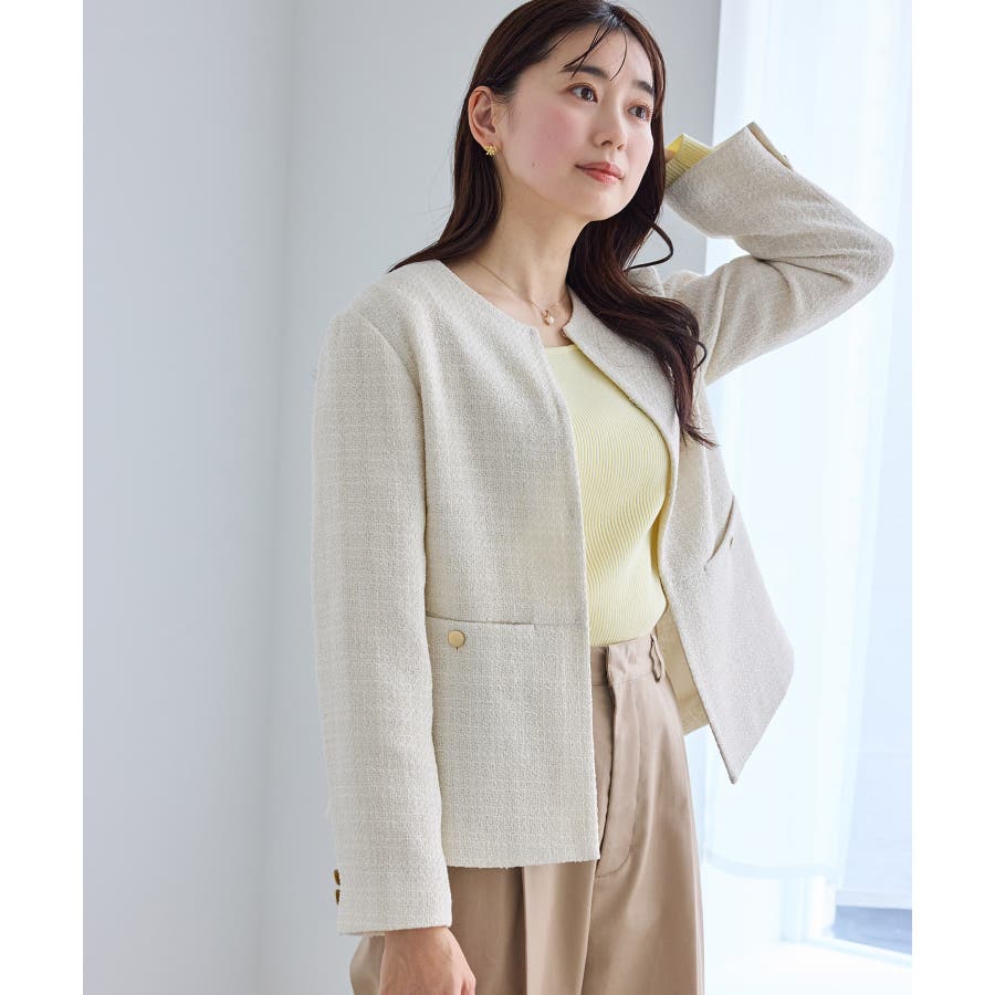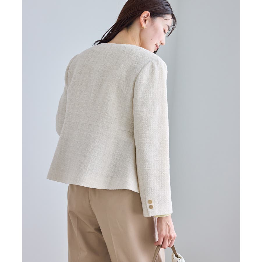 ・エターナルなノーカラーデザインが魅力のツイードジャケット。