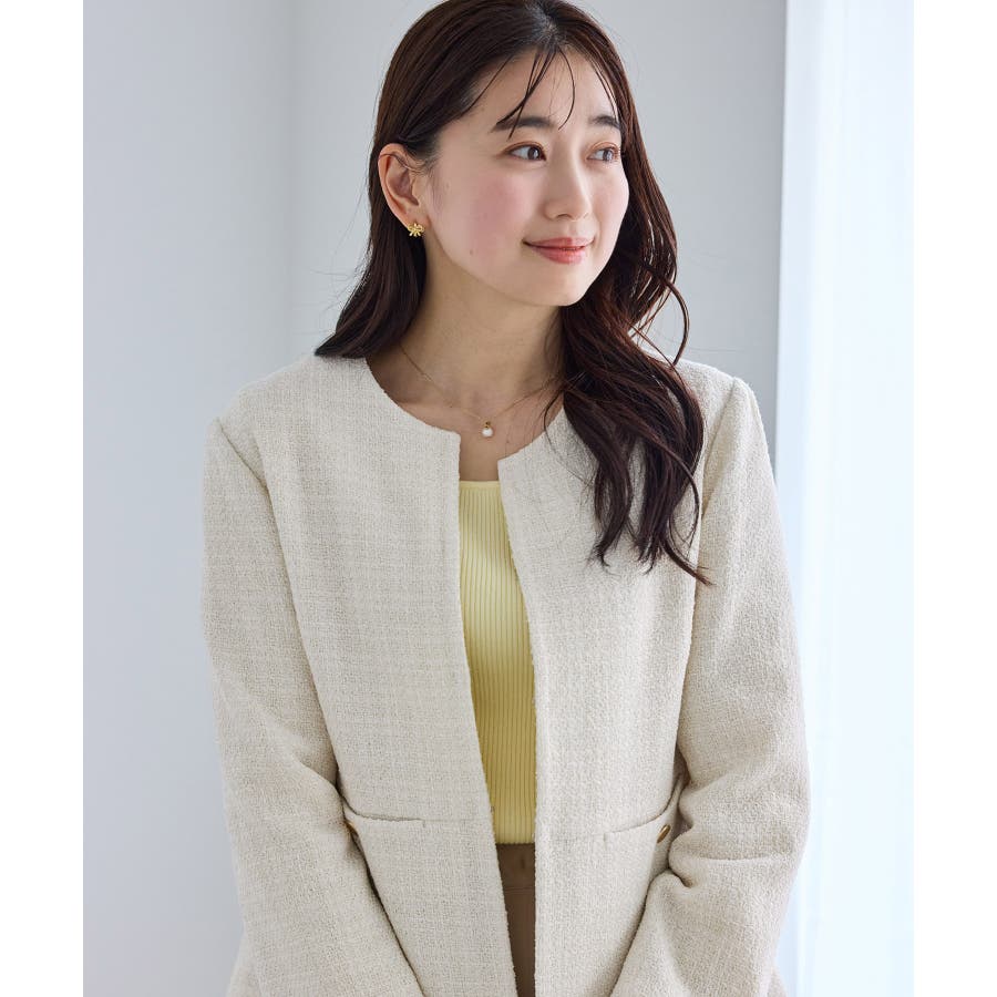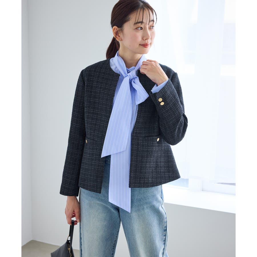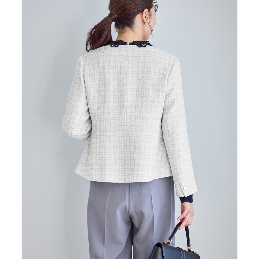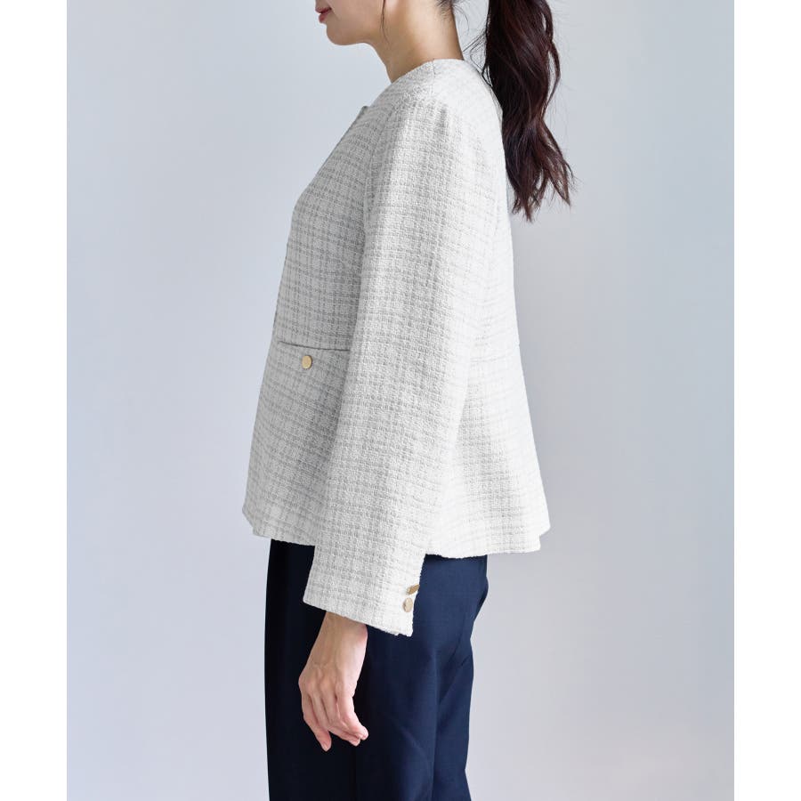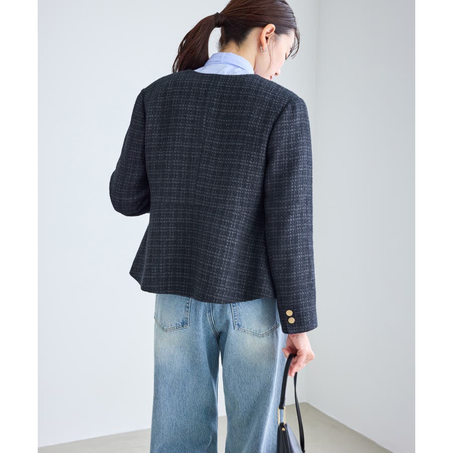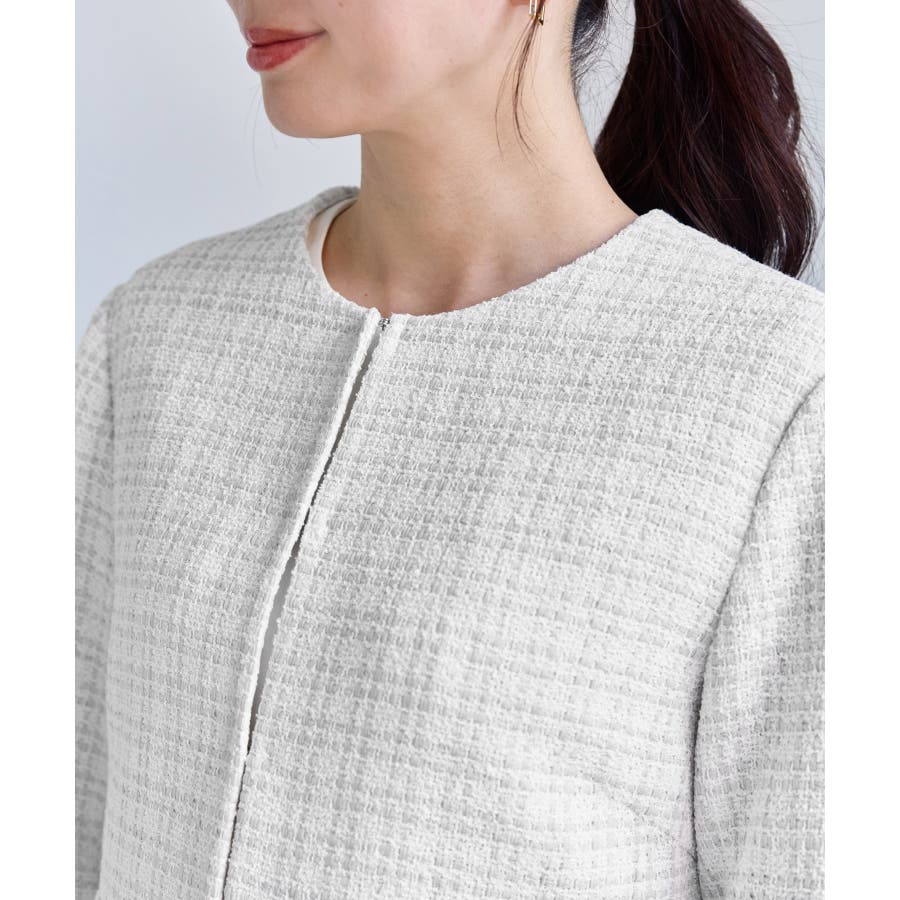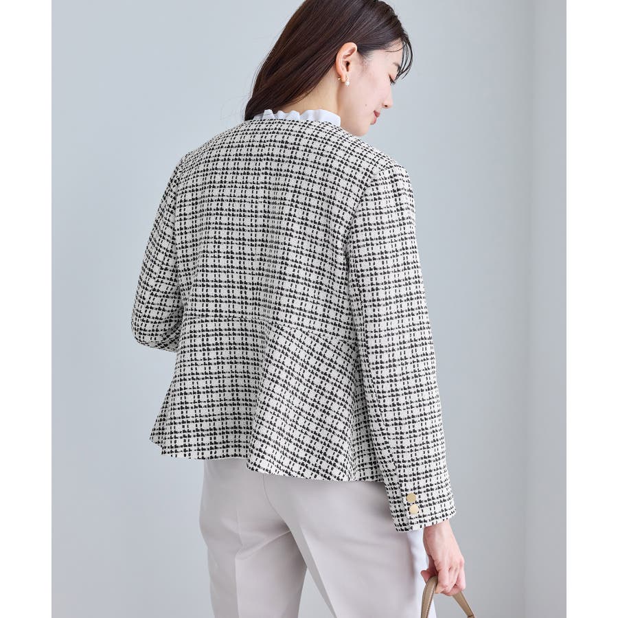 ・エターナルなノーカラーデザインが魅力のツイードジャケット。