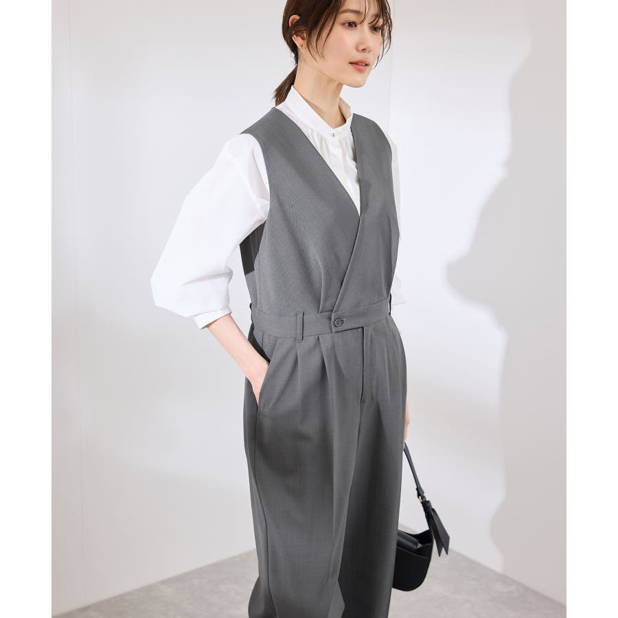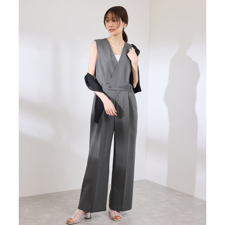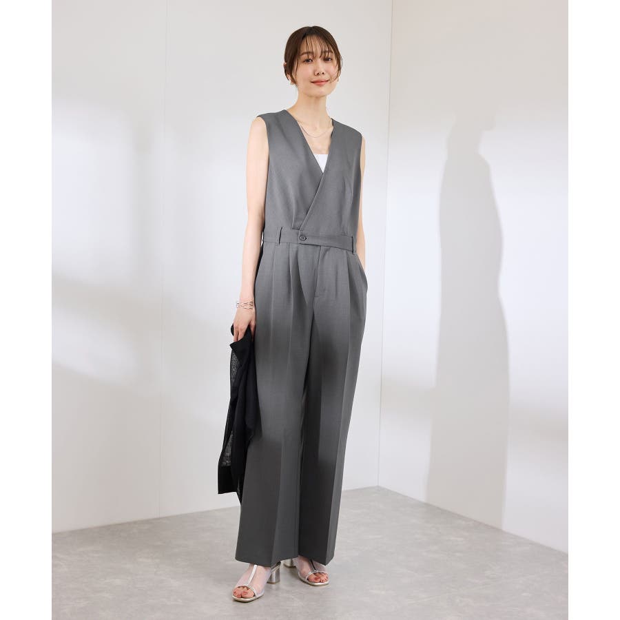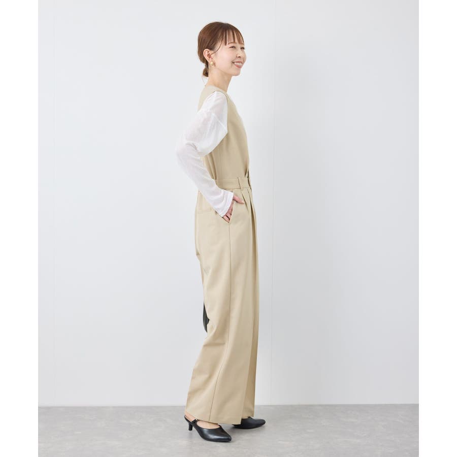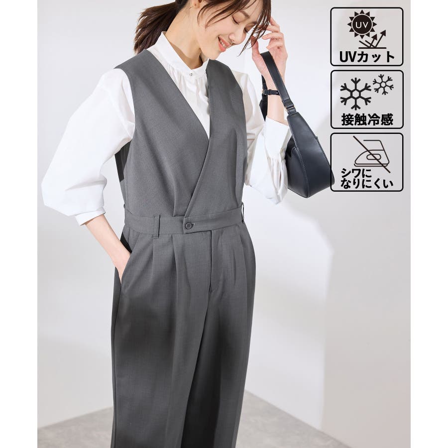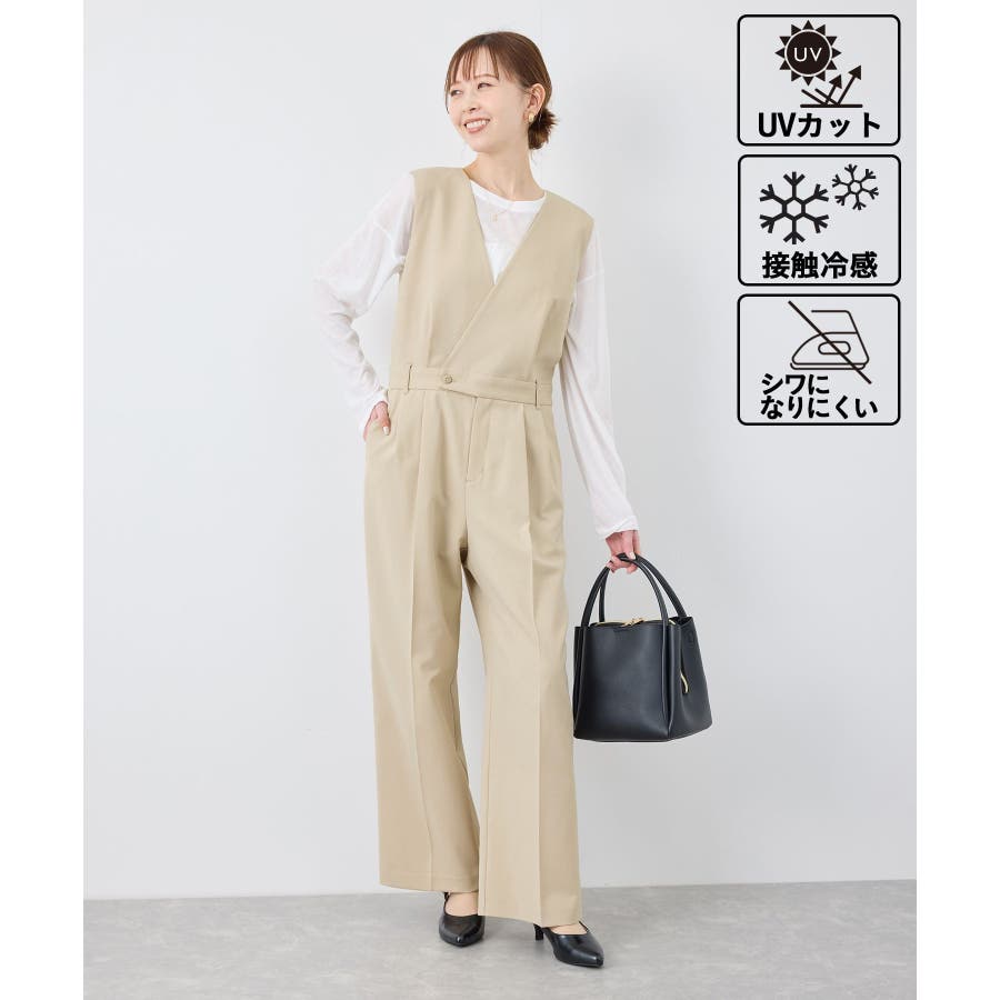 【素材感】 ・UVカット(紫外線遮蔽率90%以上)素材。 ・ひんやりとした涼しい着心地の接触冷感。 ・シワになりにくく、洗濯後のお手入れがしやすいイージーケア。 【デザイン・シルエット】 ・ベルトラインの切り替え入りで、セパレート風デザインのスリーブレスオールインワン。 ・パンツラインはややワイドで、センタークリース入りのマスキュリンなデザイン。 ・トップはフロントが併せデザインになっているのが特徴。 ・接触冷感性、防シワ性に優れた機能性の高い一着。 ・ウォッシャブル対応。 【カラー】 ・チャコールグレー、ベージュの落ち着いた2色展開。 【スタイリングポイント】 ・春先はインにタートルネックシャツやボーダーシャツなどを併せて。 ・暑い時期には、キャミソールやタンクトップでシンプルに着こなして。 ・足元はパンプスならきれいめに、スニーカーでカジュアルダウンもOK。 ----------------------------- 裏地:あり 透け感:なし 伸縮性:なし 生地感・厚さ:普通 ウエスト:後ろゴム ポケット:あり 季節:春・夏・秋 ----------------------------- ※撮影時の光、お使いのモニター環境によって色の見え方が違う場合がございます。 ※モデル身長:165cm 着用サイズ:38