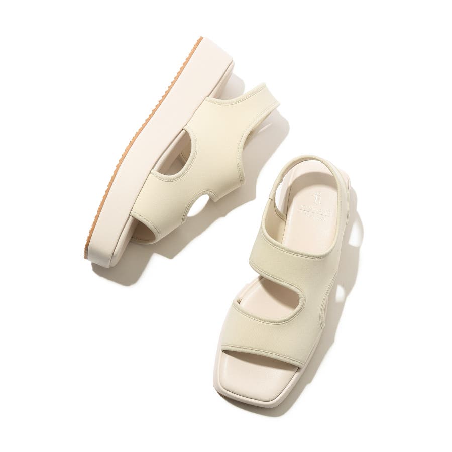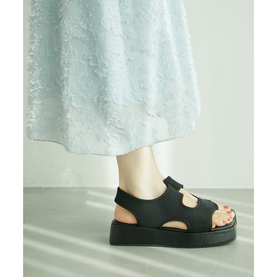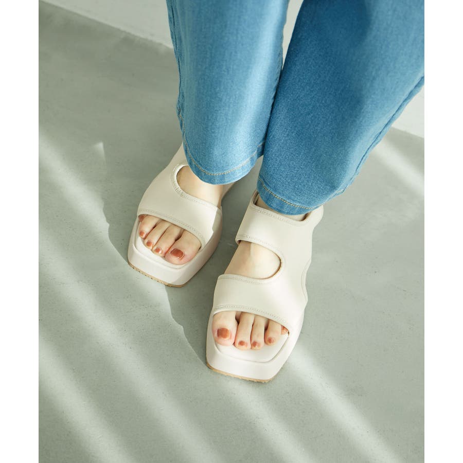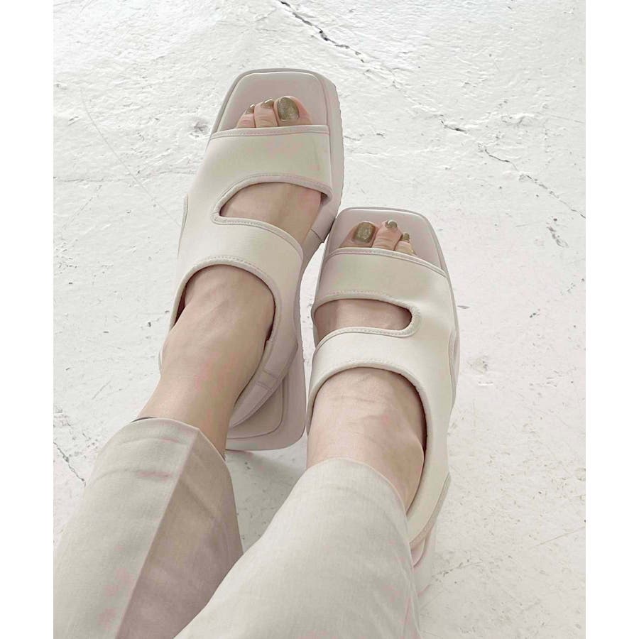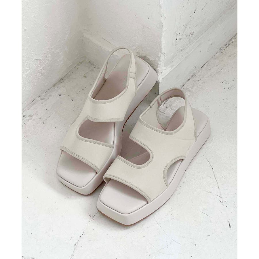 【デザイン・シルエット】 ・アッパーのカッティングが斬新な、バックストラップのプラットフォームサンダル。 ・モードなスクエアトゥを採用。 ・ソールはフラットで安定感のある履き心地。 【カラー】 ・ブラック、アイボリーのモノトーン2色展開。 【スタイリングポイント】 ・きれいめなパンツや、花柄デザインなどの大人なロングスカートに合わせるのがおすすめ。 ※撮影時の光、お使いのモニター環境によって色の見え方が違う場合がございます。 ※幅:親指の付け根~小指の付け根の寸法になります。 ワイズ(足囲):親指の付け根~小指の付け根を通りぐるりと一周させた寸法になります。 サイズ詳細をご確認ください。