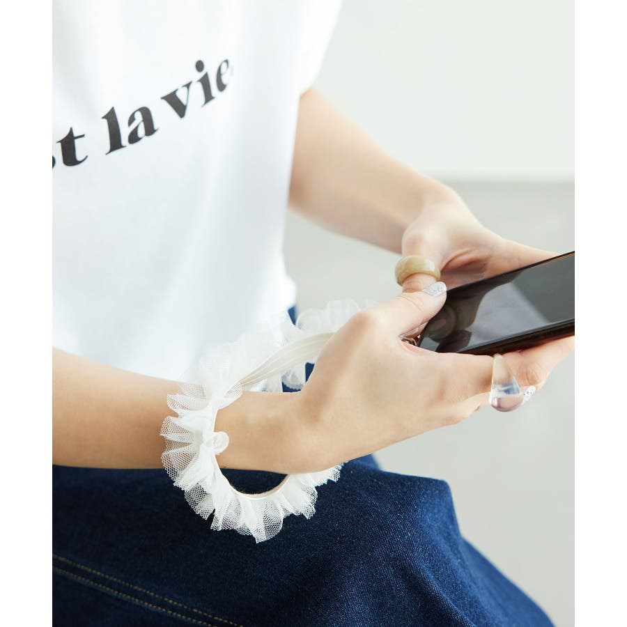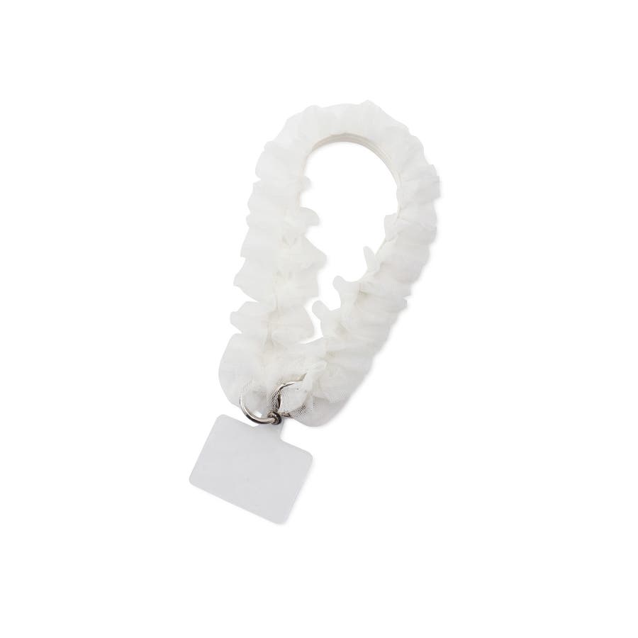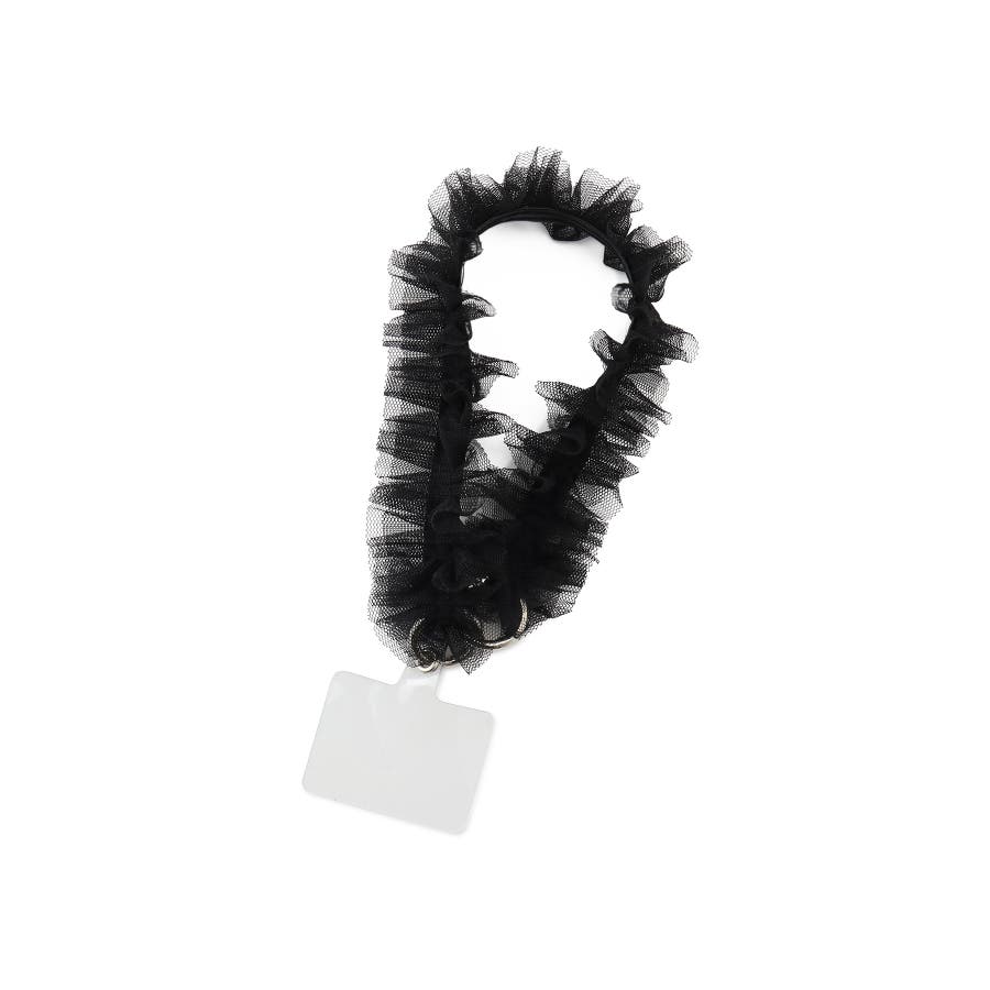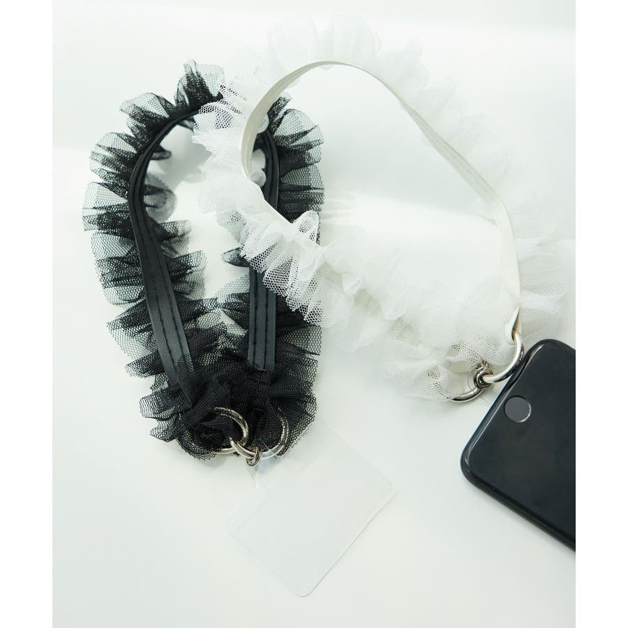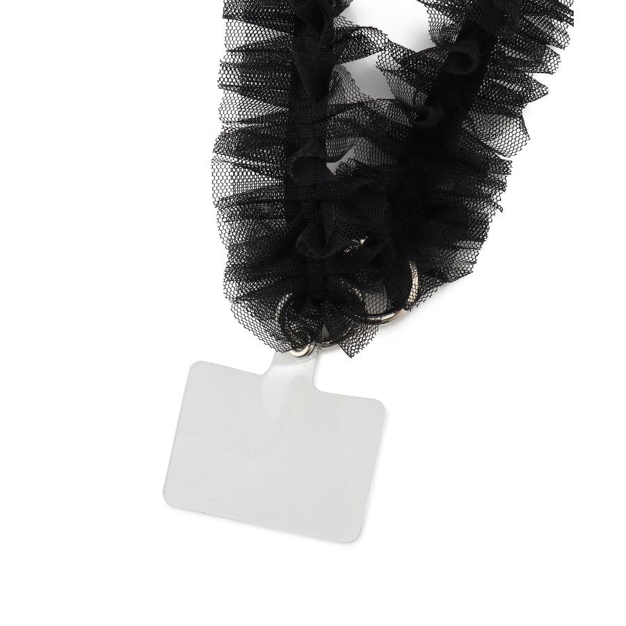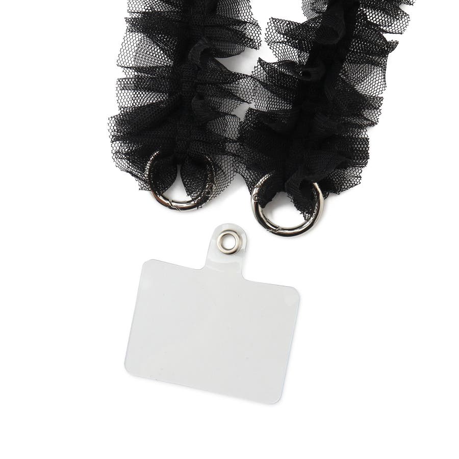 【デザイン・シルエット】 ・シアーなチュール素材をフリルで重ねたフォーンストラップ。 ・腕に通して持ちやすい、短めのハンドストラップ。 【カラー】 ・ブラック、オフホワイトのモノトーン2色で展開。 ※撮影時の光、お使いのモニター環境によって色の見え方が違う場合がございます。
