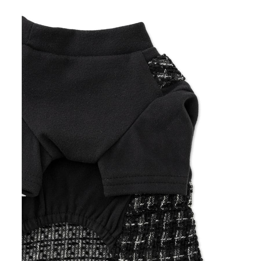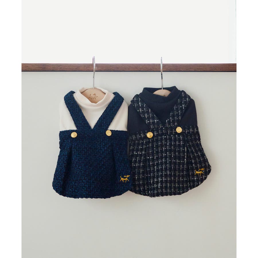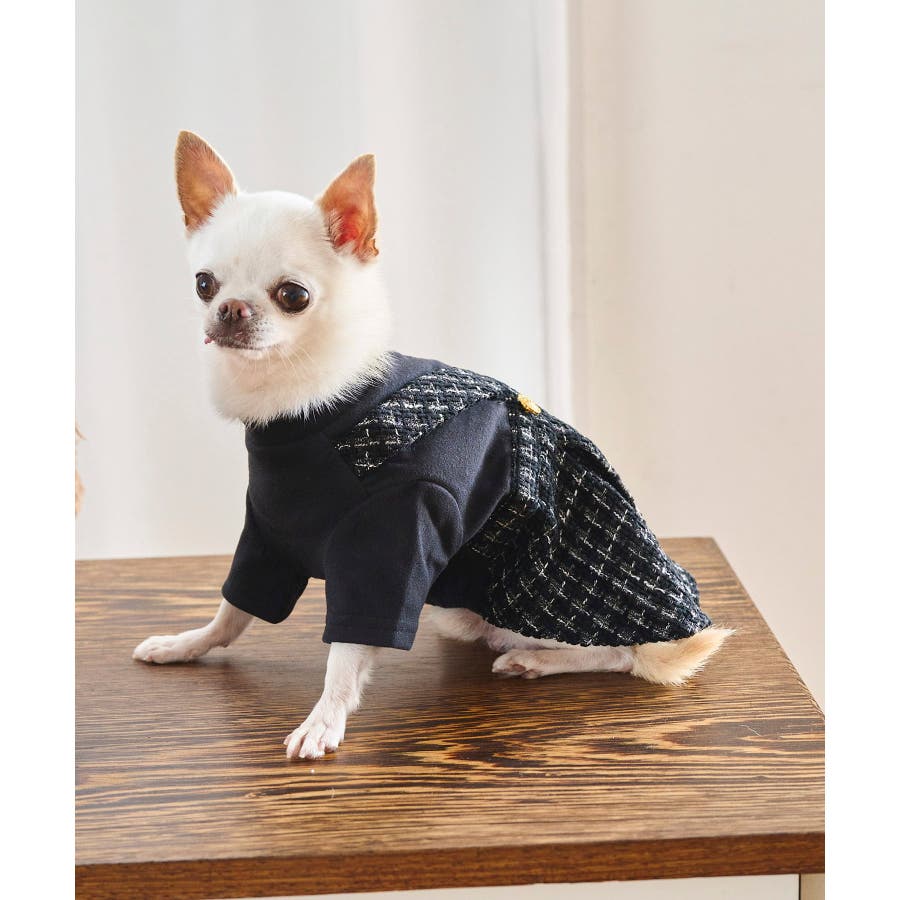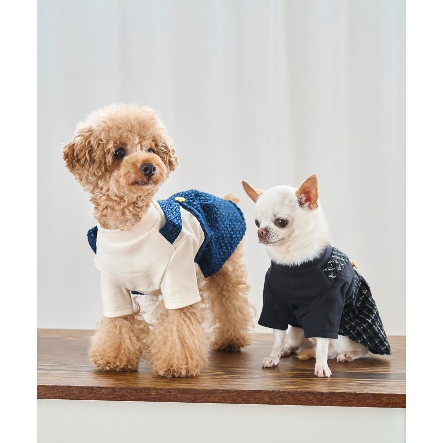 【素材感】 ・暖かみのあるツイード素材でシーズンライクなルックに。 【デザイン・シルエット】 ・ROPE' PICNIC人気のドッグウェア&グッズシリーズ。 ・トップスとジャンパースカートをコーディネートしたような、ドッキングデザインのワンピース。 【カラー】 ・ブラック系(02):ブラック×ブラックツイード ・ネイビー系(41):ホワイト×ネイビーツイードの2色展開。 ※撮影時の光、お使いのモニター環境によって色の見え方が違う場合がございます。 ※タグの画像のサイズは参考ヌード寸になります。商品サイズはサイズ情報でご確認ください。 ※モデル犬体重は詳細画像をご確認ください。