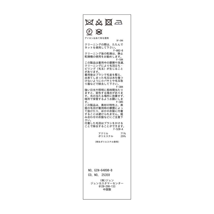 | 素材 | チャコール(06):アクリル 71% ポリエステル 29%|キナリ(16):アクリル 71% ポリエステル 29%|ブラウン系(23):アクリル 71% ポリエステル 29%|ブルー系(45):アクリル 71% ポリエステル 29%|ピンク(63):アクリル 71% ポリエステル 29% |