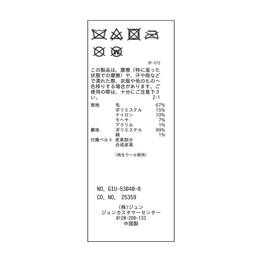 | 素材 | ブラック(01):(表地) 毛 75% ポリエステル 13% ナイロン 10% モヘヤ 1% アクリル 1% (裏地) ポリエステル 99% 綿 1% (付属ベルト 皮革部分) 合成皮革|ベージュ(27):(表地) 毛 67% ポリエステル 15% ナイロン 10% モヘヤ 7% アクリル 1% (裏地) ポリエステル 99% 綿 1% (付属ベルト 皮革部分) 合成皮革 |