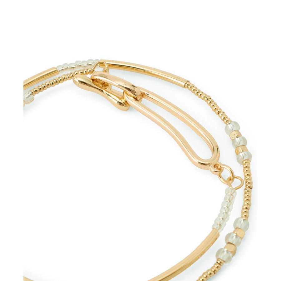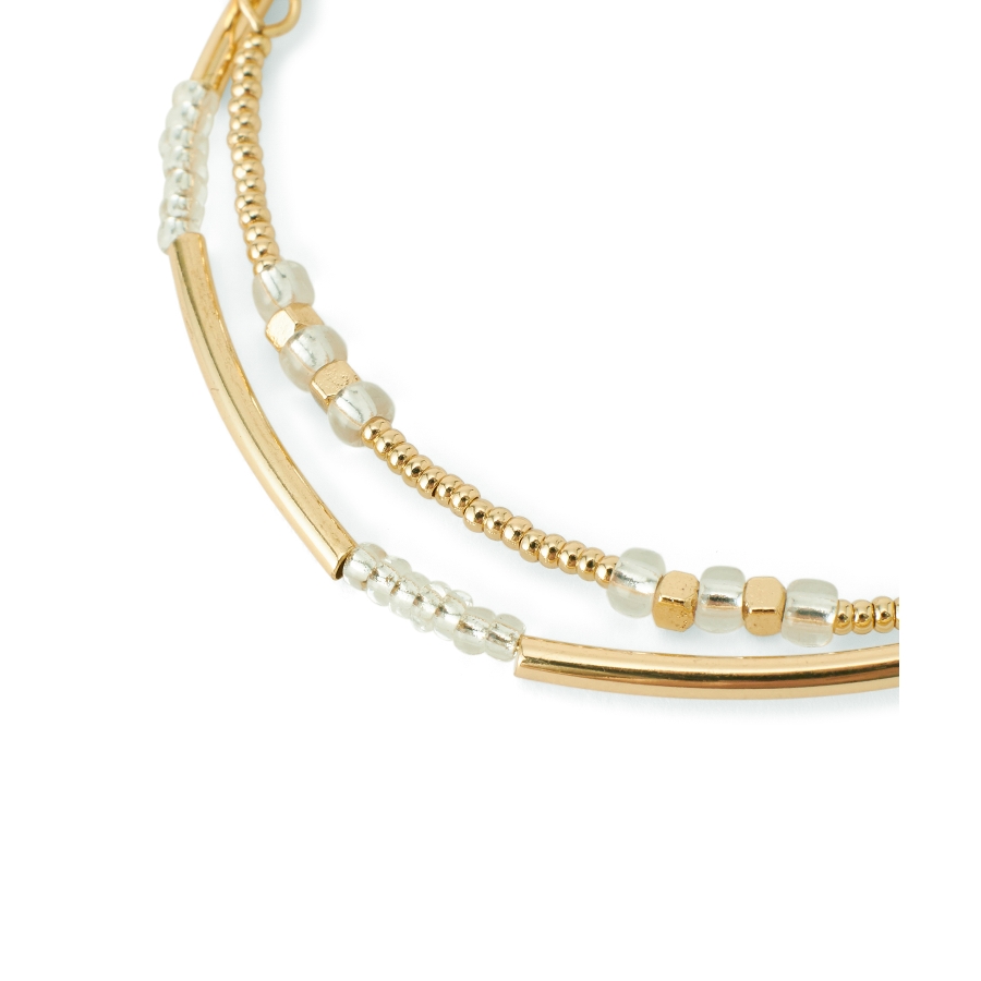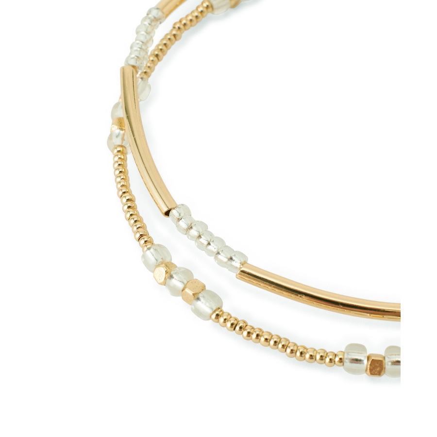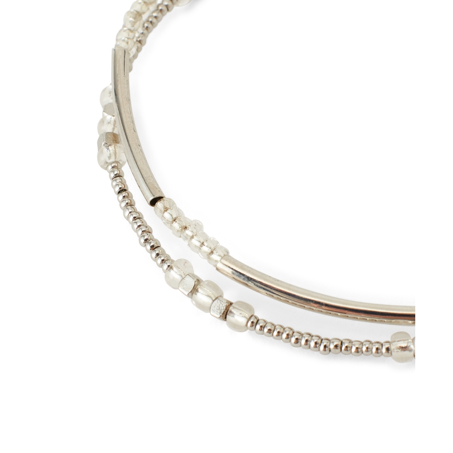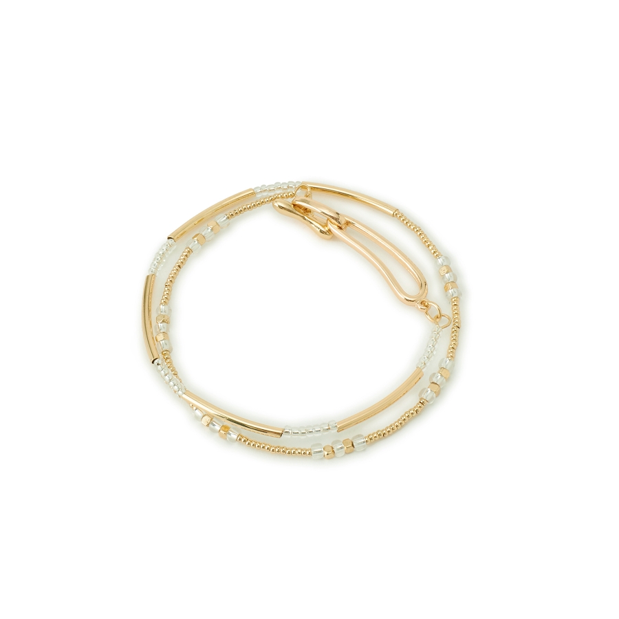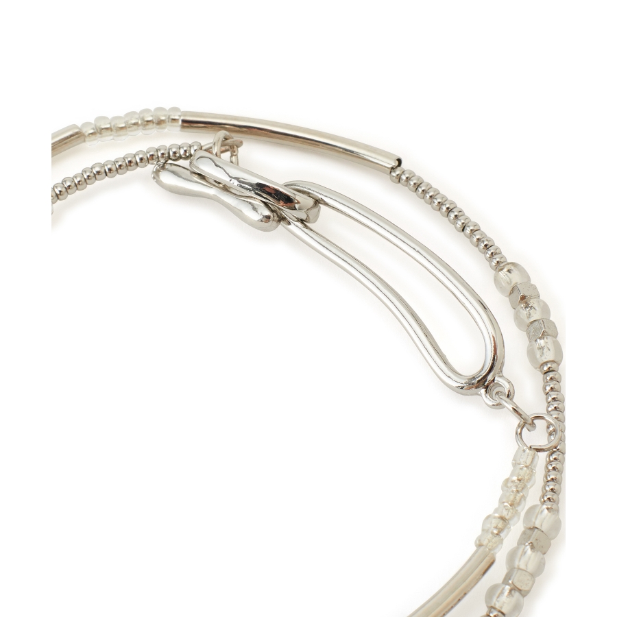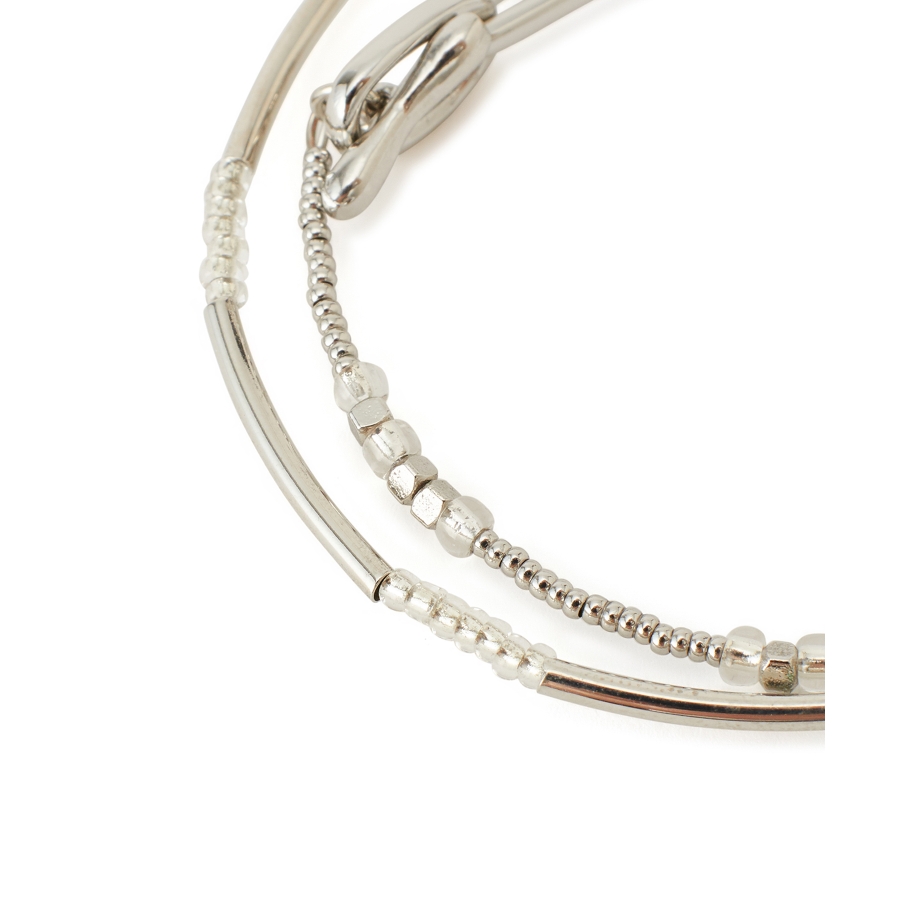 【デザイン・シルエット】 ・着脱がしやすい、ワイヤー式の2連ブレスレット。 ・きらめくマンテルパーツをあしらった華やかなデザイン。 【カラー】 ・ゴールド、シルバーの2色展開。 【スタイリングポイント】 ・手持ちの腕時計と重ねつけを楽しむのも◎。 ・オンオフ兼用でき、合わせるスタイルを選ばないアイテム。 ※撮影時の光、お使いのモニター環境によって色の見え方が違う場合がございます。