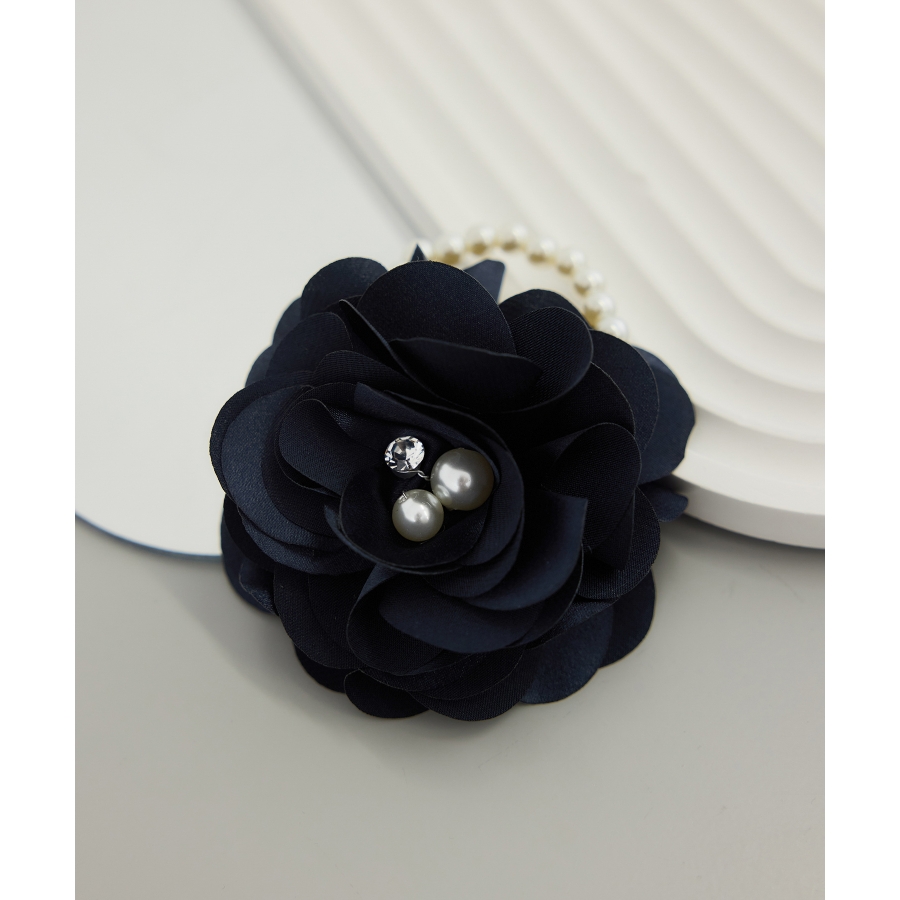 ・サテン素材の花びらを重ねた、立体感のあるフラワーデザイン。