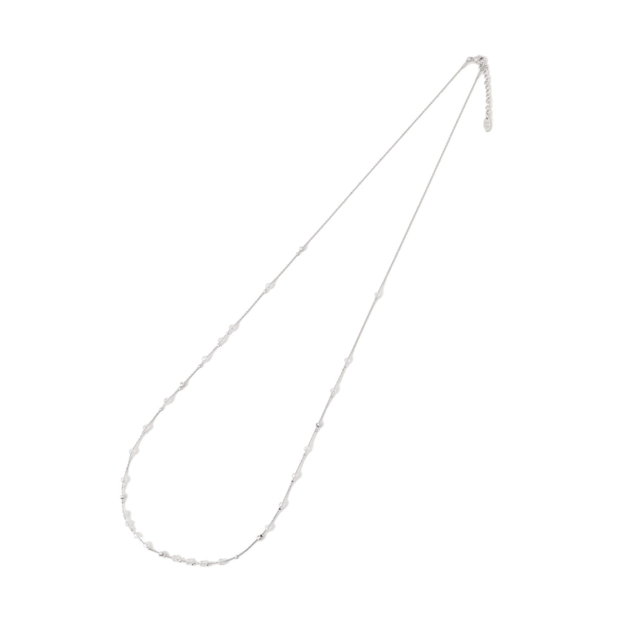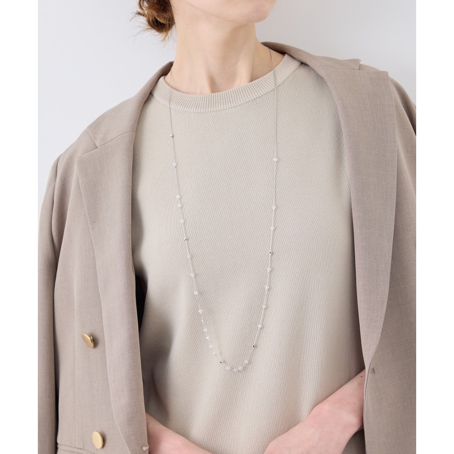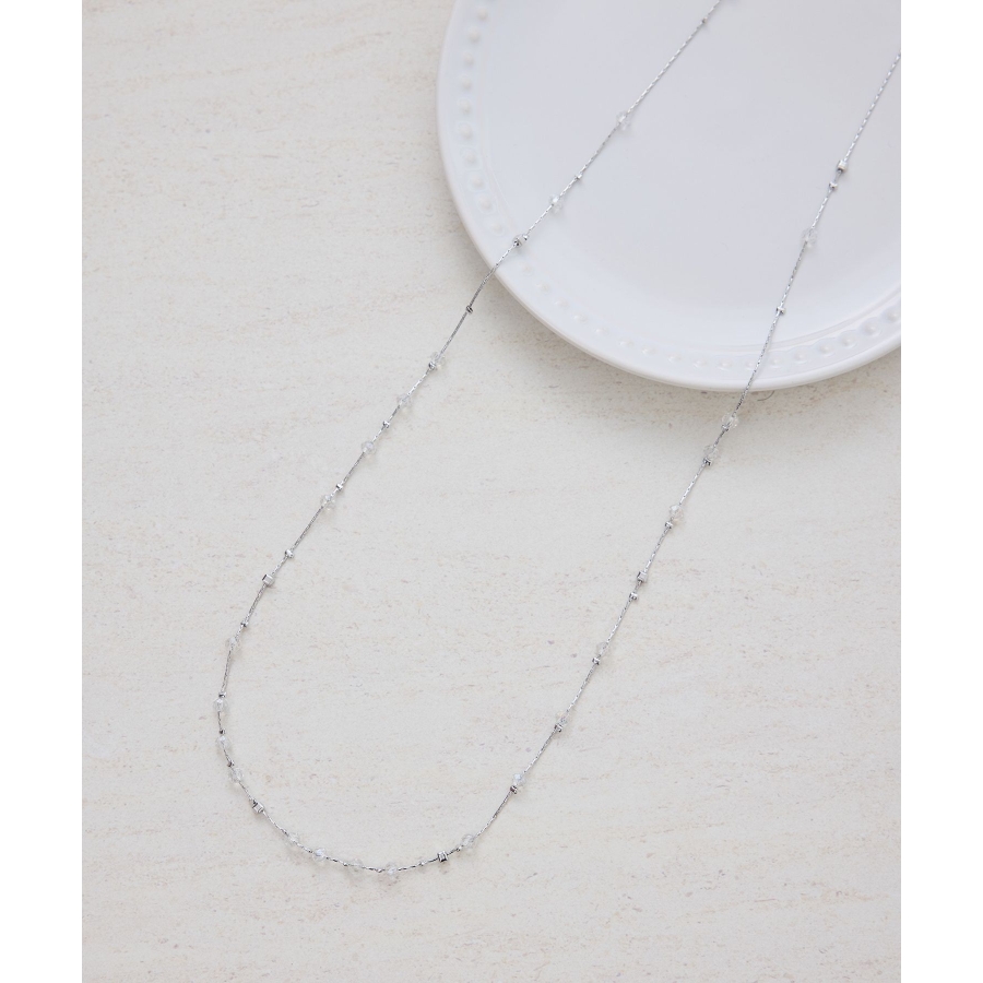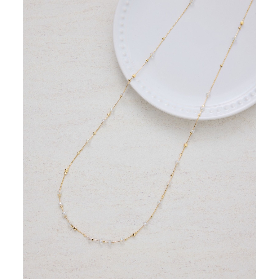 【デザイン・シルエット】 ・ミディアムレングスのチェーンネックレス。 ・リズミカルに配したクリアビーズが軽やかなアクセント。 【カラー】 ・ゴールド、シルバーの2色展開。 【スタイリングポイント】 ・ボーダーや花柄など、柄物トップスにも馴染むデザイン。 ・シンプルなカットソーにはワンポイントで取り入れて。 ・オフィススタイルでも浮かない上品さ。 ※撮影時の光、お使いのモニター環境によって色の見え方が違う場合がございます。