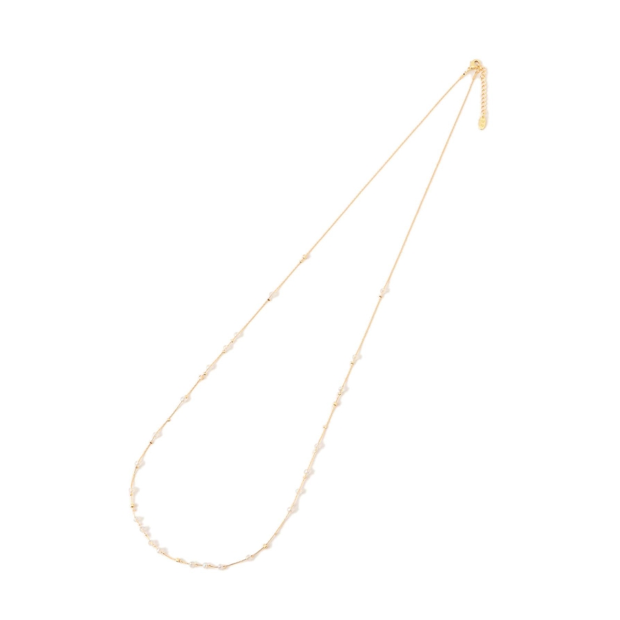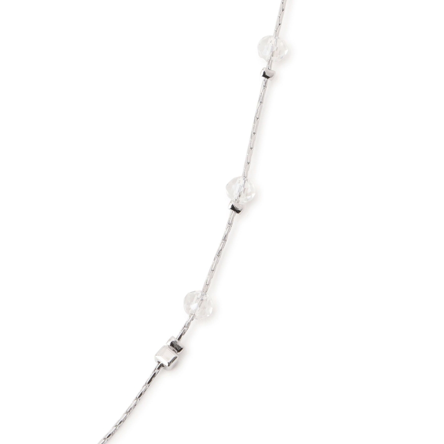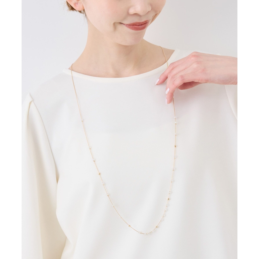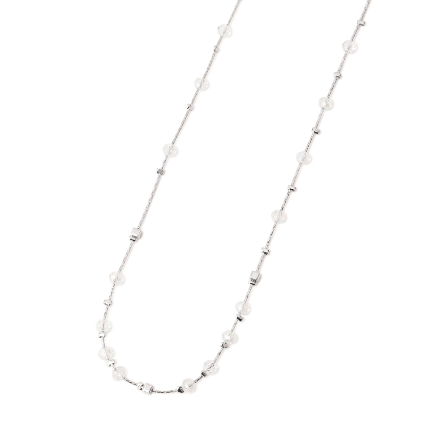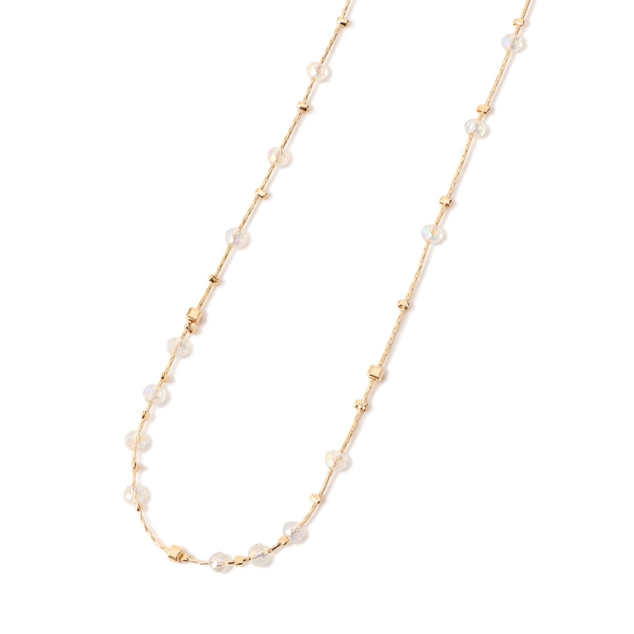 【デザイン・シルエット】 ・ミディアムレングスのチェーンネックレス。 ・リズミカルに配したクリアビーズが軽やかなアクセント。 【カラー】 ・ゴールド、シルバーの2色展開。 【スタイリングポイント】 ・ボーダーや花柄など、柄物トップスにも馴染むデザイン。 ・シンプルなカットソーにはワンポイントで取り入れて。 ・オフィススタイルでも浮かない上品さ。 ※撮影時の光、お使いのモニター環境によって色の見え方が違う場合がございます。