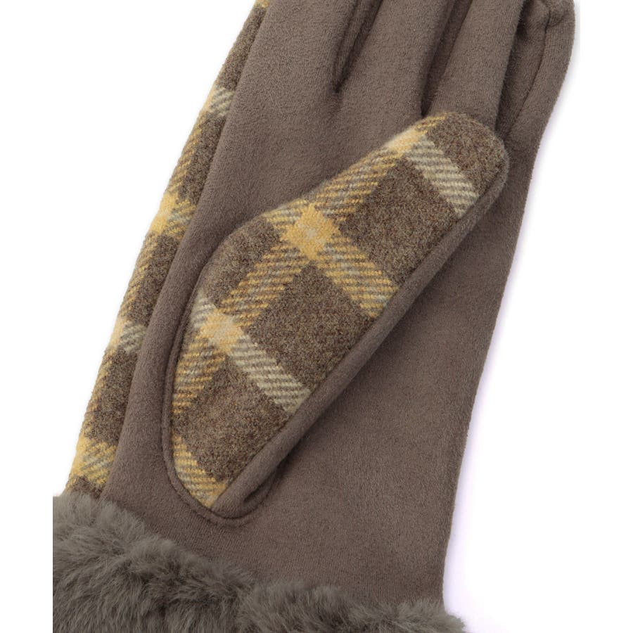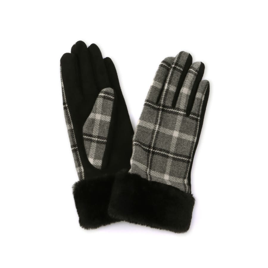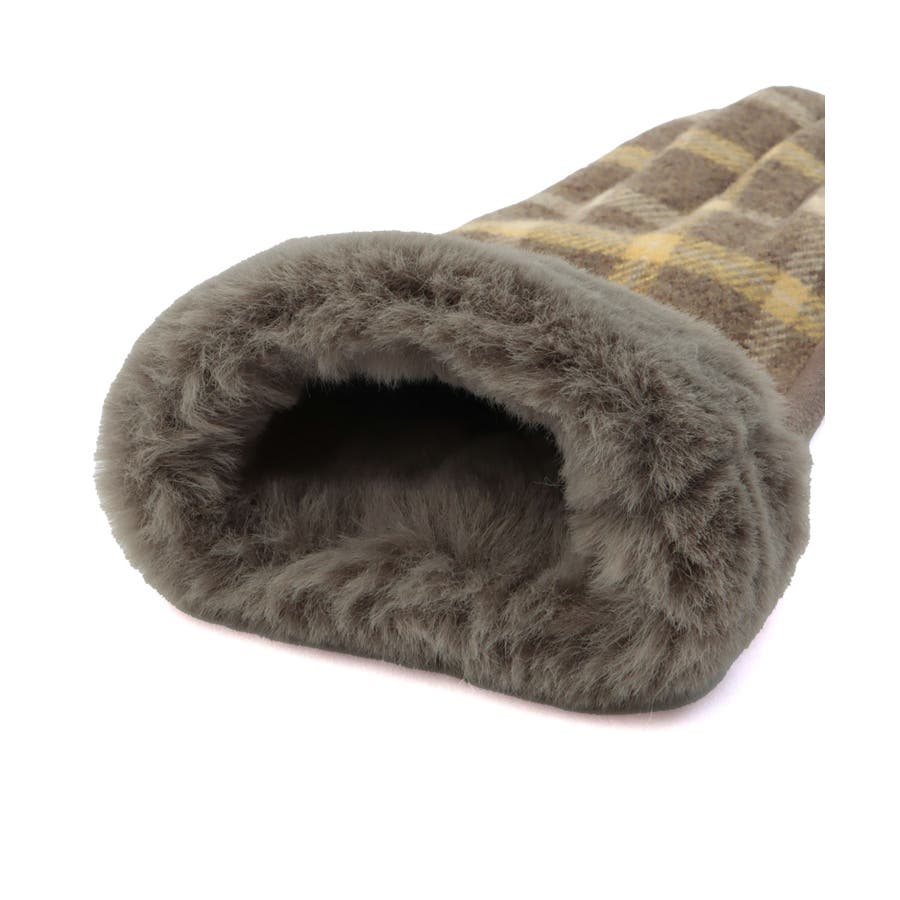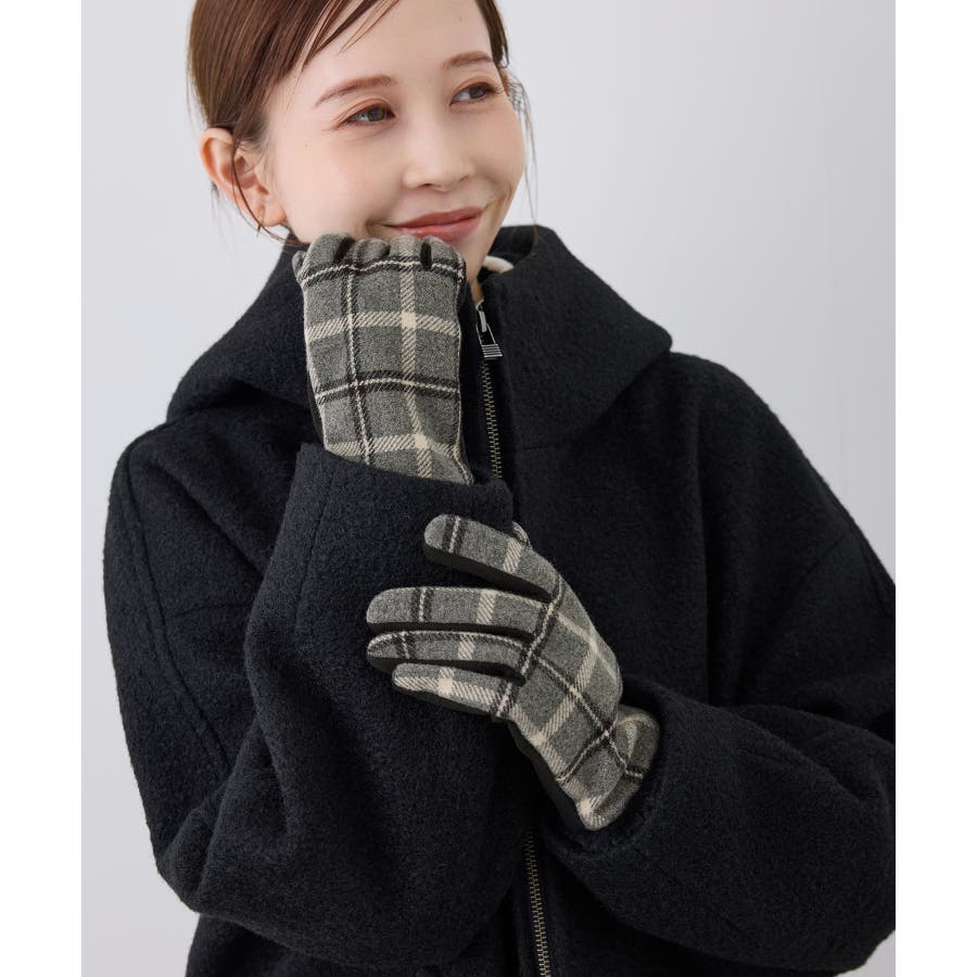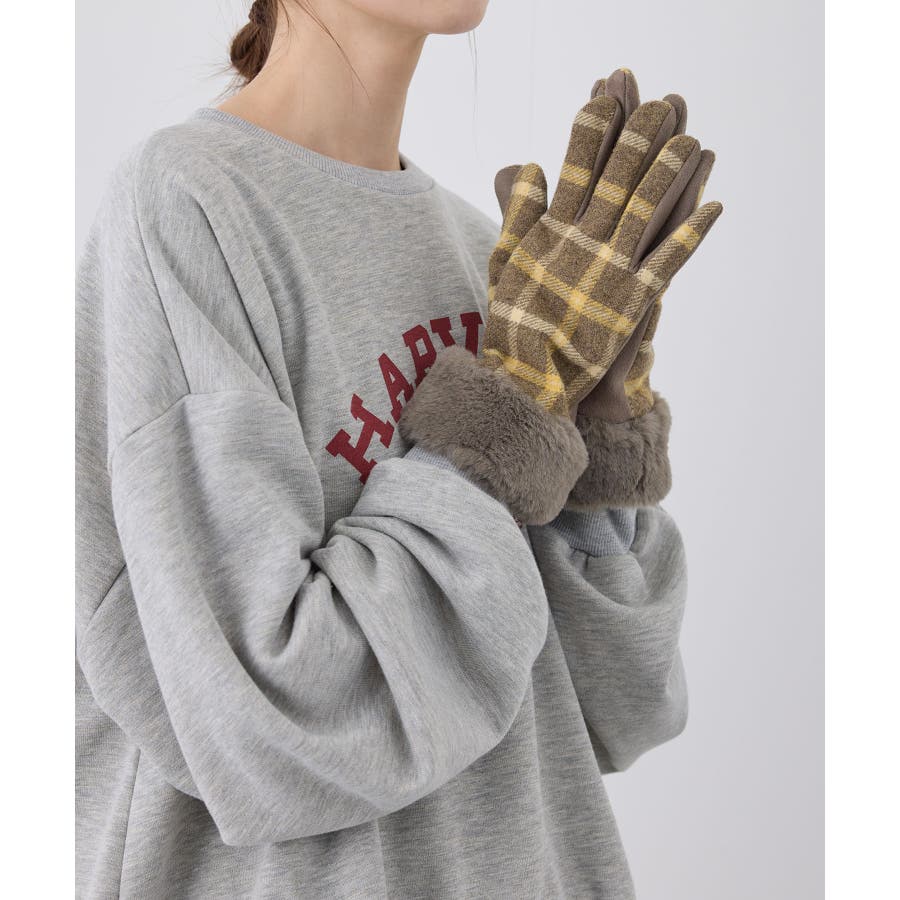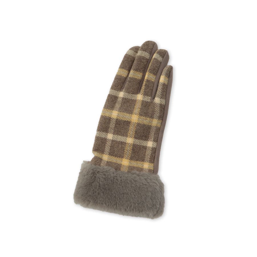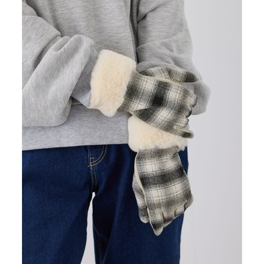 【デザイン・シルエット】 ・チェック柄と無地を組み合わせた、デザイン性のあるグローブ。 ・手首まわりはフェイクファーを飾って華やかにフィニッシュ。 ・チェック柄はカラーごとに色とパターンが異なるアソート展開。 【カラー】 ・カラーによって組成の混率が異なります。 ブラック(01)ベージュ系(28):(甲部)ポリエステル 57% レーヨン 28% アクリル 15% (掌部)ポリエステル 88% ポリウレタン 12% (ファー部分)ポリエステル 100% キナリ系(17):(甲部)ポリエステル 92% レーヨン 4% アクリル 4% (掌部)ポリエステル 88% ポリウレタン 12% (ファー部分)ポリエステル 100% 【スタイリングポイント】 ・シンプルになりやすい冬のコートスタイルのアクセントにぴったり。 ・カジュアルなアウトドアコーデにプラスしてもグッド。 ※撮影時の光、お使いのモニター環境によって色の見え方が違う場合がございます。