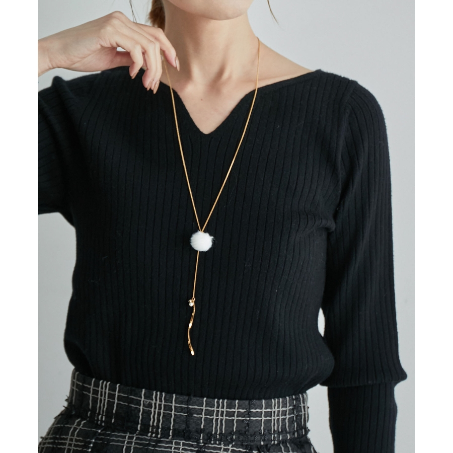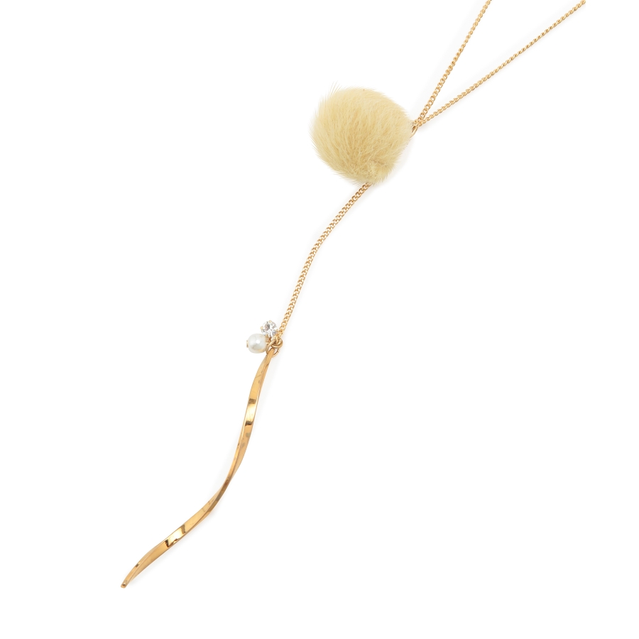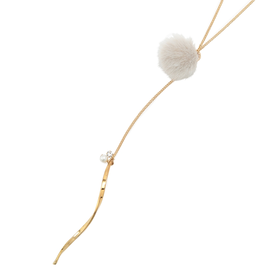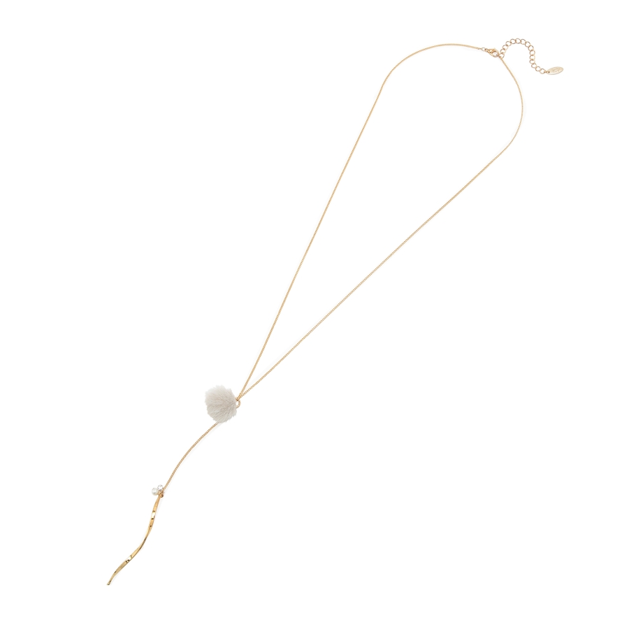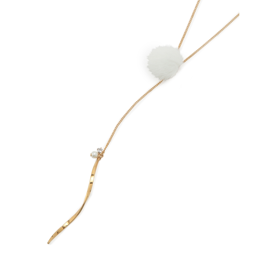 【デザイン・シルエット】 ・繊細なチェーンを用いたY字デザインネックレス。 ・フェイクファーのポンポンで季節感のある仕上がりに。 ・先端にあしらった、ツイストしたメタルバーもポイント。 ・同シリーズでピアス(品番:GIZ73220)も展開。 【カラー】 ・ライトグレー、アイボリー、サックスブルー、イエローの4色展開。 【スタイリングポイント】 ・ボートネックトップスやハイネックニットなど、ネックが詰まったウェアに重ねると好バランスに。 ※撮影時の光、お使いのモニター環境によって色の見え方が違う場合がございます。