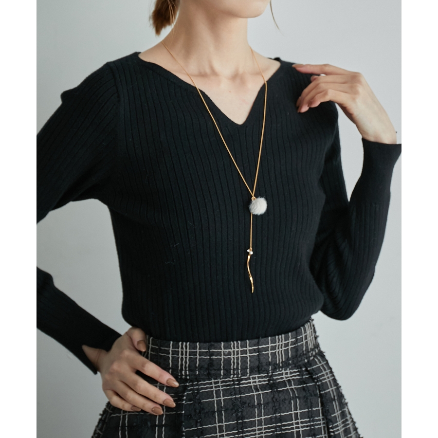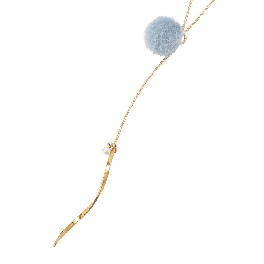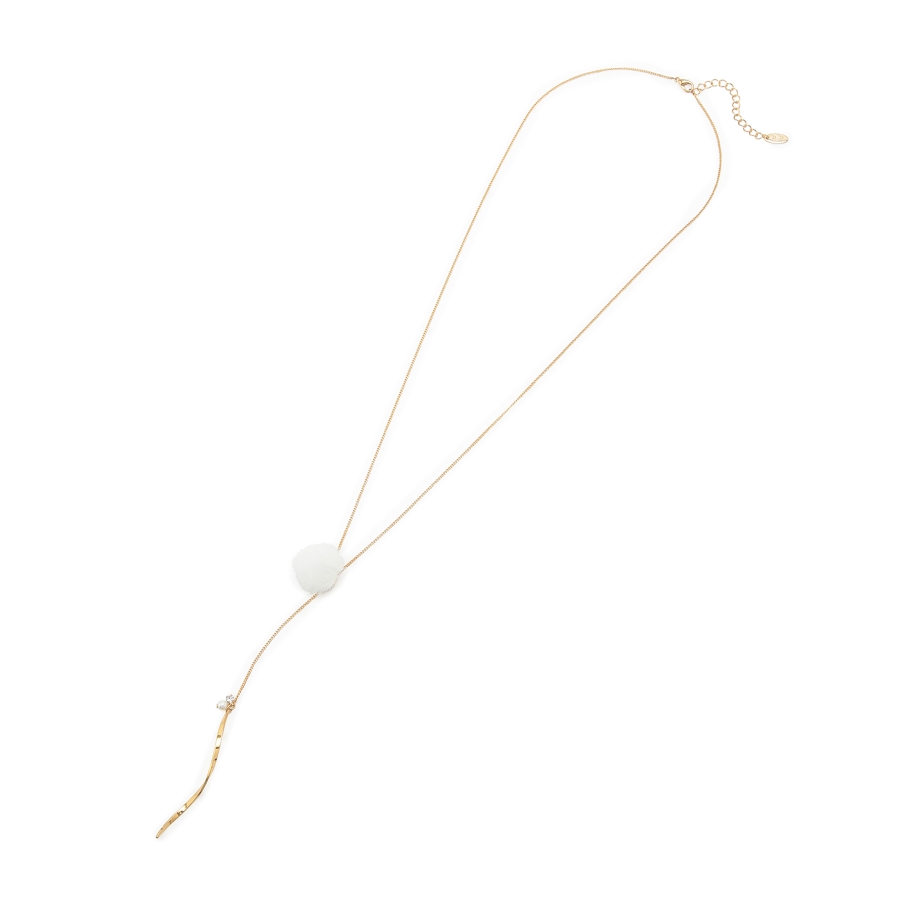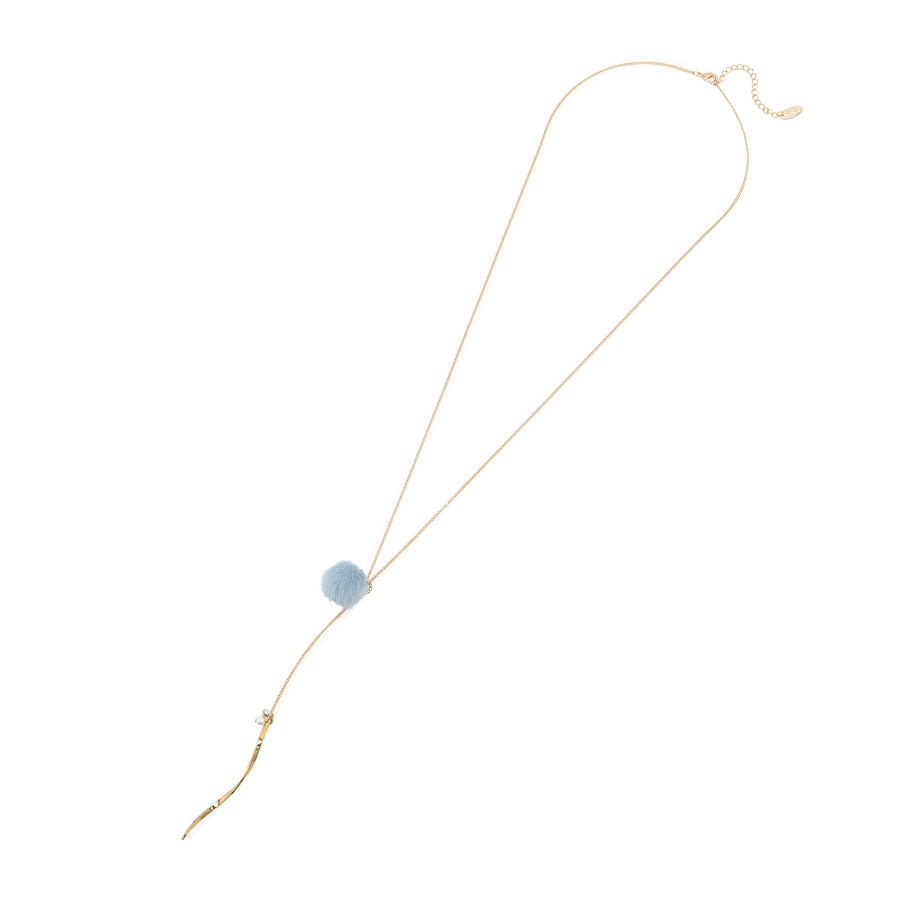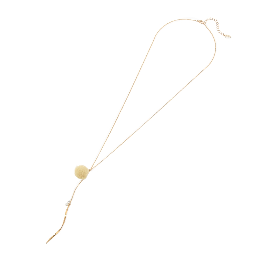 【デザイン・シルエット】 ・繊細なチェーンを用いたY字デザインネックレス。 ・フェイクファーのポンポンで季節感のある仕上がりに。 ・先端にあしらった、ツイストしたメタルバーもポイント。 ・同シリーズでピアス(品番:GIZ73220)も展開。 【カラー】 ・ライトグレー、アイボリー、サックスブルー、イエローの4色展開。 【スタイリングポイント】 ・ボートネックトップスやハイネックニットなど、ネックが詰まったウェアに重ねると好バランスに。 ※撮影時の光、お使いのモニター環境によって色の見え方が違う場合がございます。