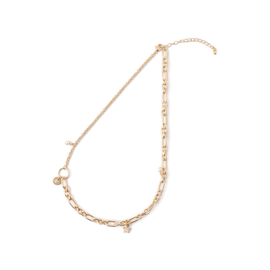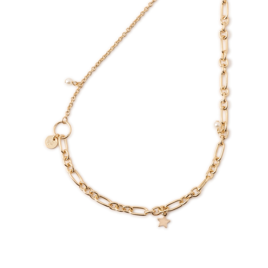 ・小さな星やコイン風モチーフ、さりげないパール調ビーズなど、複数のチャームをリズミカルに配置。