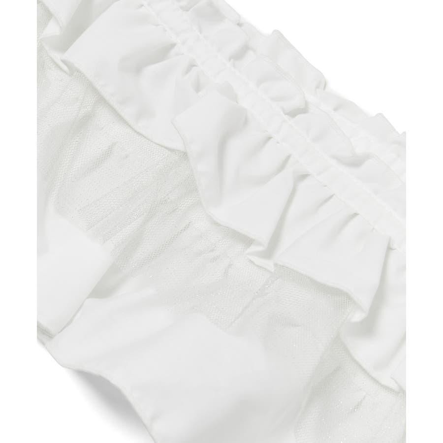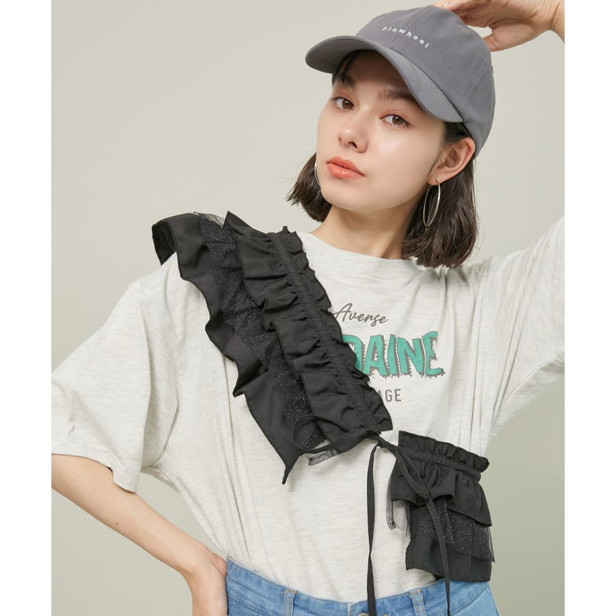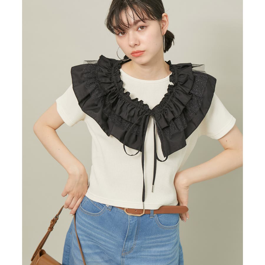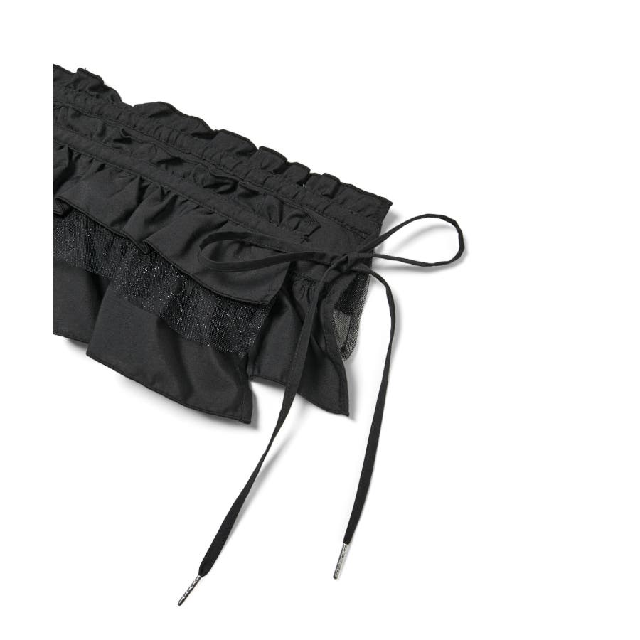 【素材感】 ・3枚重ねで贅沢に生地を使用したボリューミーなフリルビスチェ。 【デザイン・シルエット】 ・レイヤードアイテムとして、いつもの着こなしにプラスして手軽なアレンジが可能。 ・布端始末はメローで軽く、リボン巾も華奢に。 ・リボンをきゅっと絞るとお好みのギャザー感に調節可能。 ・2段目に挟んだラメチュールがポイント。 【カラー】 ・ブラック、ホワイトのモノトーン2色展開。 【スタイリングポイント】 ・トレンドのたすき掛けや、胸元に巻いてビスチェ風、首元に巻いてつけ衿風とマルチに使える。 ・同シリーズでKIDS(品番:GRM24110)も展開しているので、親子お揃いもおすすめ。 ※撮影時の光、お使いのモニター環境によって色の見え方が違う場合がございます。 ※モデル身長:166cm 着用サイズ:38