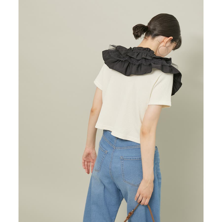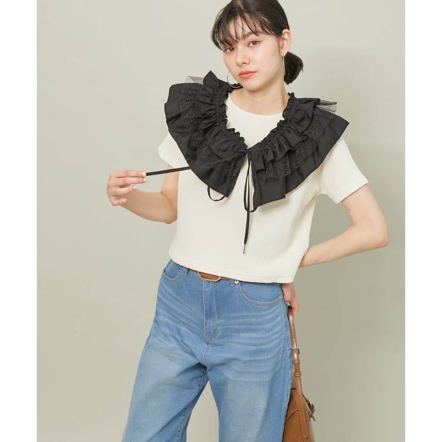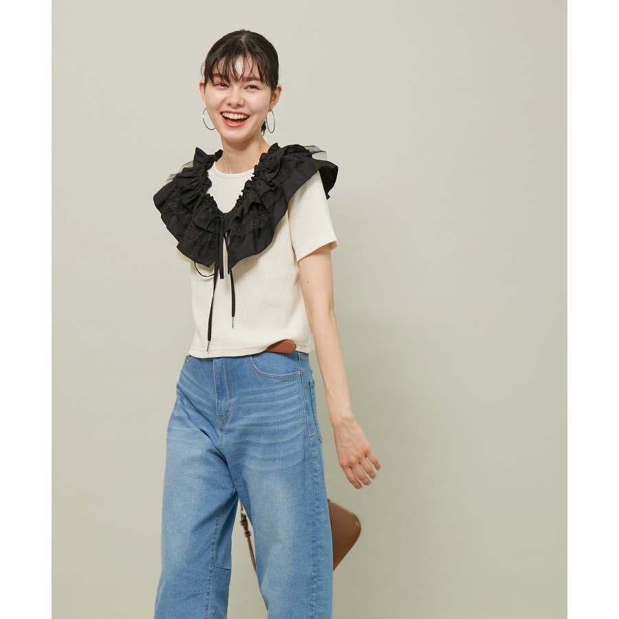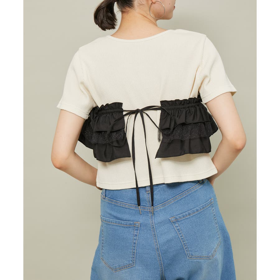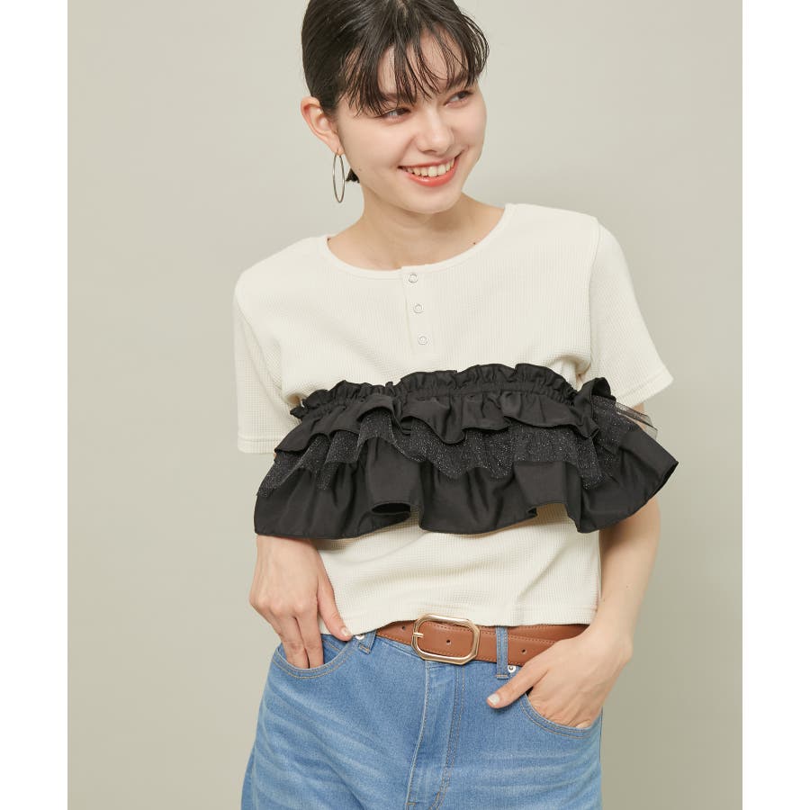 【素材感】 ・3枚重ねで贅沢に生地を使用したボリューミーなフリルビスチェ。 【デザイン・シルエット】 ・レイヤードアイテムとして、いつもの着こなしにプラスして手軽なアレンジが可能。 ・布端始末はメローで軽く、リボン巾も華奢に。 ・リボンをきゅっと絞るとお好みのギャザー感に調節可能。 ・2段目に挟んだラメチュールがポイント。 【カラー】 ・ブラック、ホワイトのモノトーン2色展開。 【スタイリングポイント】 ・トレンドのたすき掛けや、胸元に巻いてビスチェ風、首元に巻いてつけ衿風とマルチに使える。 ・同シリーズでKIDS(品番:GRM24110)も展開しているので、親子お揃いもおすすめ。 ※撮影時の光、お使いのモニター環境によって色の見え方が違う場合がございます。 ※モデル身長:166cm 着用サイズ:38
