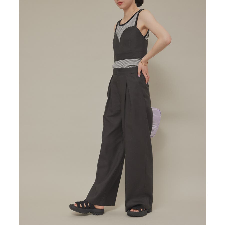 【素材感】 ・清涼感と程よいカジュアル感のある麻混素材を使用したセットアップ。 ・天然素材のナチュラルなシワ感も楽しめる。 【デザイン・シルエット】 ・キャミソール型ビスチェと、タックパンツのセットアップ。 ・ビスチェはバックスタイルのギャザーですっきりフィット。 ・パンツはタック入りのワイドシルエットで大人な仕上がりに。 ・それぞれ単品でも着回し力のあるアイテム。 【カラー】 ・チャコールグレー、アイボリーの合わせやすい2色を展開。 【スタイリングポイント】 ・春先はカーディガンやパーカ、ジャケットを羽織って取り入れて。 ・ビスチェは、カットソーとのレイヤードもおすすめ。 ・パンツはシンプルで、オンオフ問わず活躍。 ----------------------------- 裏地:ビスチェはあり、パンツはキナリ(16)のみあり、チャコール(06)はなし 透け感:なし 伸縮性:なし 生地感・厚さ:普通 ポケット:ビスチェはなし、パンツはあり ウエスト:後ろゴム その他仕様:ビスチェはファスナーあり・後ろシャーリング・肩紐調節可能 季節:春~秋 ----------------------------- ※撮影時の光、お使いのモニター環境によって色の見え方が違う場合がございます。 ※モデル身長:166cm 着用サイズ:38