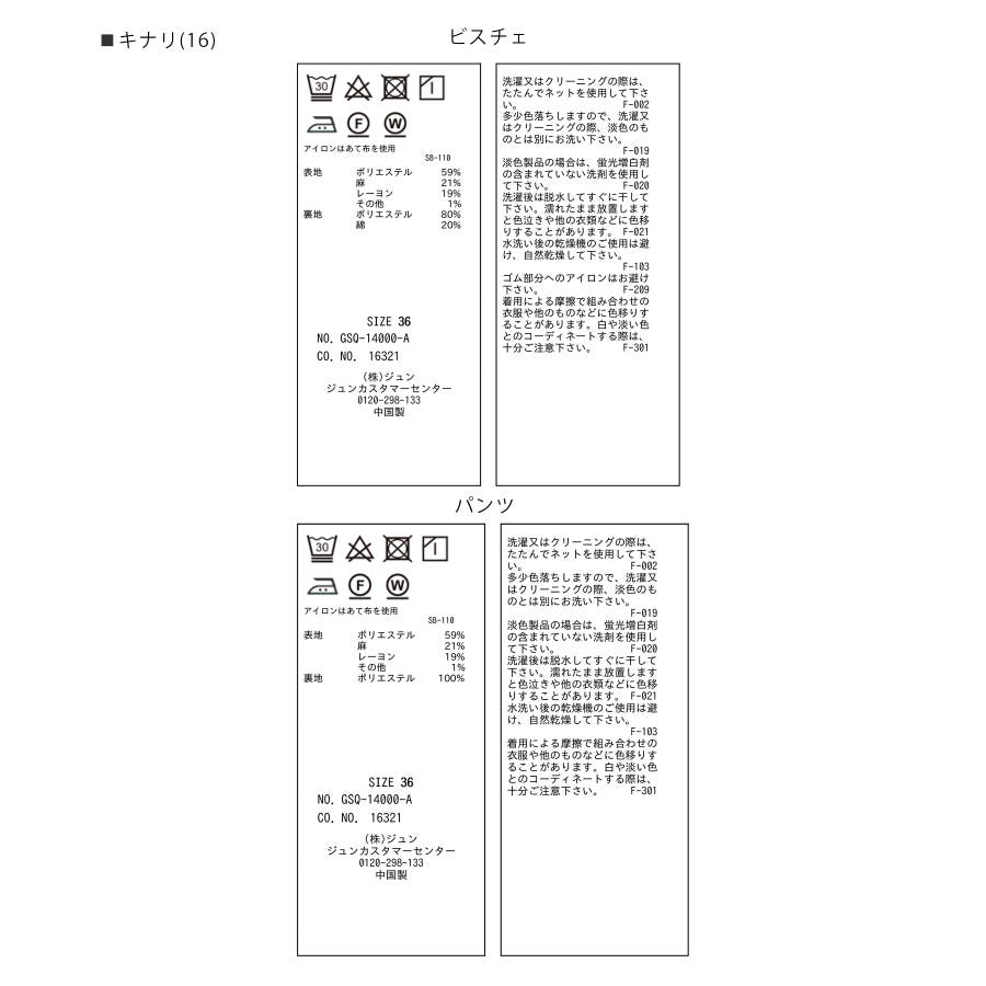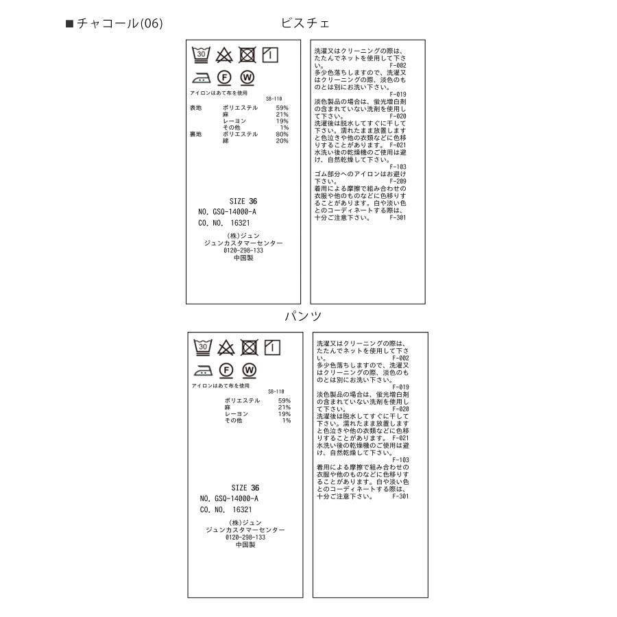 | 素材 | チャコール(06):(ビスチェ) (表地) ポリエステル 59% 麻 21% レーヨン 19% その他 1% (裏地) ポリエステル 80% 綿 20% (パンツ) ポリエステル 59% 麻 21% レーヨン 19% その他 1%|キナリ(16):(ビスチェ) (表地) ポリエステル 59% 麻 21% レーヨン 19% その他 1% (裏地) ポリエステル 80% 綿 20% (パンツ) (表地) ポリエステル 59% 麻 21% レーヨン 19% その他 1% (裏地) ポリエステル 100% |