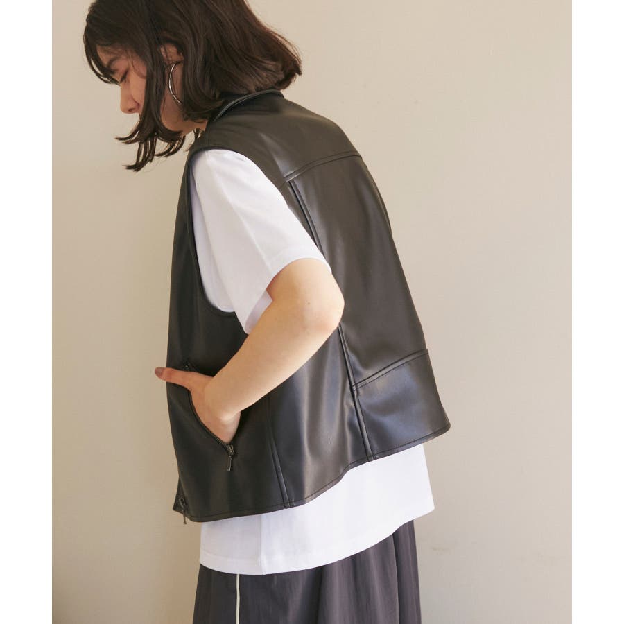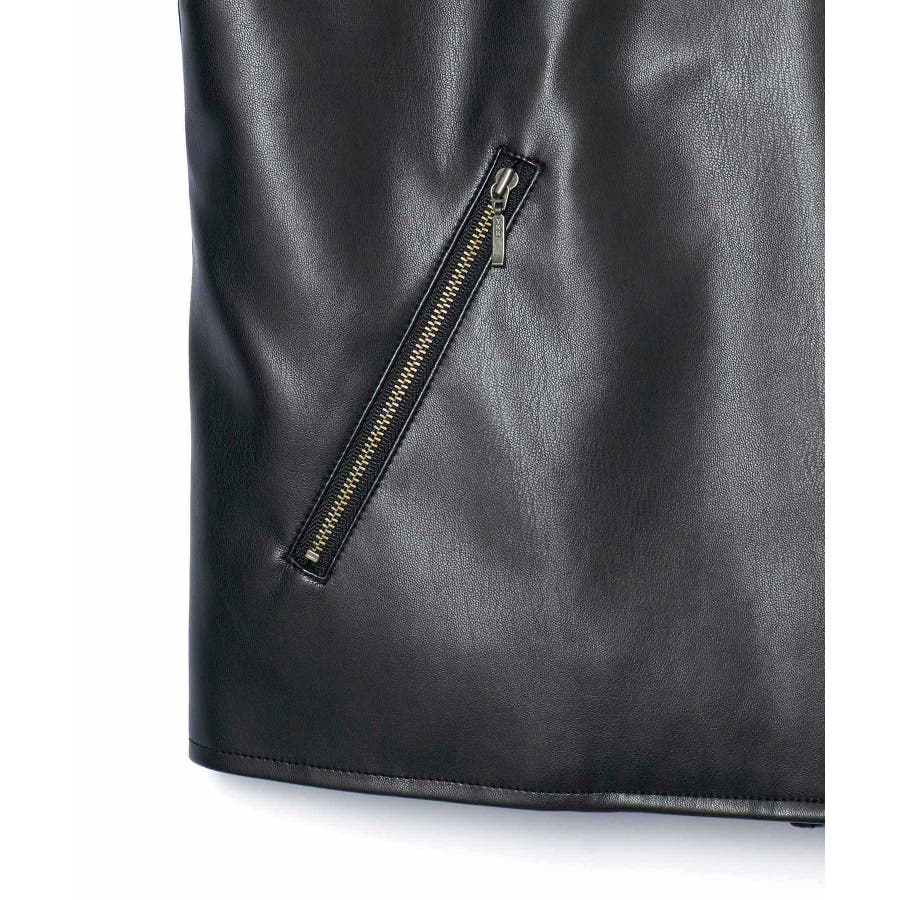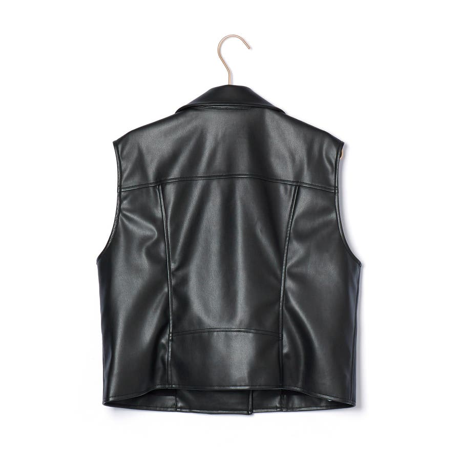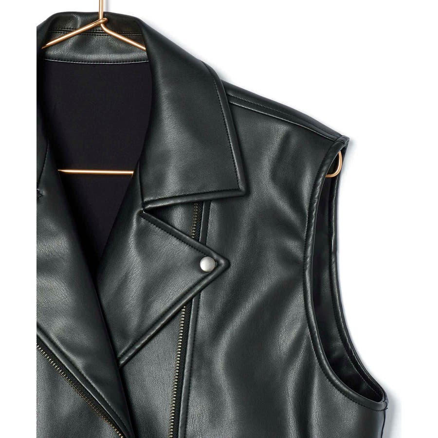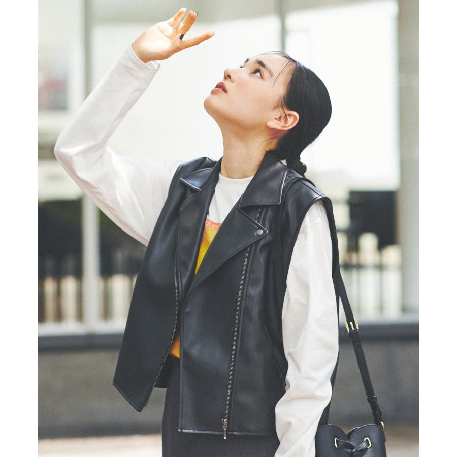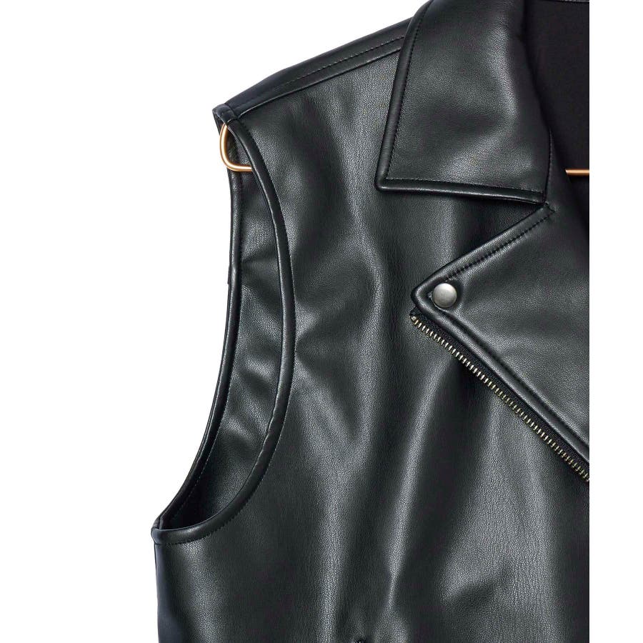 【素材感】 ・ナチュラルなツヤ感と柔らかさのフェイクレザーノースリーブジャケット。 【デザイン・シルエット】 ・ライダースジャケットのデザインを取り入れた、ハードテイストの一着。 ・ジレと同じ感覚で手軽に取り入れられる。 【カラー】 ・ブラックのみの展開。 【スタイリングポイント】 ・パーカーの上から重ねてデイリーの気楽なスタイルに。 ・フェミニンなワンピースに重ねるのも意外性があっておすすめ。 ・秋の立ち上がりは、半袖Tシャツに重ねるとグッド。 ----------------------------- 裏地:あり 透け感:なし 伸縮性:なし 生地感・厚さやや:厚手 ポケット:あり 季節:秋~春 ----------------------------- ※撮影時の光、お使いのモニター環境によって色の見え方が違う場 ※モデル身長:165cm 着用サイズ:38