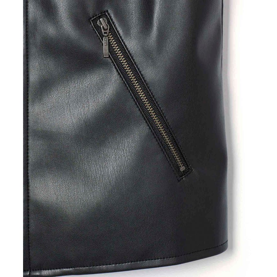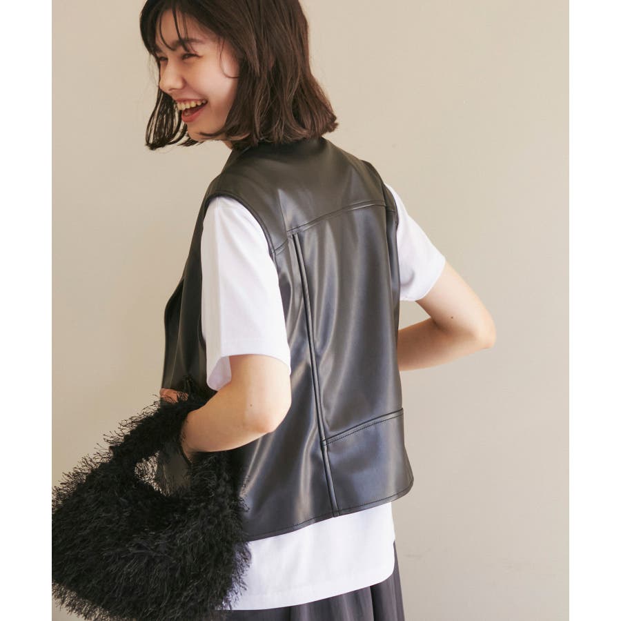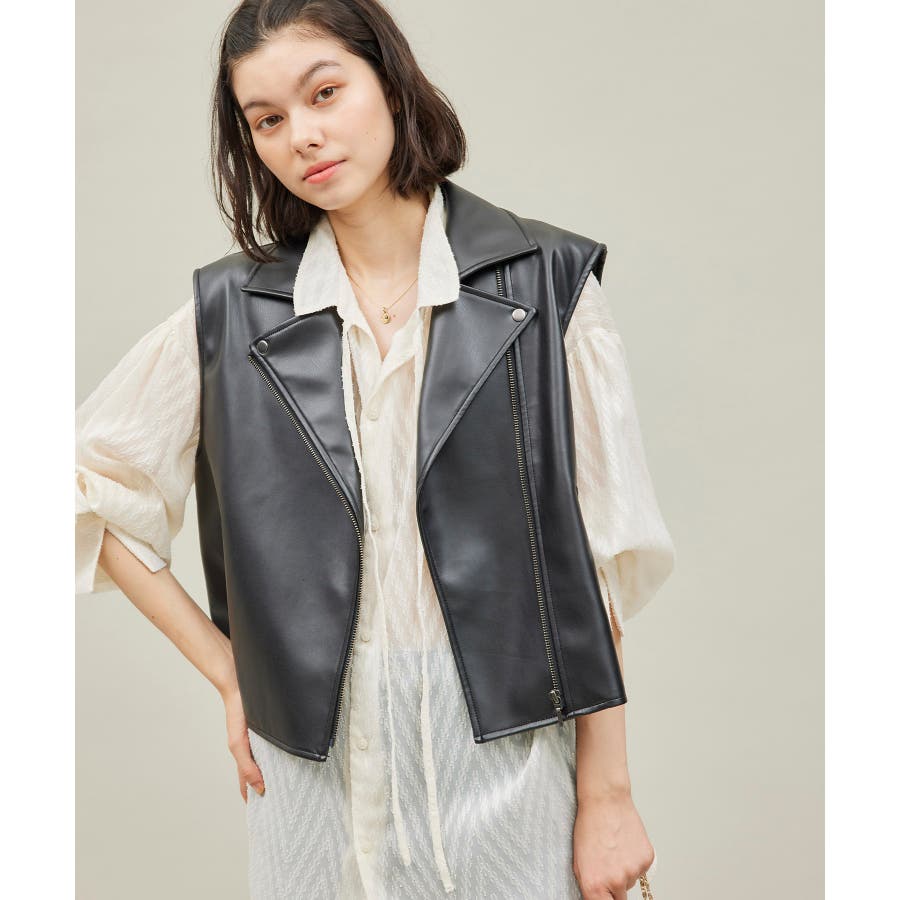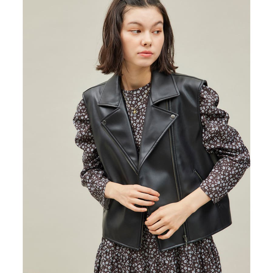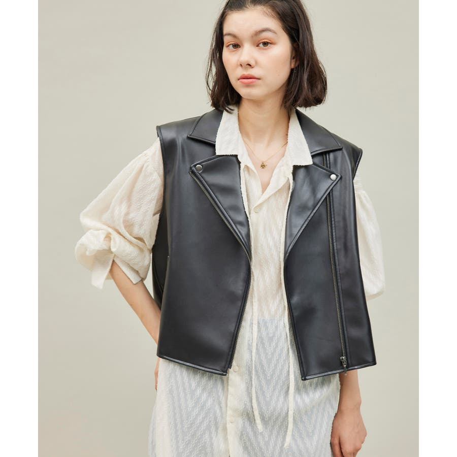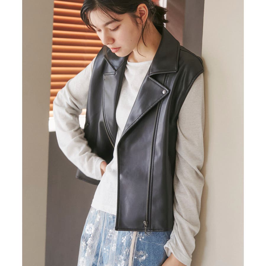 【素材感】 ・ナチュラルなツヤ感と柔らかさのフェイクレザーノースリーブジャケット。 【デザイン・シルエット】 ・ライダースジャケットのデザインを取り入れた、ハードテイストの一着。 ・ジレと同じ感覚で手軽に取り入れられる。 【カラー】 ・ブラックのみの展開。 【スタイリングポイント】 ・パーカーの上から重ねてデイリーの気楽なスタイルに。 ・フェミニンなワンピースに重ねるのも意外性があっておすすめ。 ・秋の立ち上がりは、半袖Tシャツに重ねるとグッド。 ----------------------------- 裏地:あり 透け感:なし 伸縮性:なし 生地感・厚さやや:厚手 ポケット:あり 季節:秋~春 ----------------------------- ※撮影時の光、お使いのモニター環境によって色の見え方が違う場 ※モデル身長:165cm 着用サイズ:38