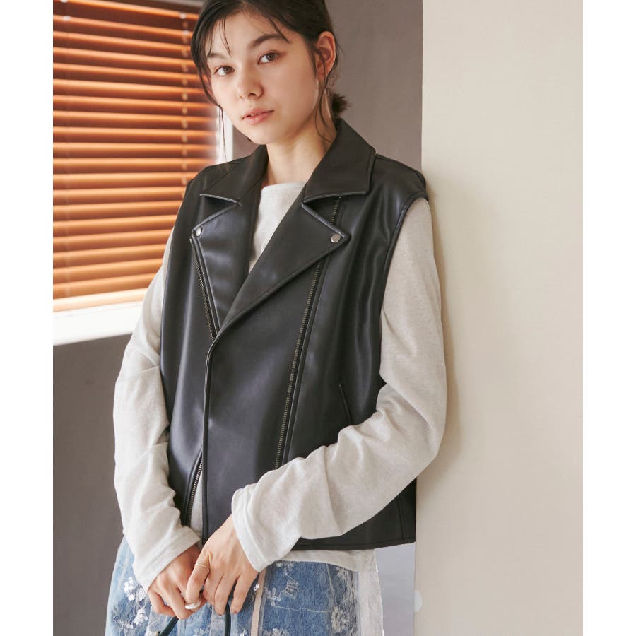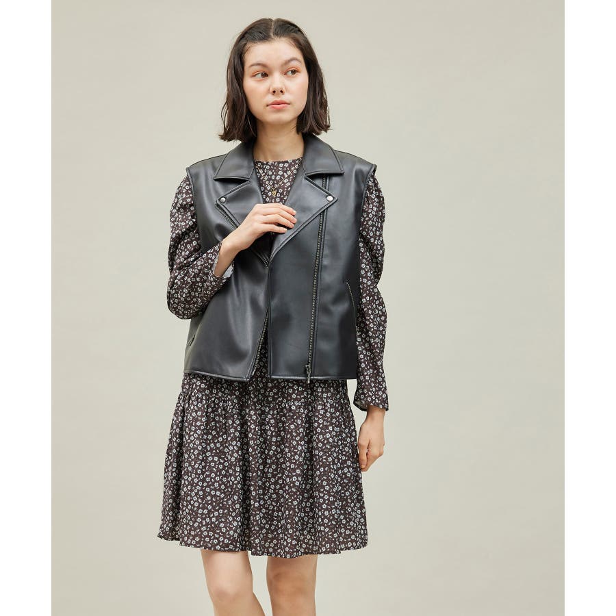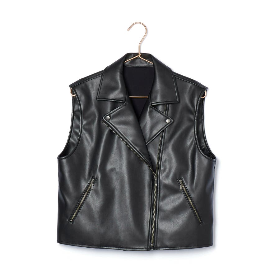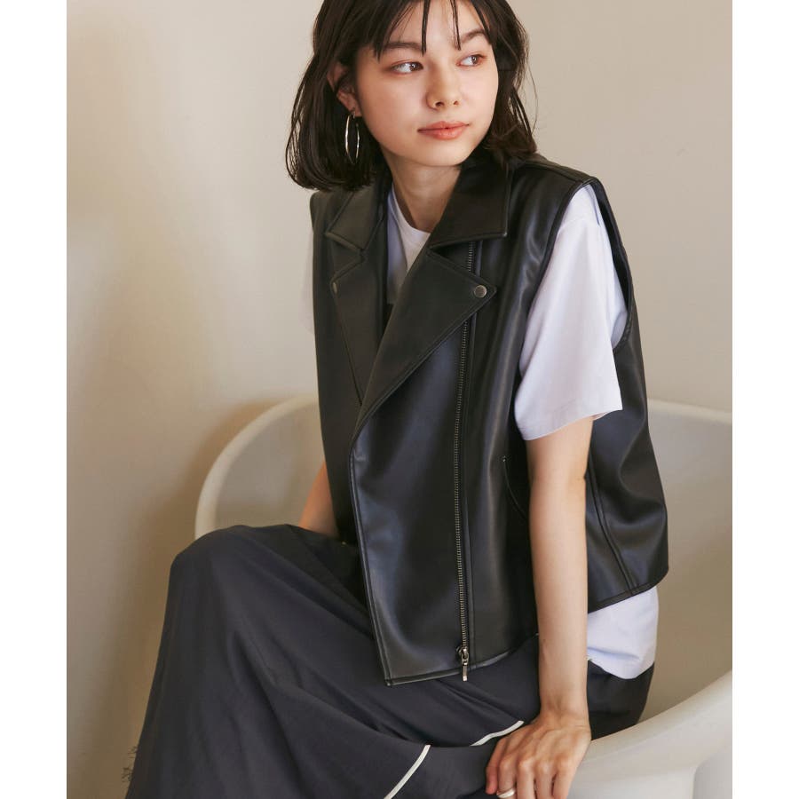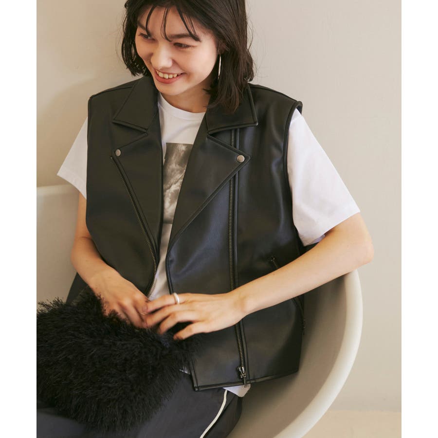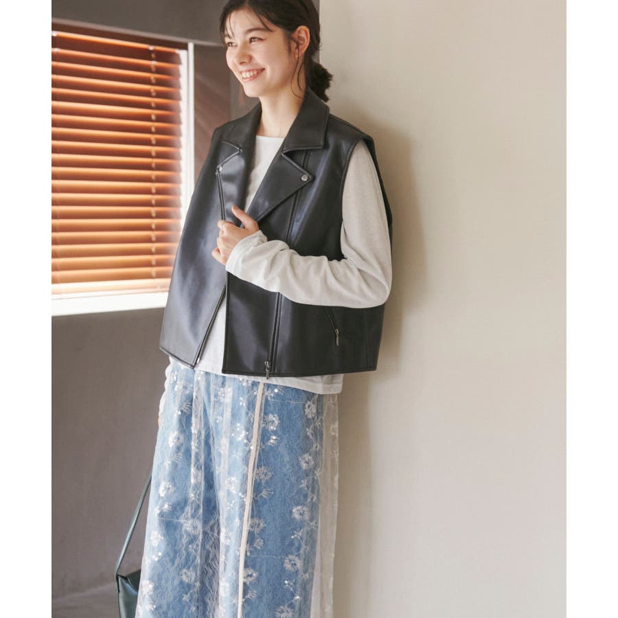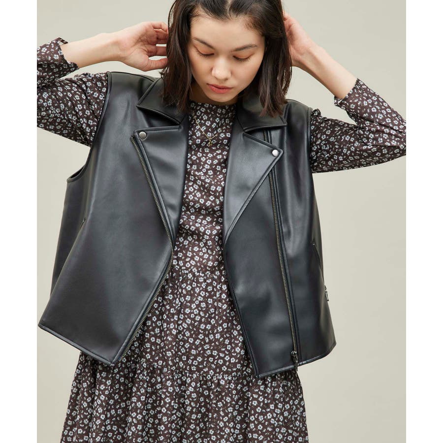 【素材感】 ・ナチュラルなツヤ感と柔らかさのフェイクレザーノースリーブジャケット。 【デザイン・シルエット】 ・ライダースジャケットのデザインを取り入れた、ハードテイストの一着。 ・ジレと同じ感覚で手軽に取り入れられる。 【カラー】 ・ブラックのみの展開。 【スタイリングポイント】 ・パーカーの上から重ねてデイリーの気楽なスタイルに。 ・フェミニンなワンピースに重ねるのも意外性があっておすすめ。 ・秋の立ち上がりは、半袖Tシャツに重ねるとグッド。 ----------------------------- 裏地:あり 透け感:なし 伸縮性:なし 生地感・厚さやや:厚手 ポケット:あり 季節:秋~春 ----------------------------- ※撮影時の光、お使いのモニター環境によって色の見え方が違う場 ※モデル身長:165cm 着用サイズ:38