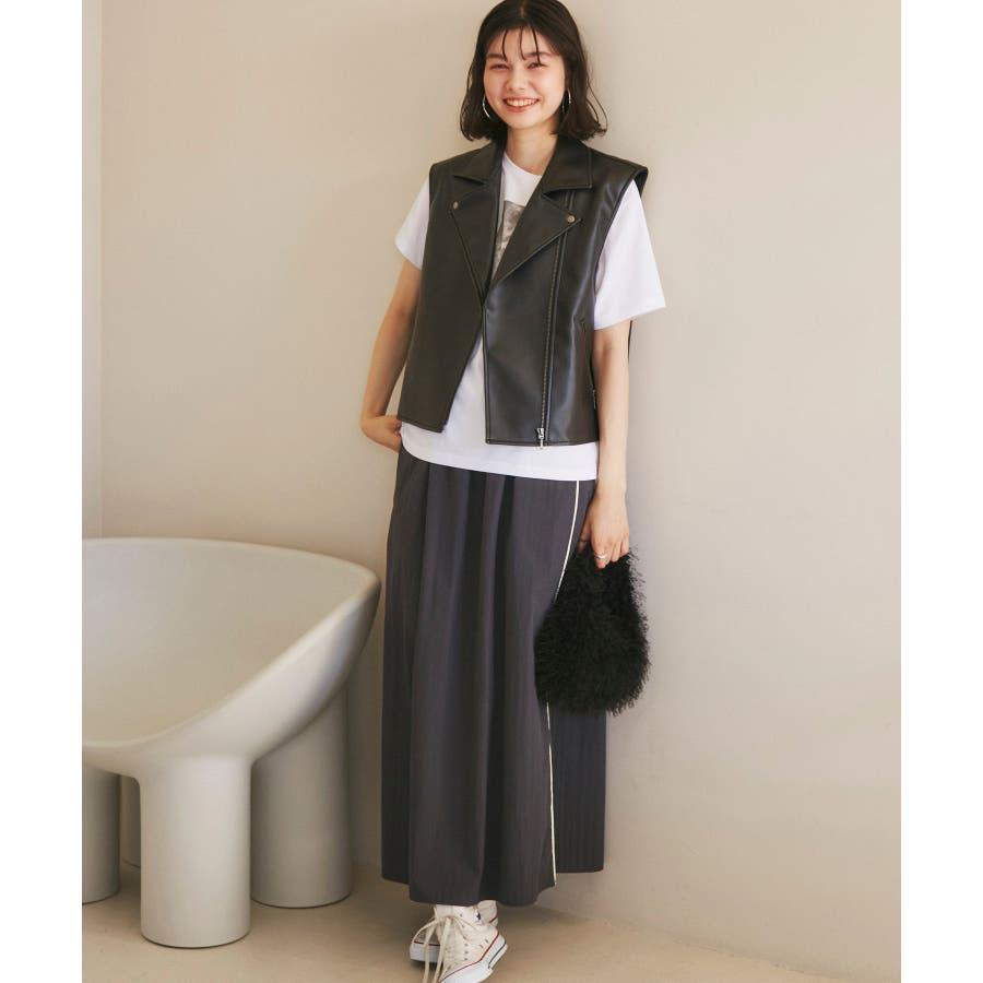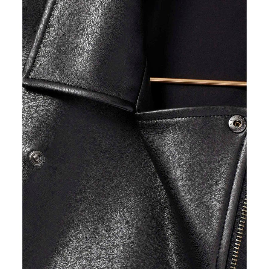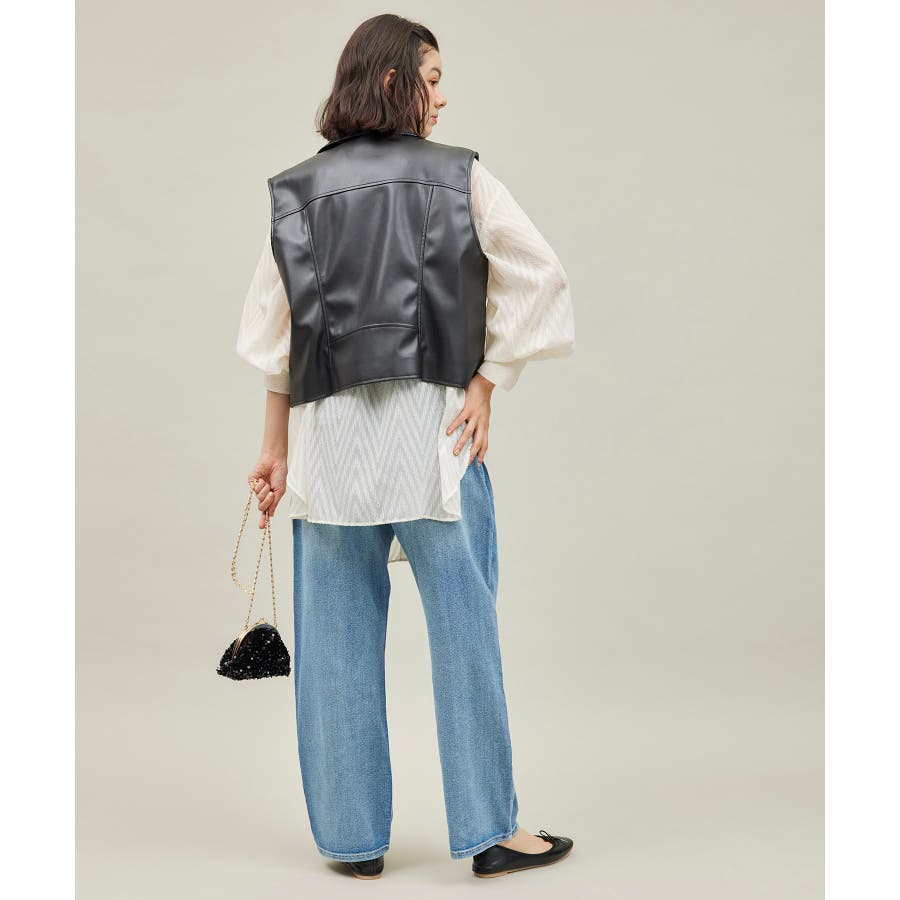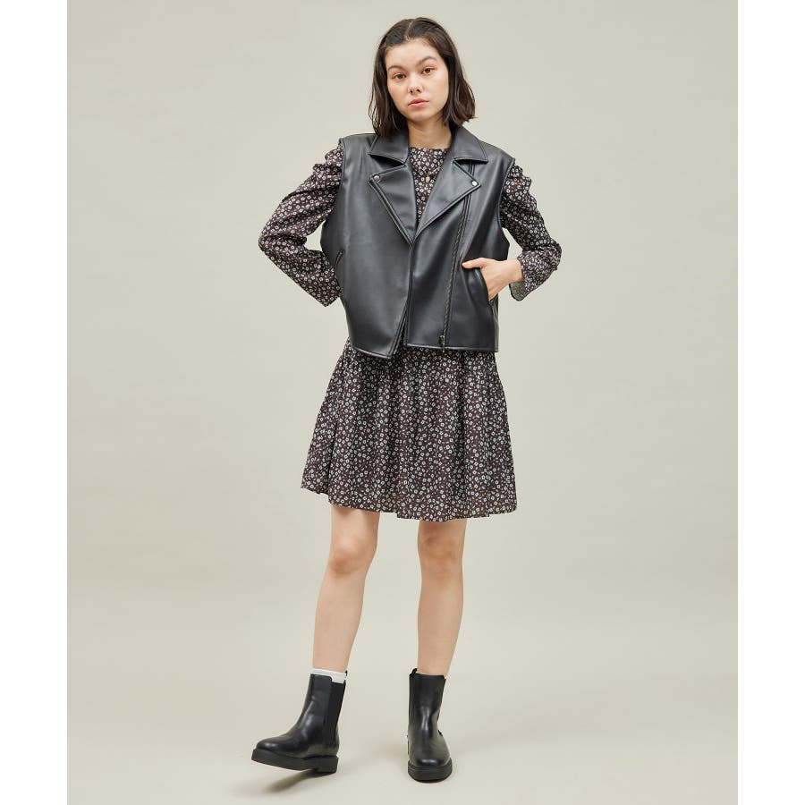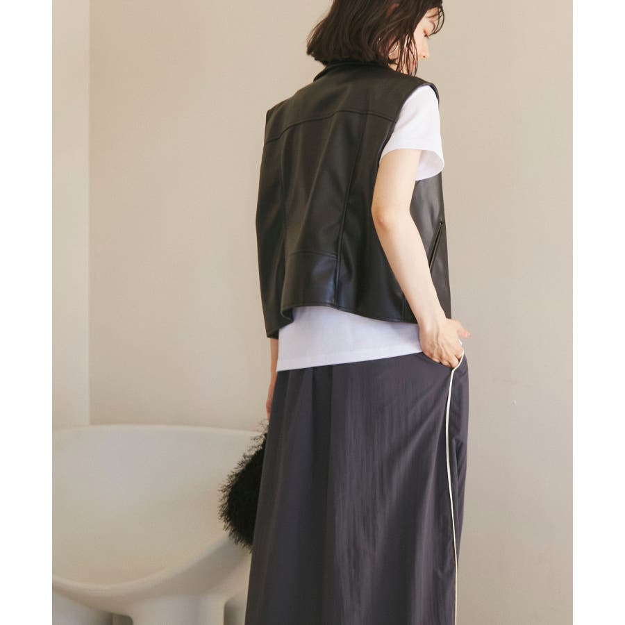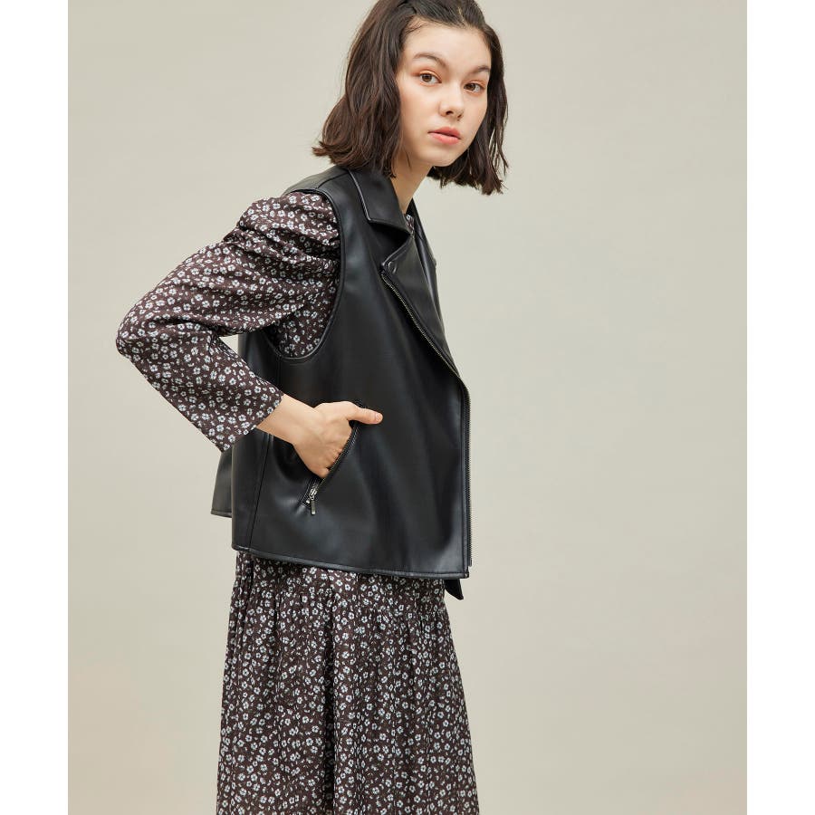 【素材感】 ・ナチュラルなツヤ感と柔らかさのフェイクレザーノースリーブジャケット。 【デザイン・シルエット】 ・ライダースジャケットのデザインを取り入れた、ハードテイストの一着。 ・ジレと同じ感覚で手軽に取り入れられる。 【カラー】 ・ブラックのみの展開。 【スタイリングポイント】 ・パーカーの上から重ねてデイリーの気楽なスタイルに。 ・フェミニンなワンピースに重ねるのも意外性があっておすすめ。 ・秋の立ち上がりは、半袖Tシャツに重ねるとグッド。 ----------------------------- 裏地:あり 透け感:なし 伸縮性:なし 生地感・厚さやや:厚手 ポケット:あり 季節:秋~春 ----------------------------- ※撮影時の光、お使いのモニター環境によって色の見え方が違う場 ※モデル身長:165cm 着用サイズ:38