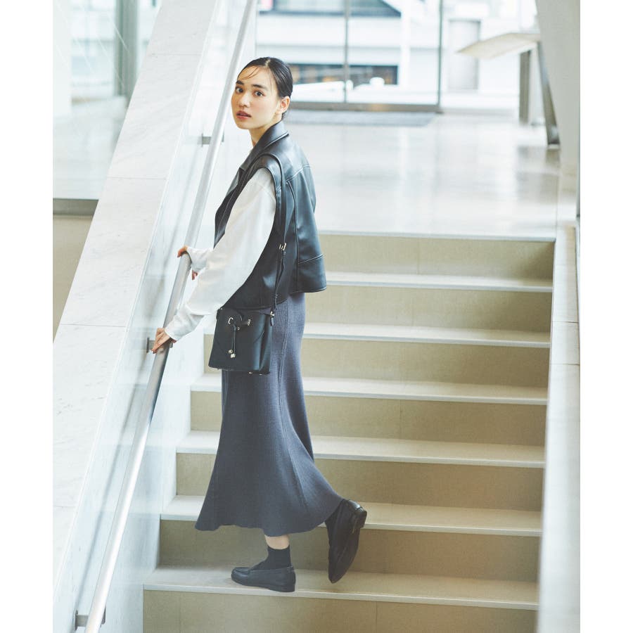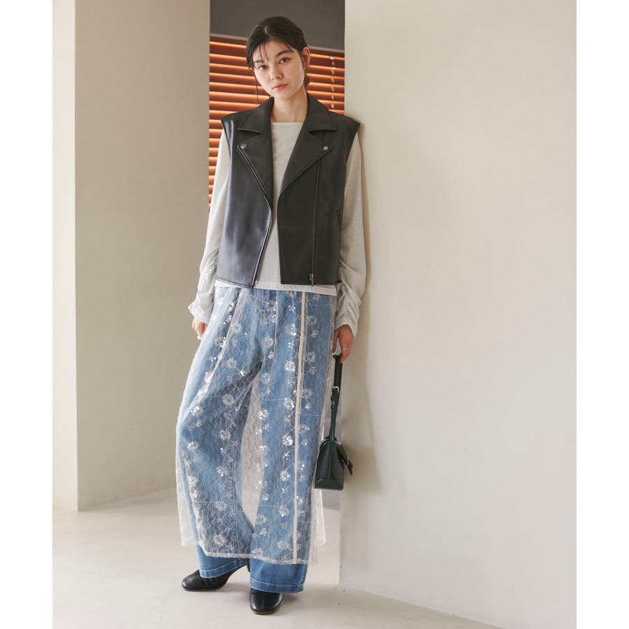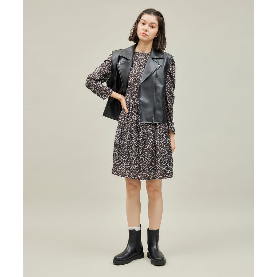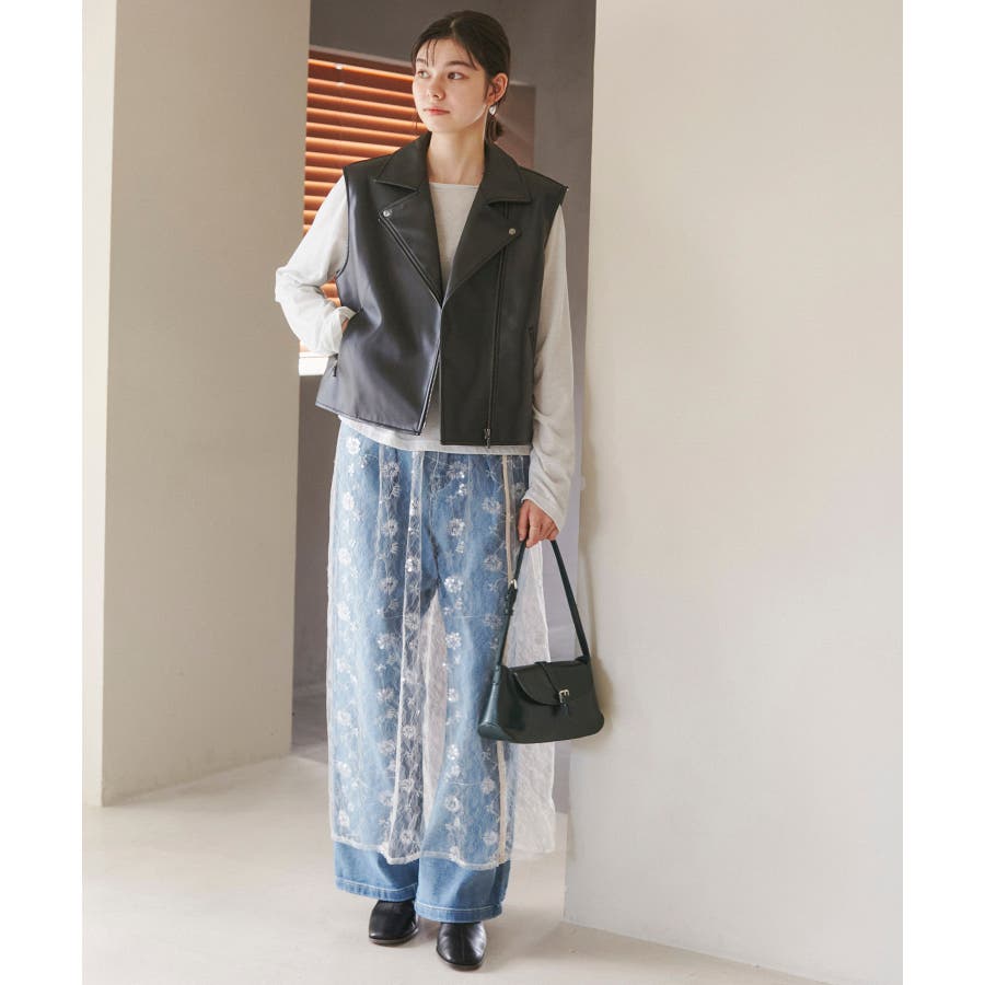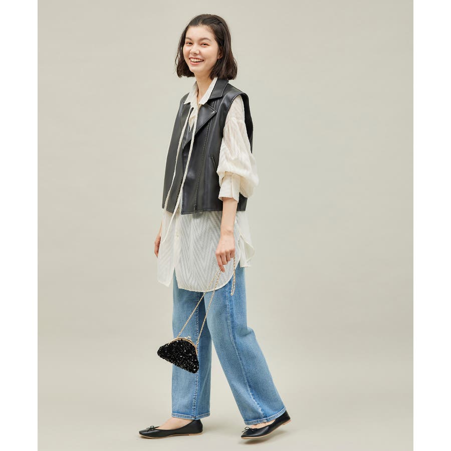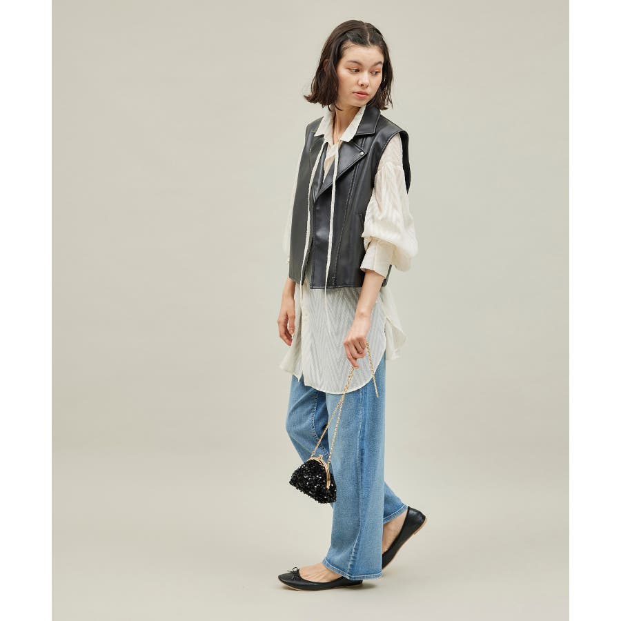 【素材感】 ・ナチュラルなツヤ感と柔らかさのフェイクレザーノースリーブジャケット。 【デザイン・シルエット】 ・ライダースジャケットのデザインを取り入れた、ハードテイストの一着。 ・ジレと同じ感覚で手軽に取り入れられる。 【カラー】 ・ブラックのみの展開。 【スタイリングポイント】 ・パーカーの上から重ねてデイリーの気楽なスタイルに。 ・フェミニンなワンピースに重ねるのも意外性があっておすすめ。 ・秋の立ち上がりは、半袖Tシャツに重ねるとグッド。 ----------------------------- 裏地:あり 透け感:なし 伸縮性:なし 生地感・厚さやや:厚手 ポケット:あり 季節:秋~春 ----------------------------- ※撮影時の光、お使いのモニター環境によって色の見え方が違う場 ※モデル身長:165cm 着用サイズ:38