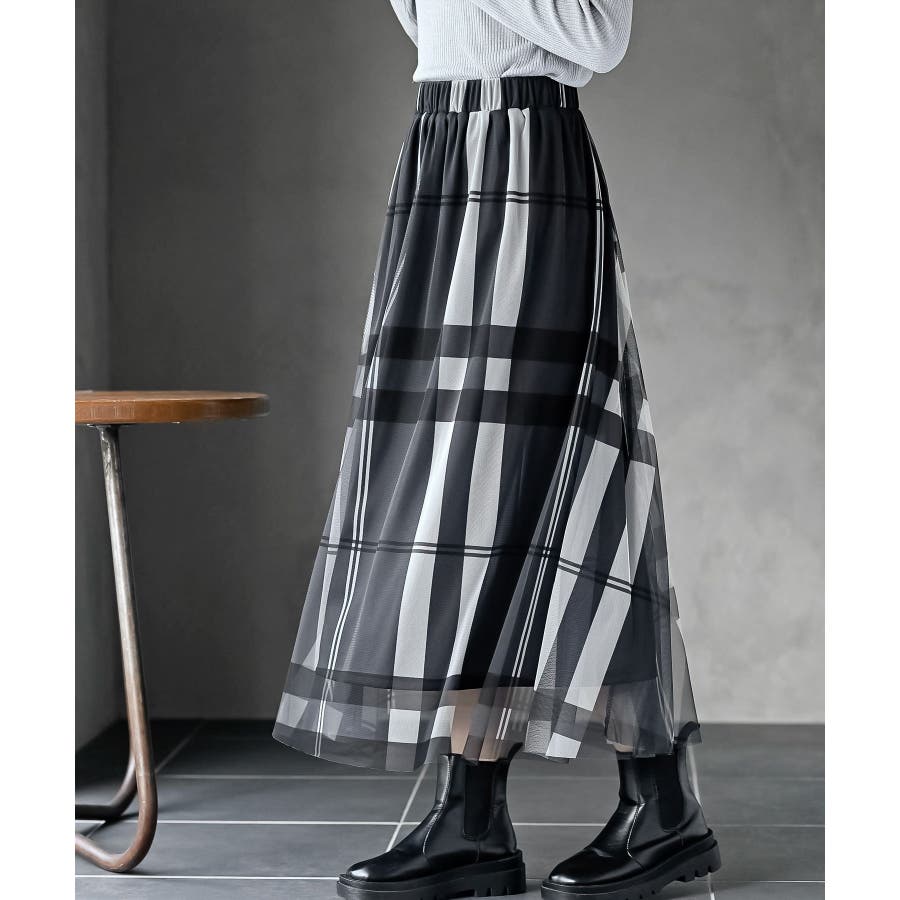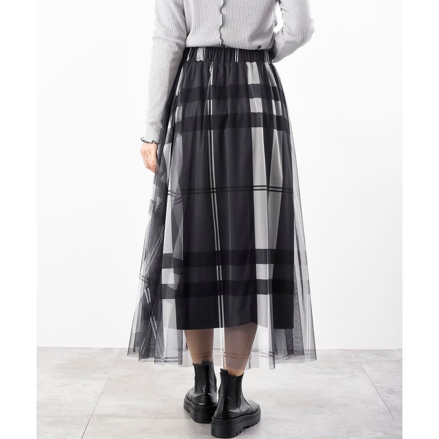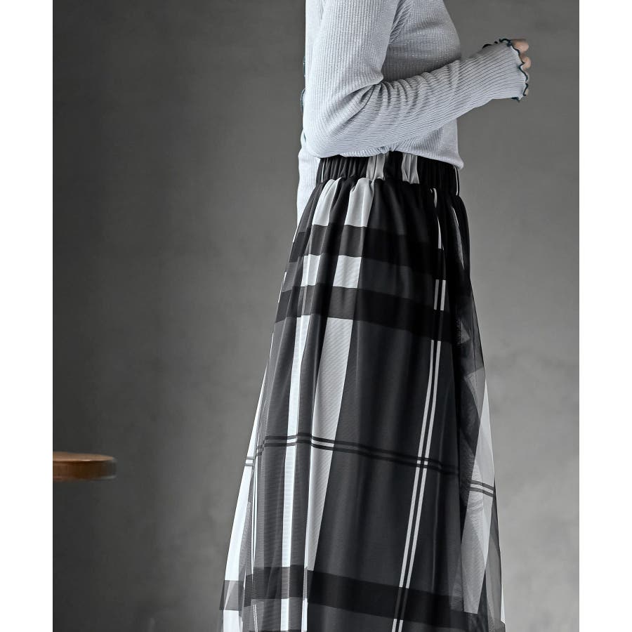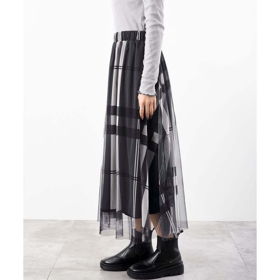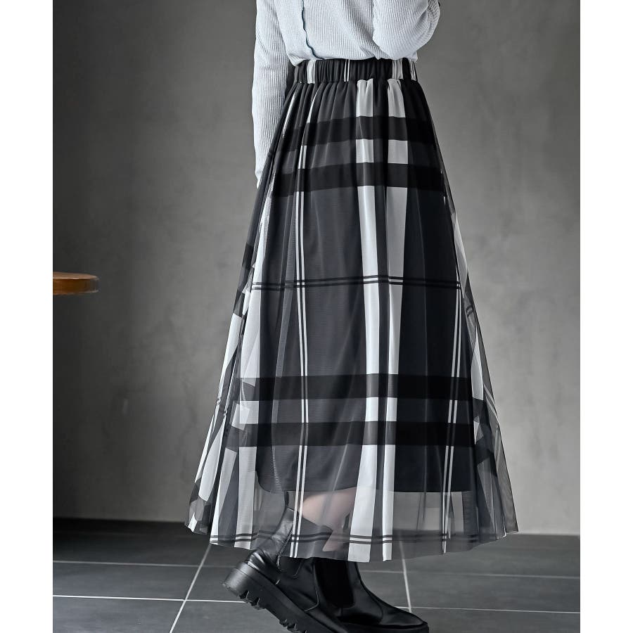 チュールチェックプリントギャザースカート
