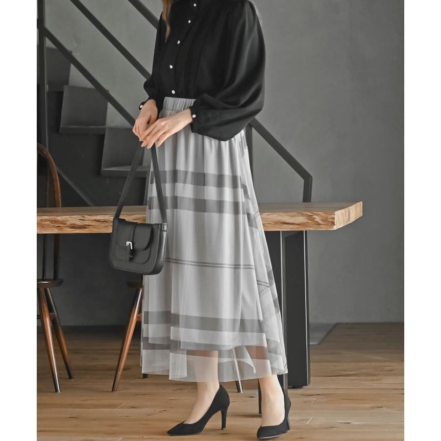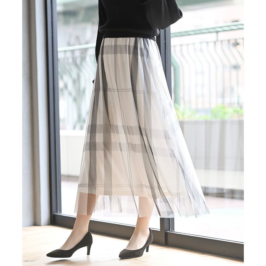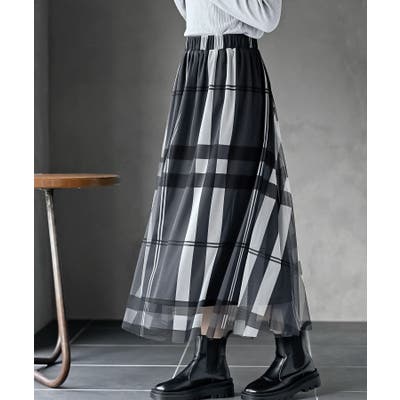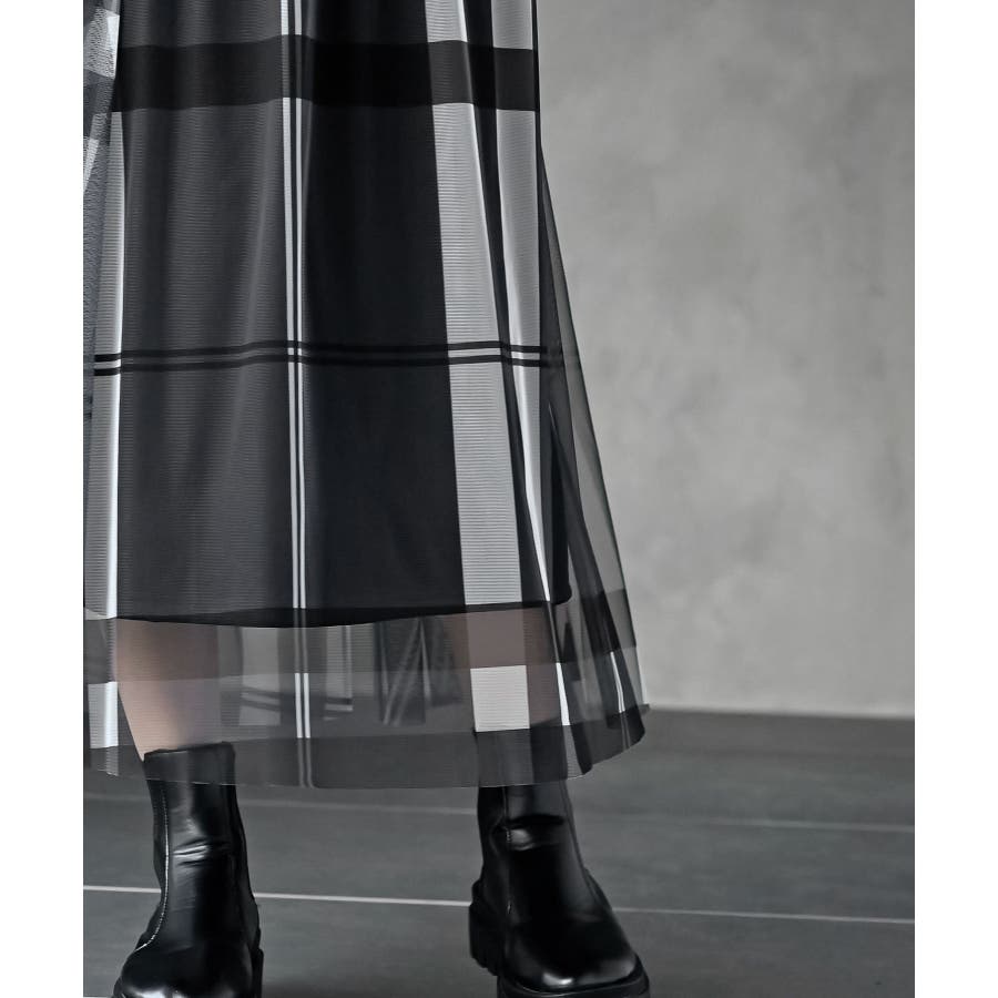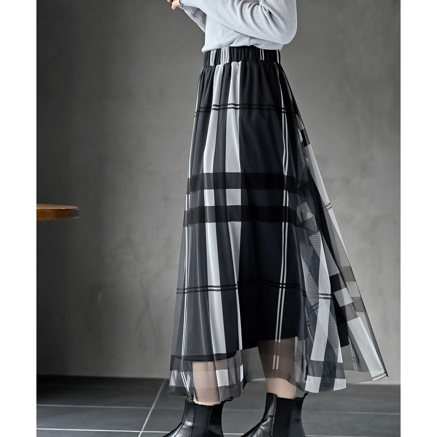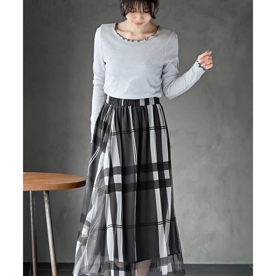チュールチェックプリントギャザースカート