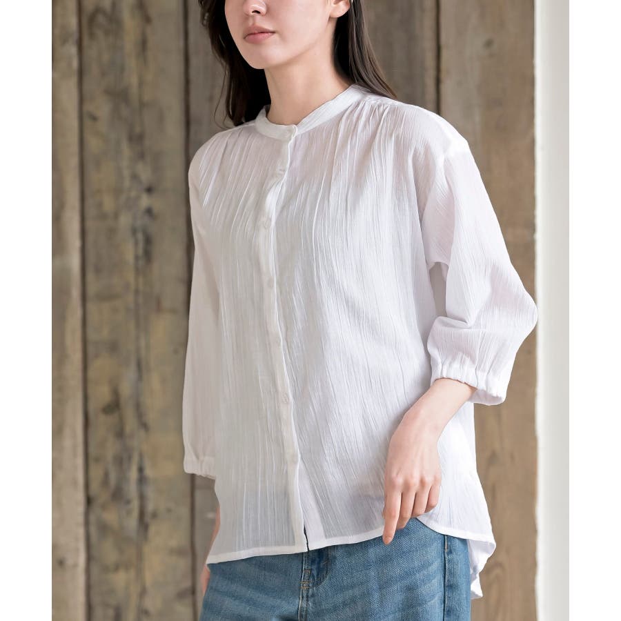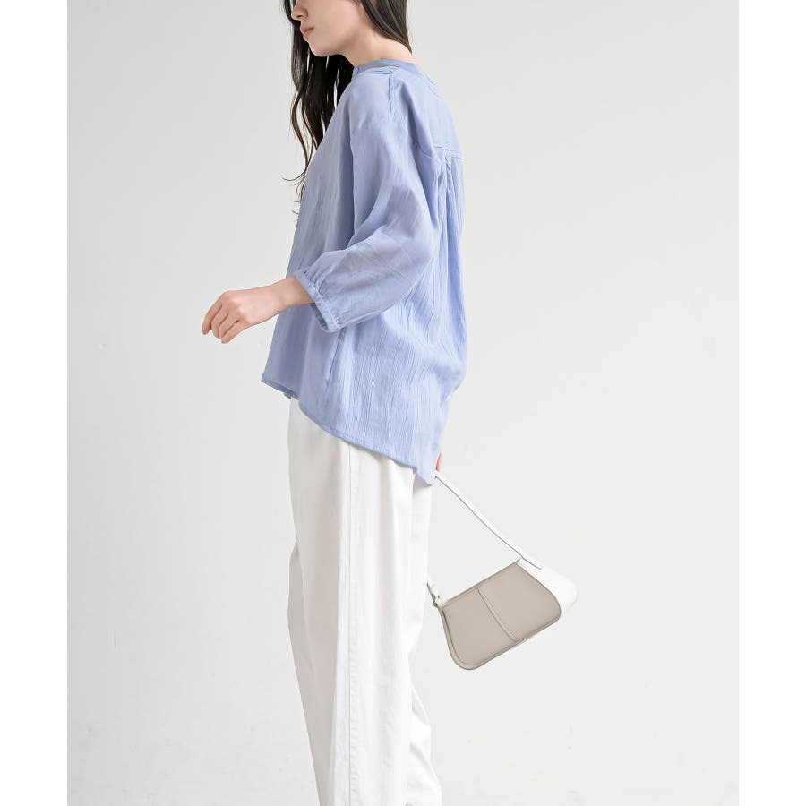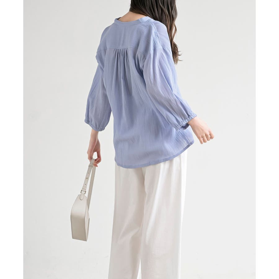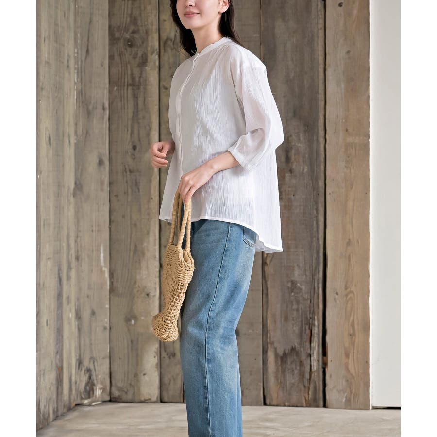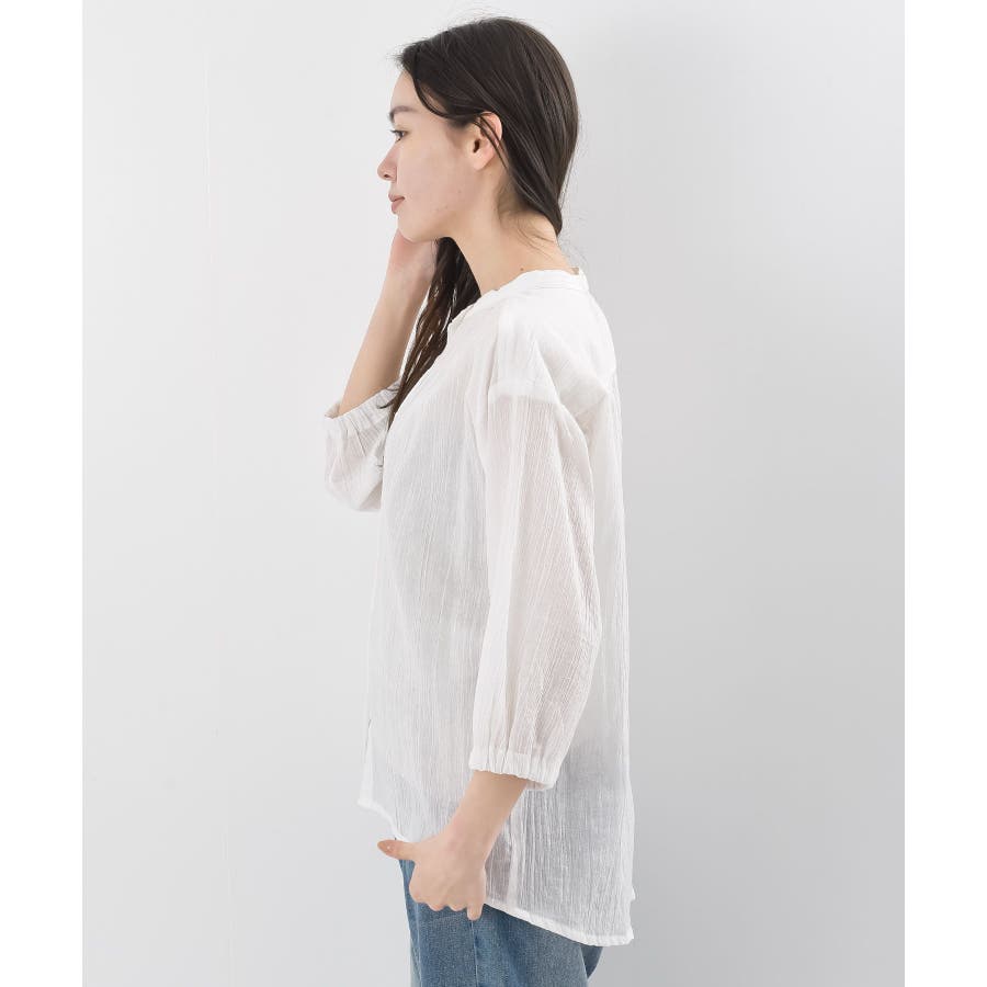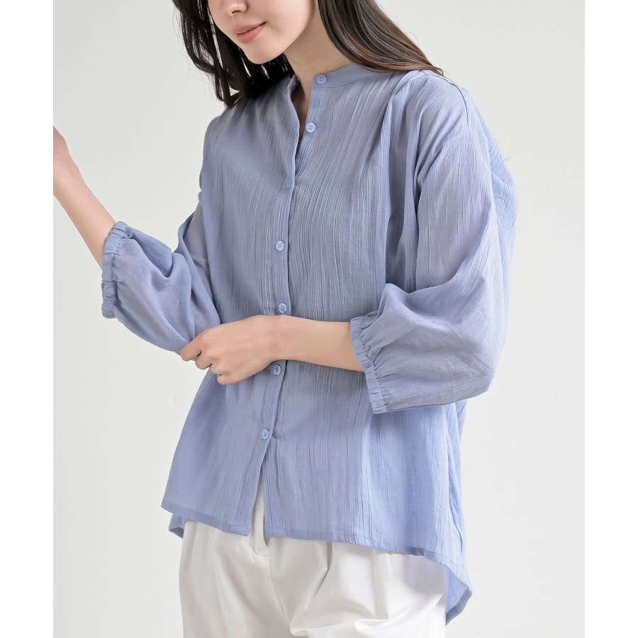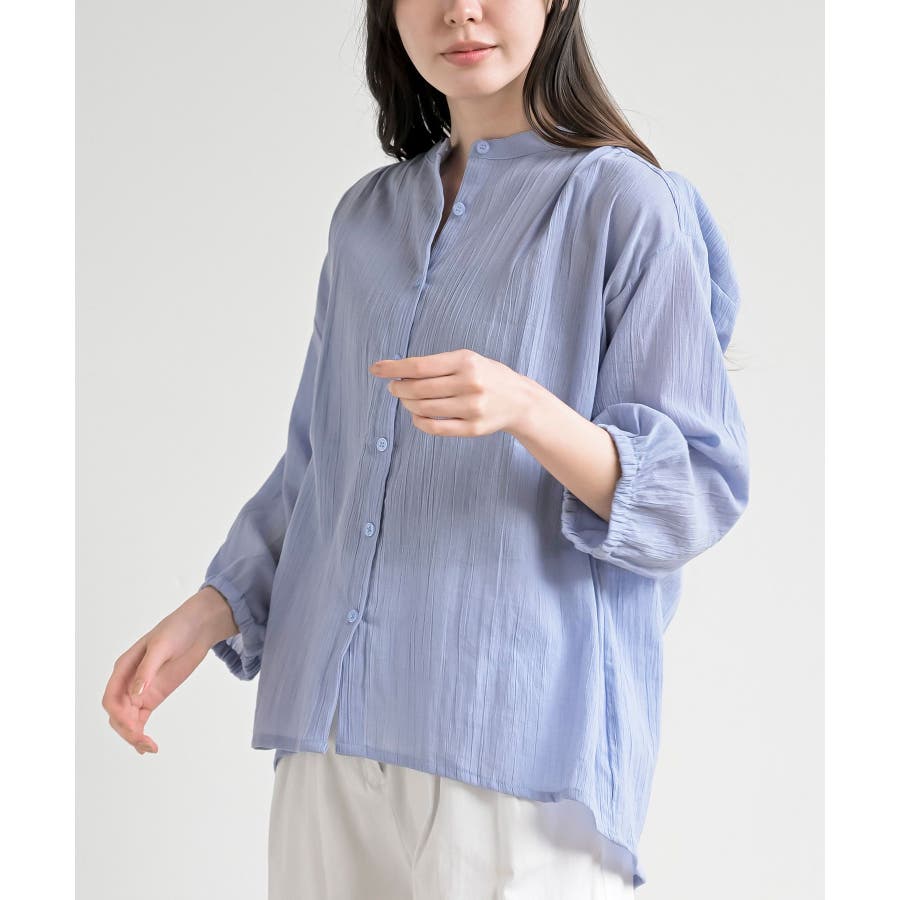 シアー楊柳バンドカラー7分袖ブラウス