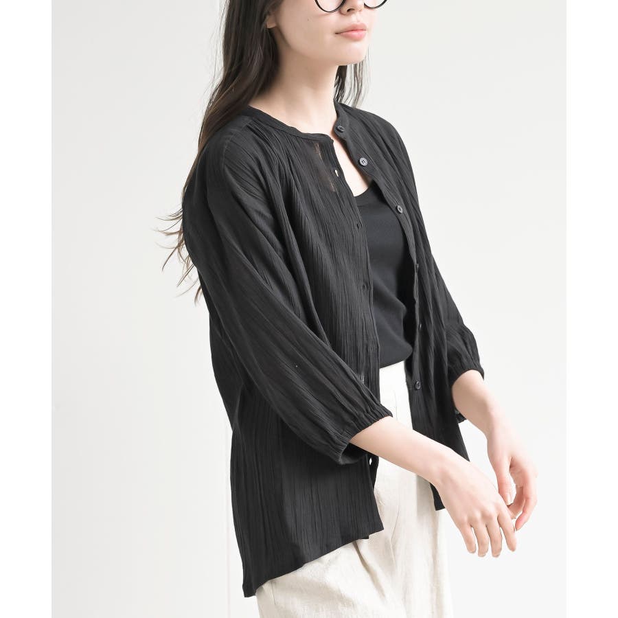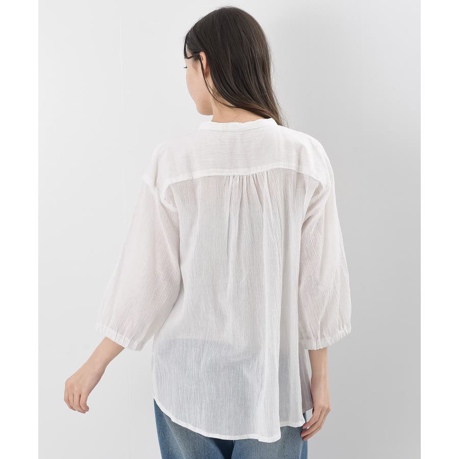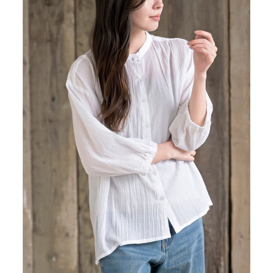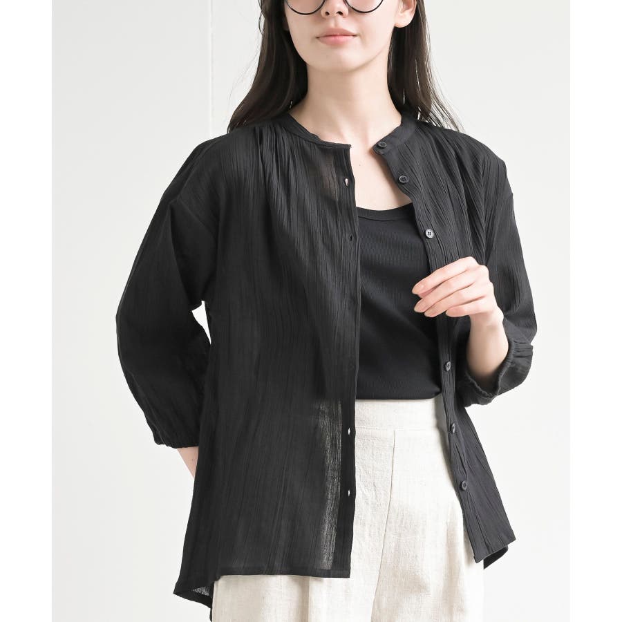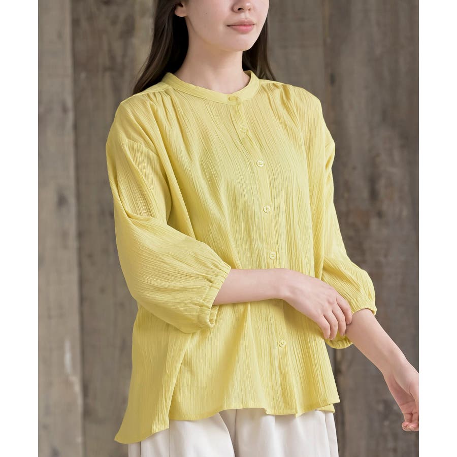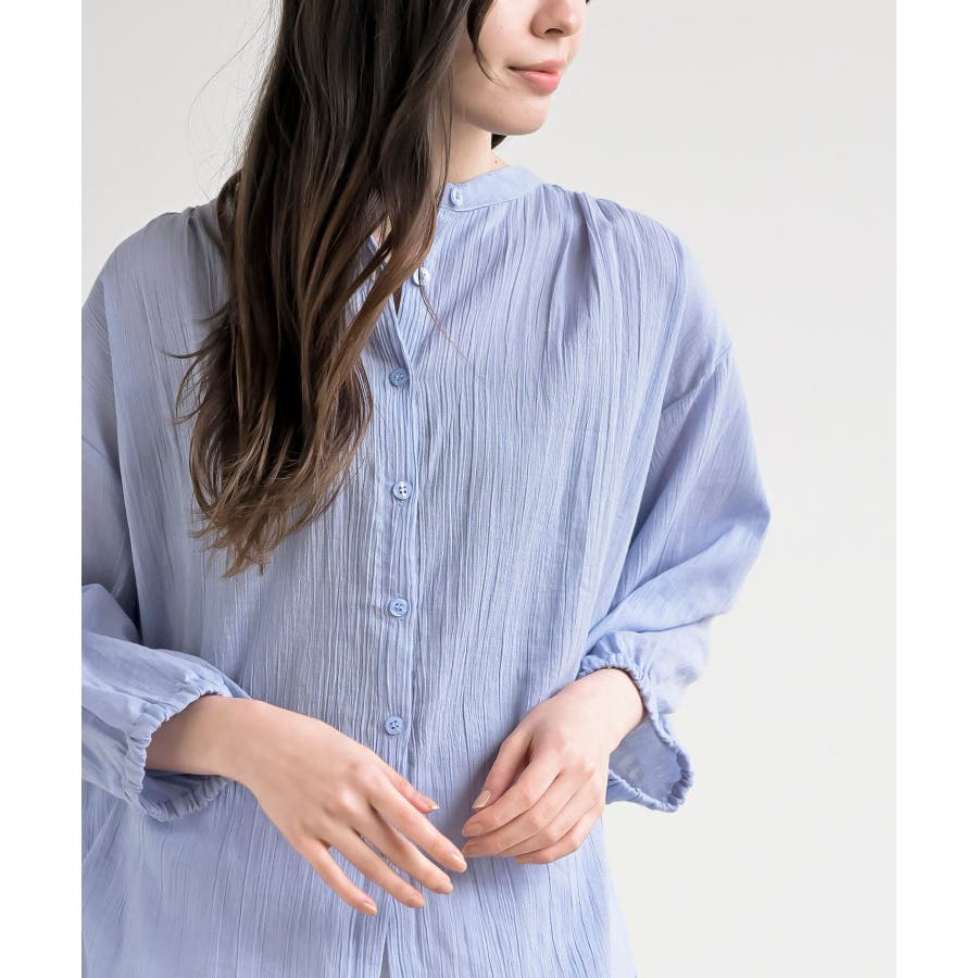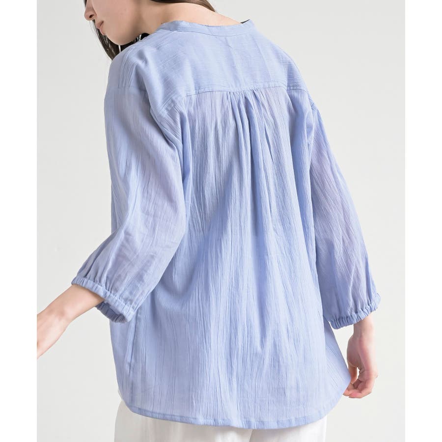 シアー楊柳バンドカラー7分袖ブラウス