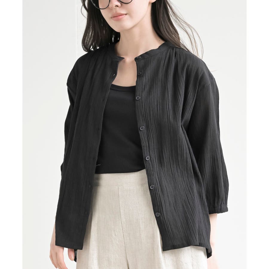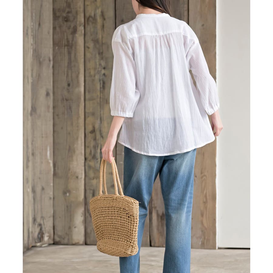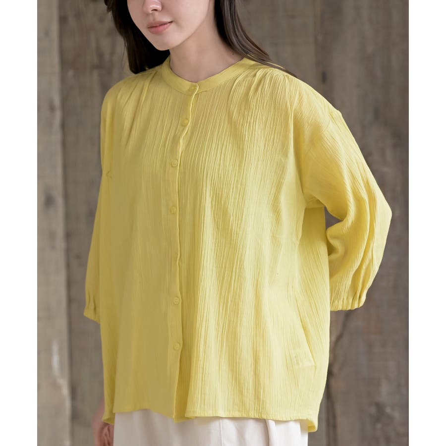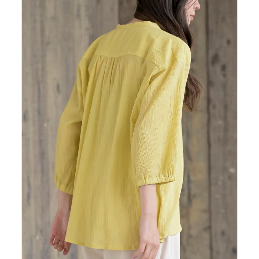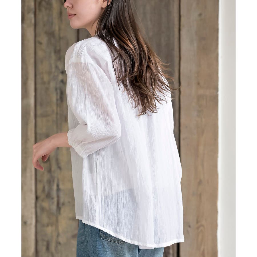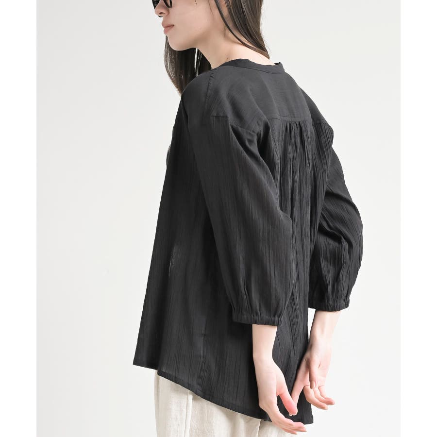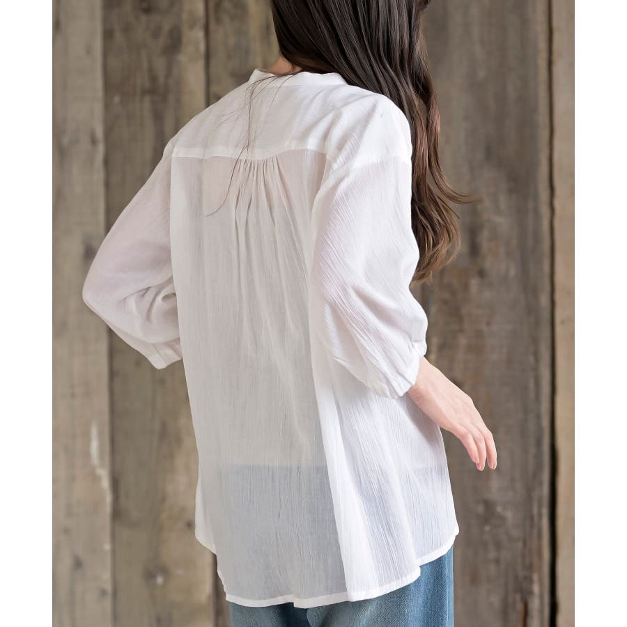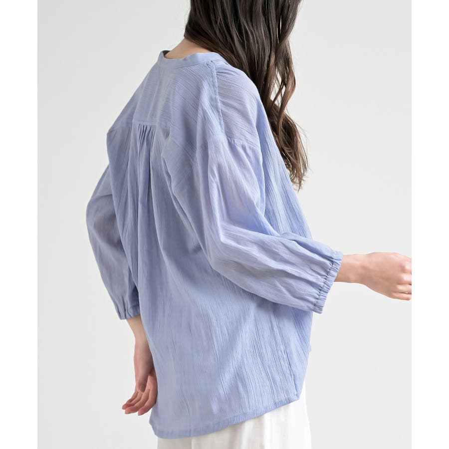 シアー楊柳バンドカラー7分袖ブラウス