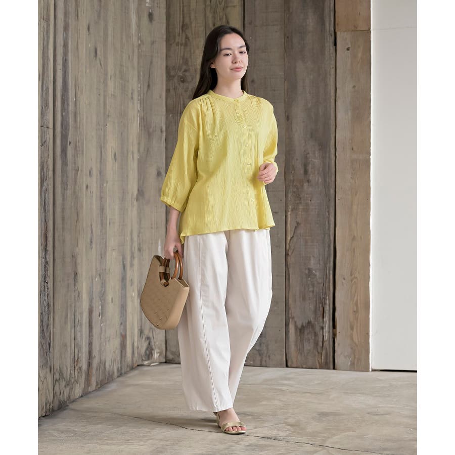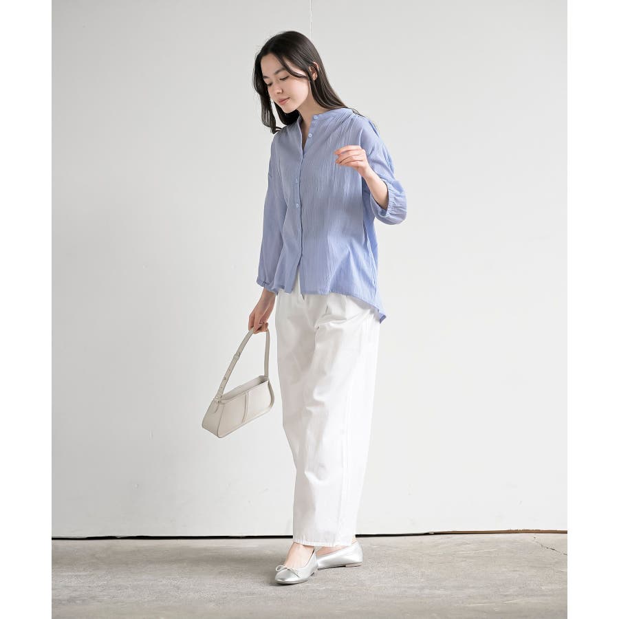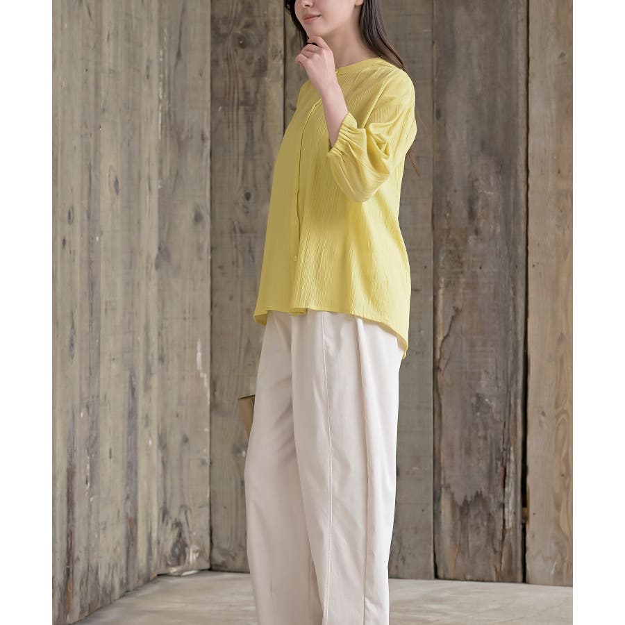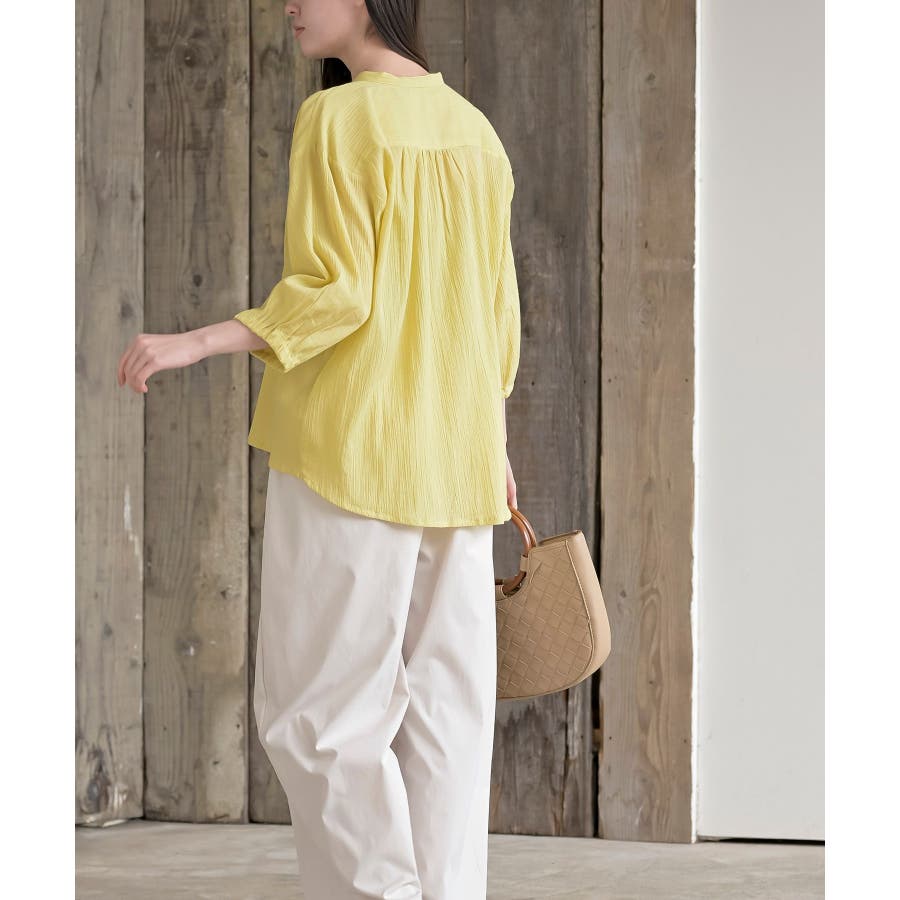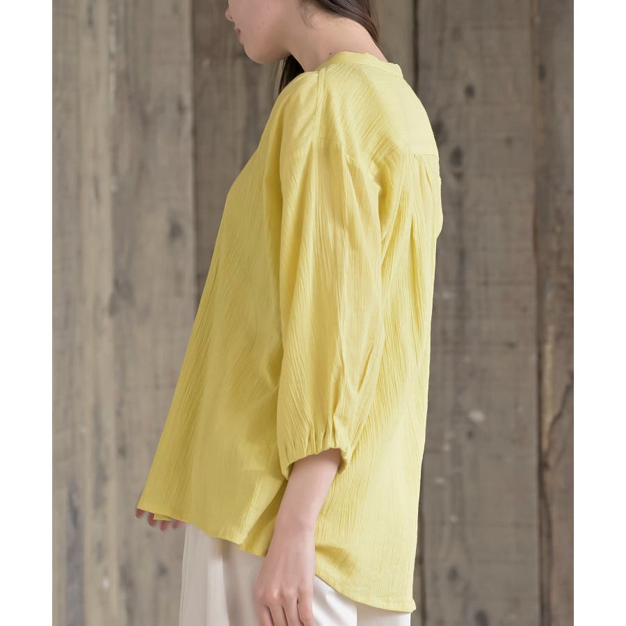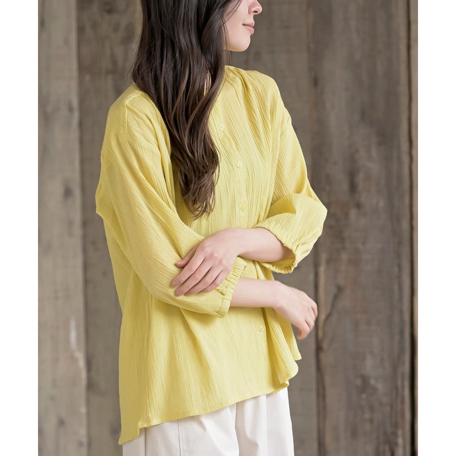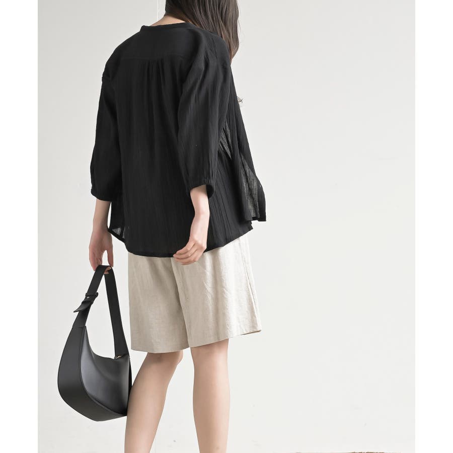 シアー楊柳バンドカラー7分袖ブラウス