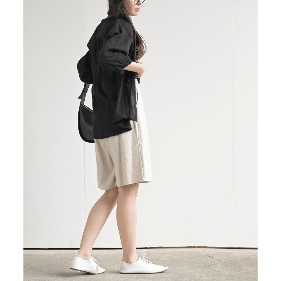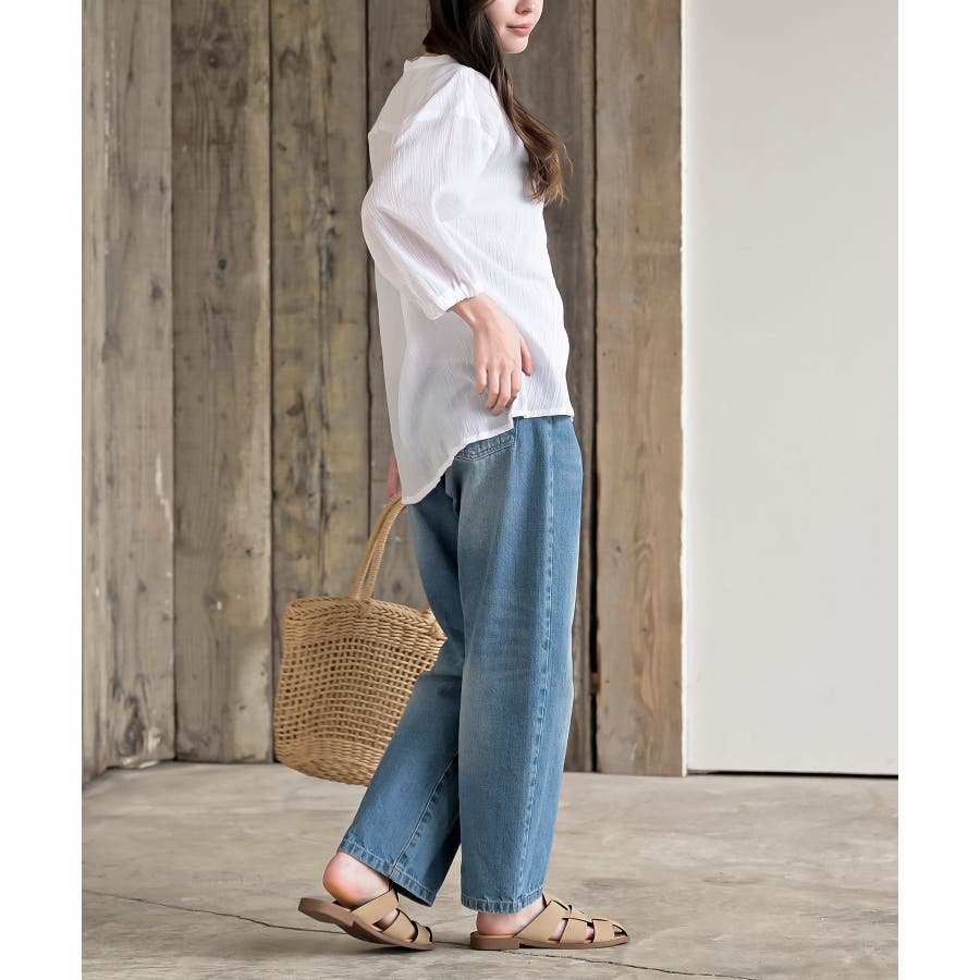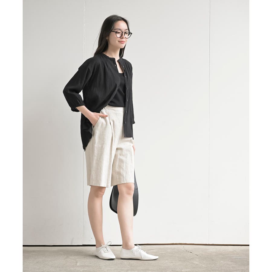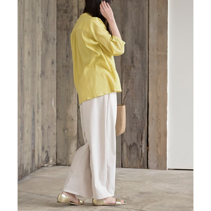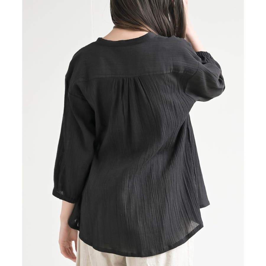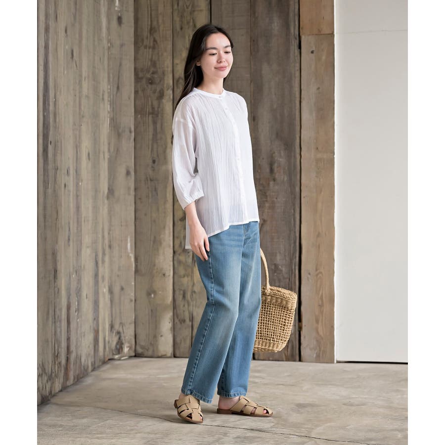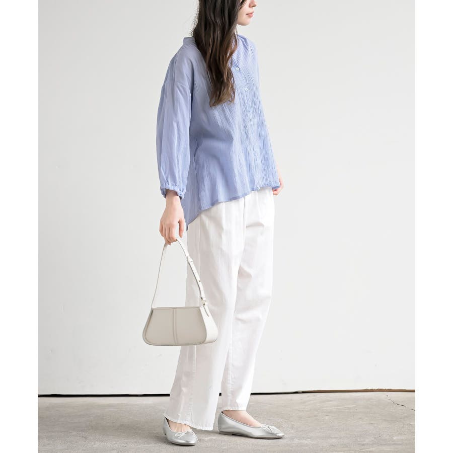 シアー楊柳バンドカラー7分袖ブラウス