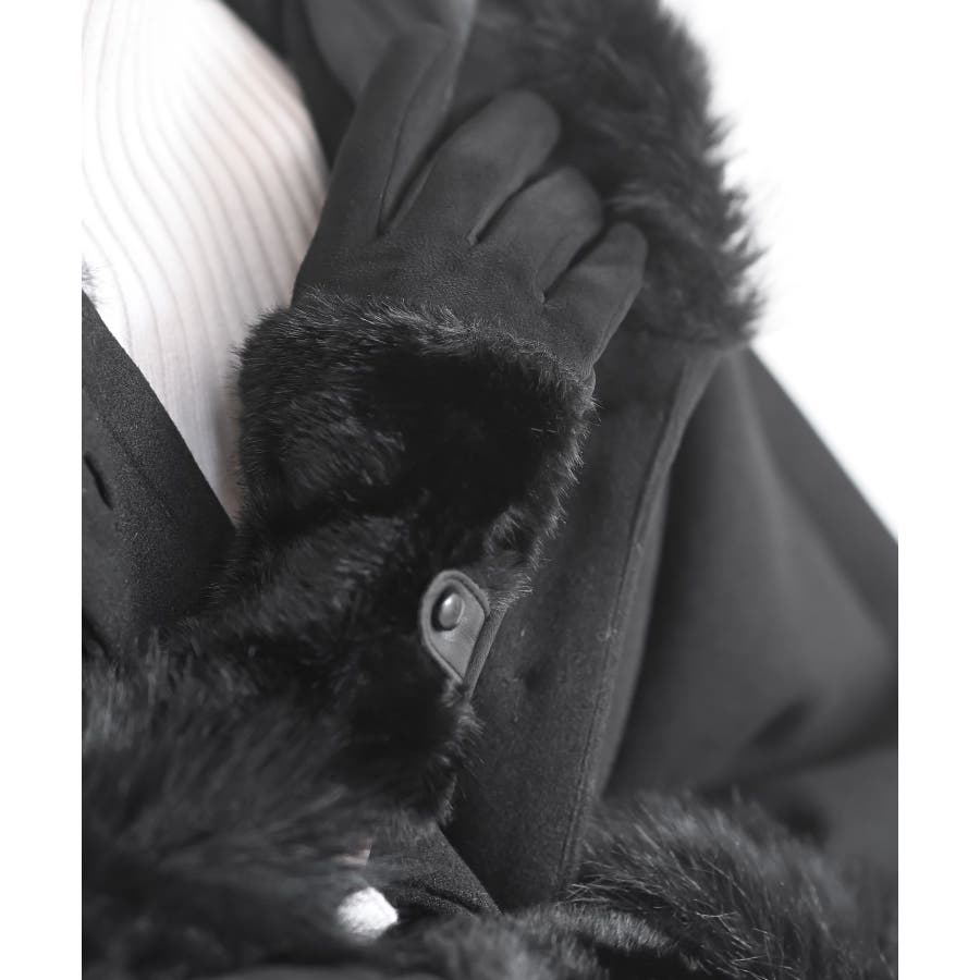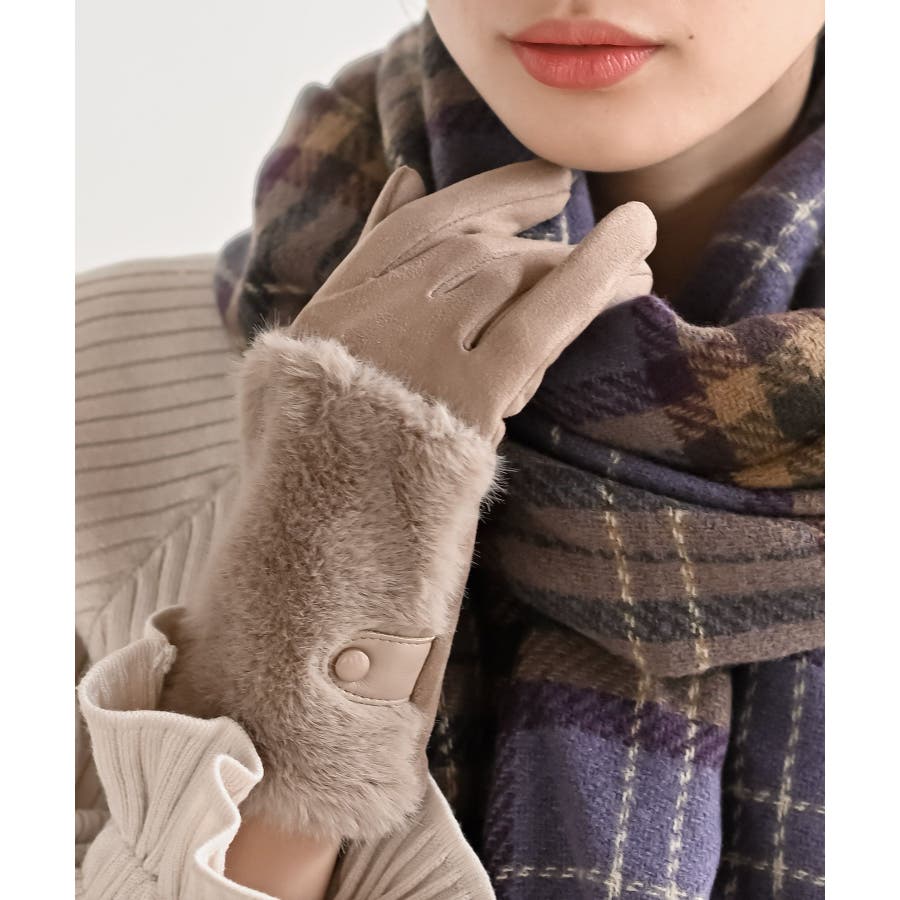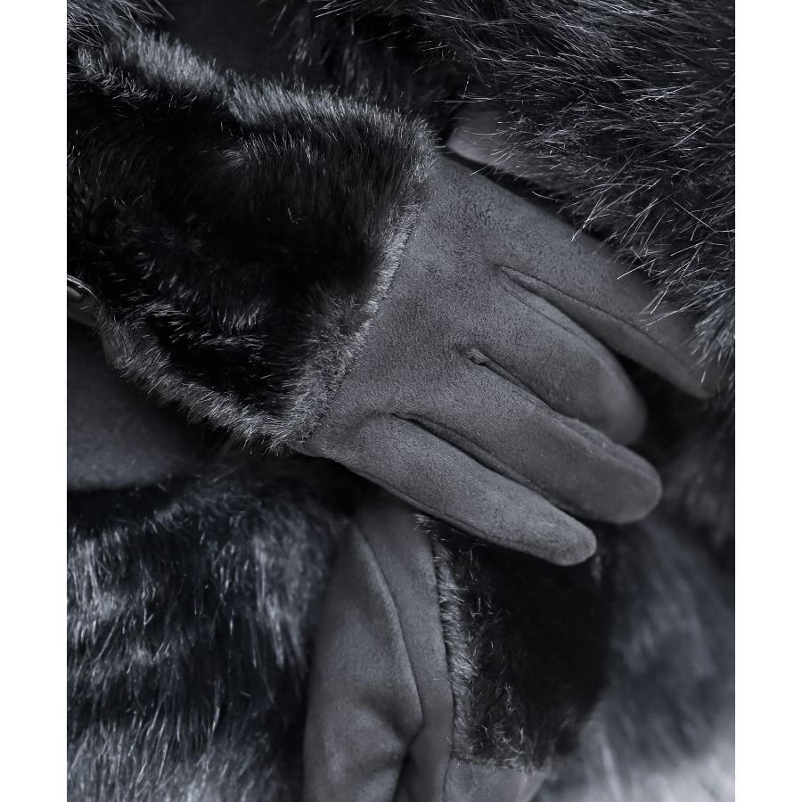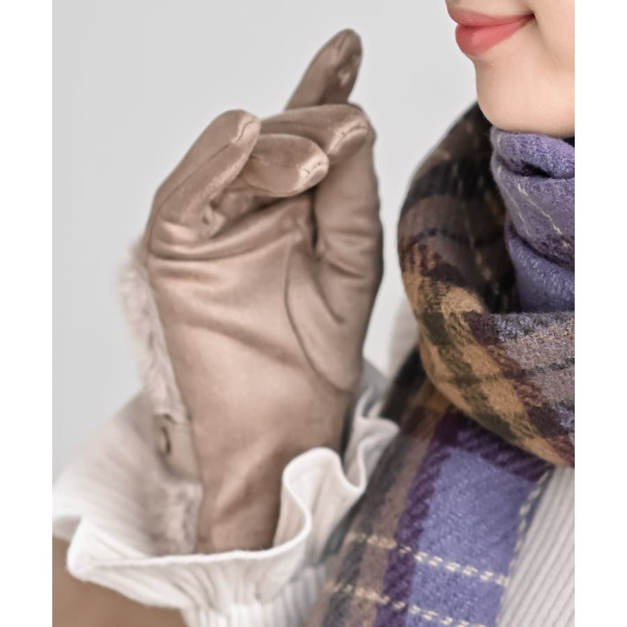 ☆2025/AW NEW☆【スマホ対応】洗練された手元を演出するフェイクスウェードのファー付グローブ暖かさとスタイリッシュさを兼ね備えたフェイクスウェードの手袋。甲部分にはフェイクファーを重ねて華やかな手元を演出してくれます。合皮のタブとボタンで洗練されたアクセントに。両手の人差し指部分は花柄の刺しゅう入りでタッチパネルの操作も可能です。裏地なし伸縮性弱薄手フェイクファー(繊維の構造上、引っ張ると繊維が抜ける場合があります。また、使用中の摩擦により繊維が抜けやすくなりますのでお取扱いにご注意ください)