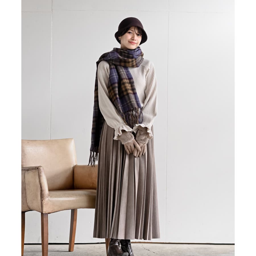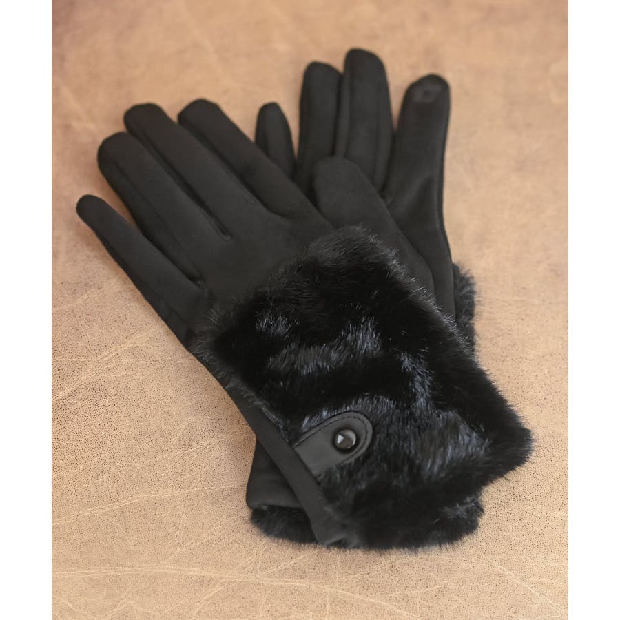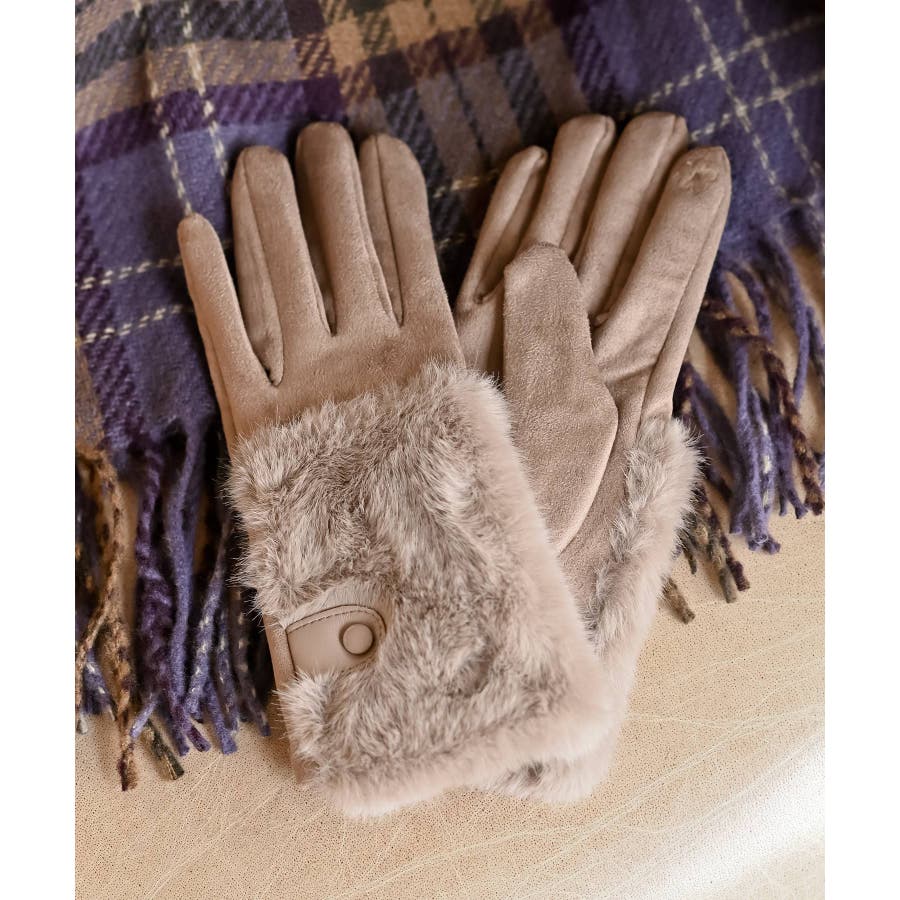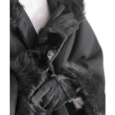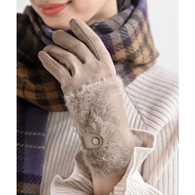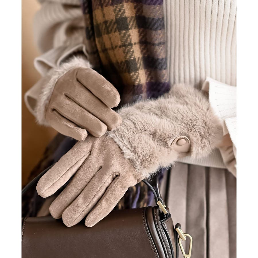 ☆2025/AW NEW☆【スマホ対応】洗練された手元を演出するフェイクスウェードのファー付グローブ暖かさとスタイリッシュさを兼ね備えたフェイクスウェードの手袋。甲部分にはフェイクファーを重ねて華やかな手元を演出してくれます。合皮のタブとボタンで洗練されたアクセントに。両手の人差し指部分は花柄の刺しゅう入りでタッチパネルの操作も可能です。裏地なし伸縮性弱薄手フェイクファー(繊維の構造上、引っ張ると繊維が抜ける場合があります。また、使用中の摩擦により繊維が抜けやすくなりますのでお取扱いにご注意ください)