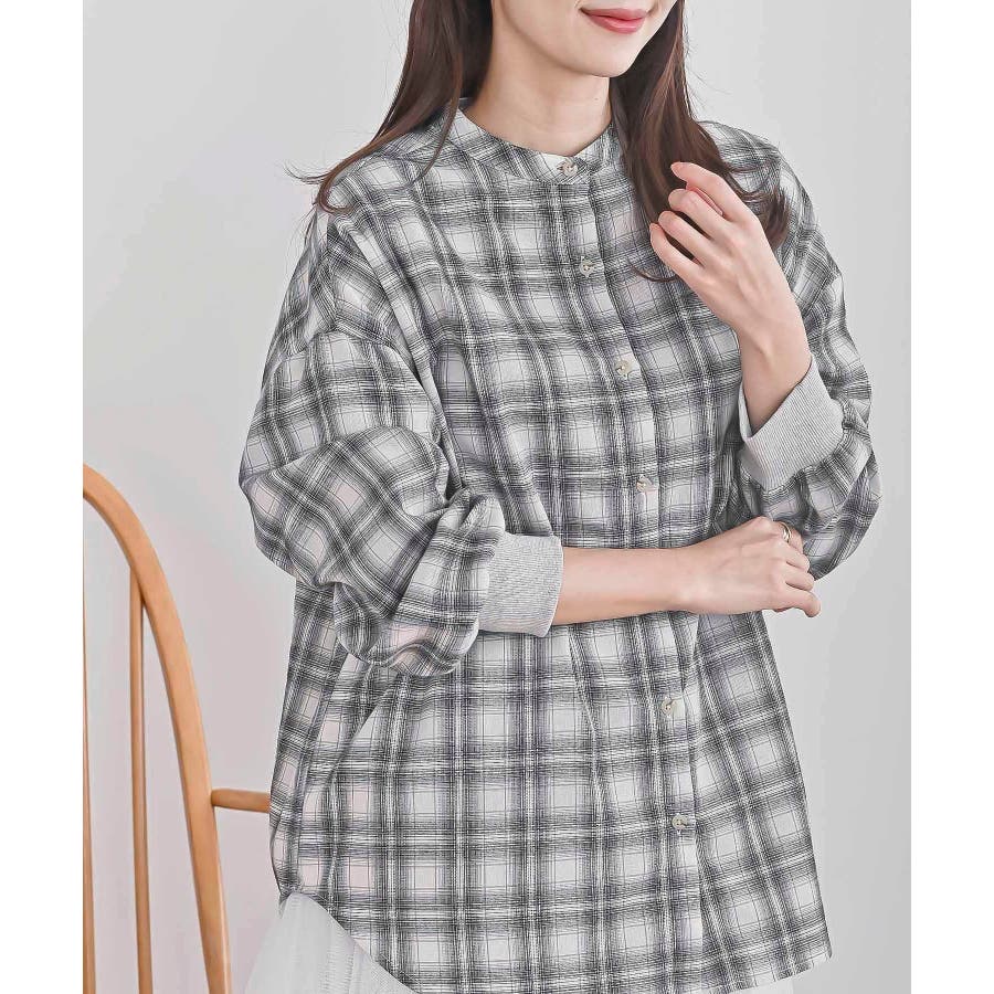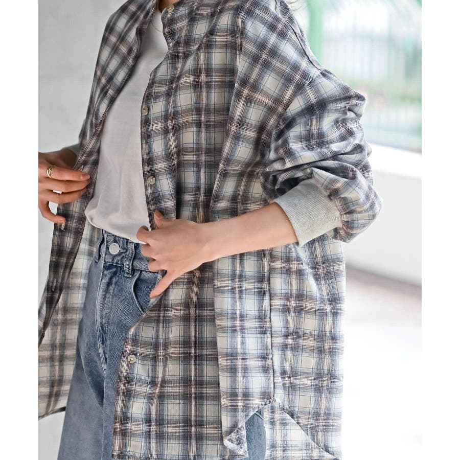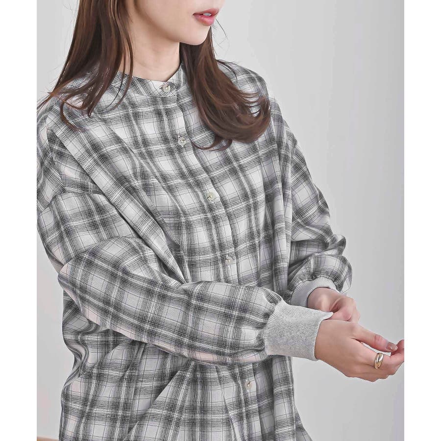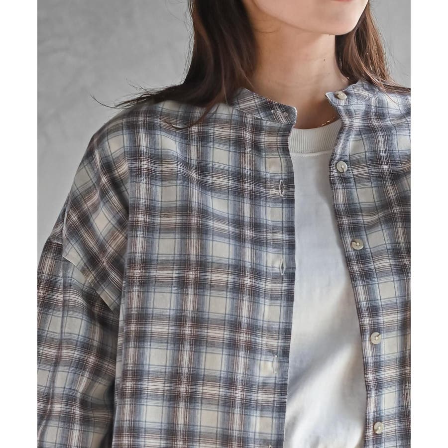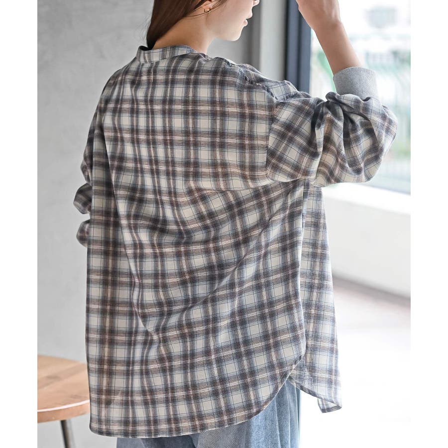 リブ使いバンドカラーチェックシャツ