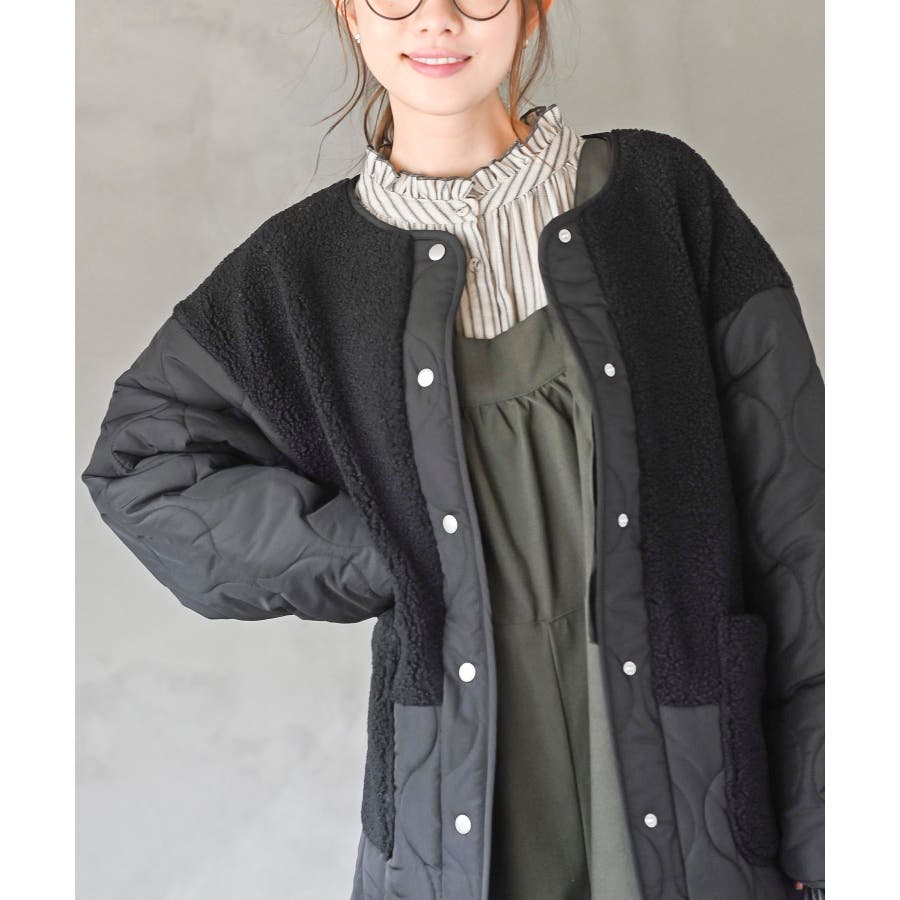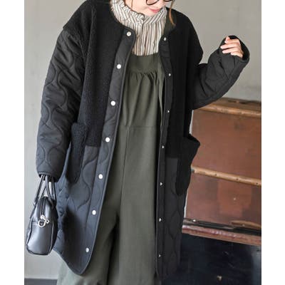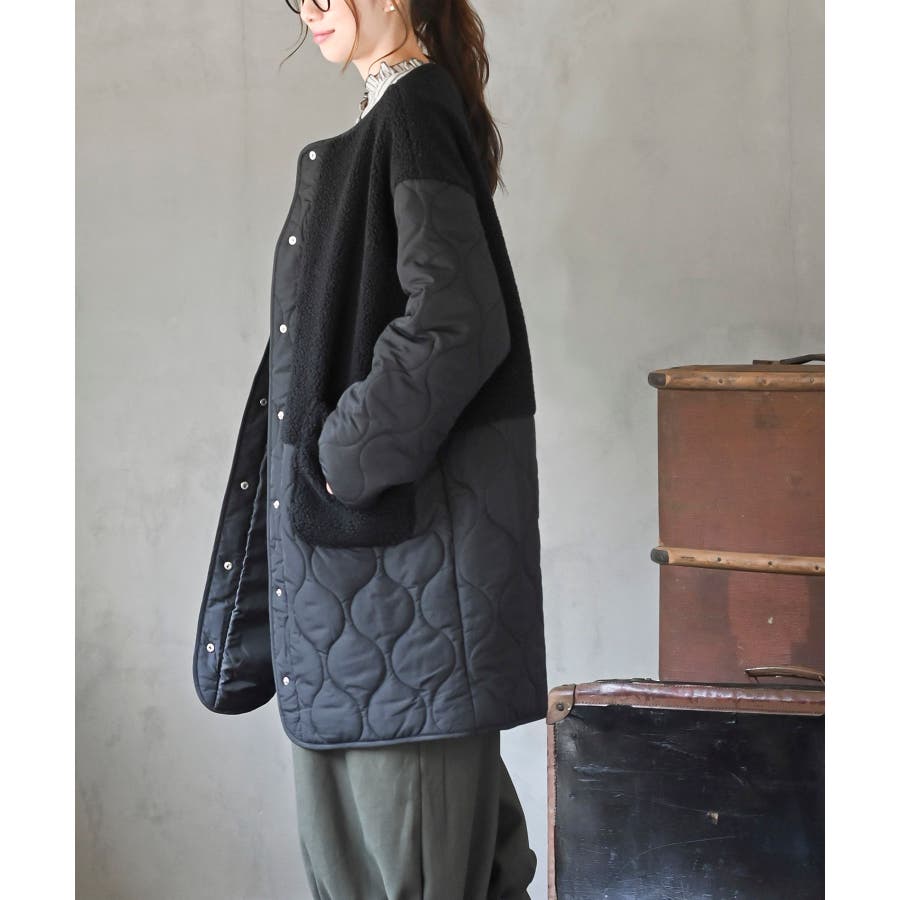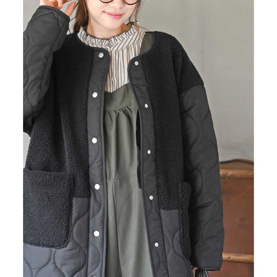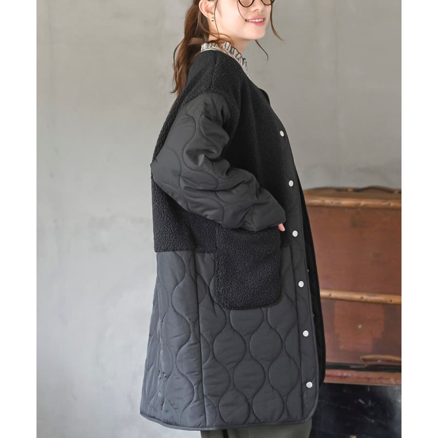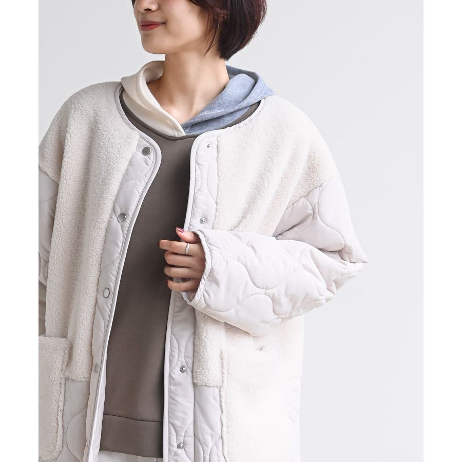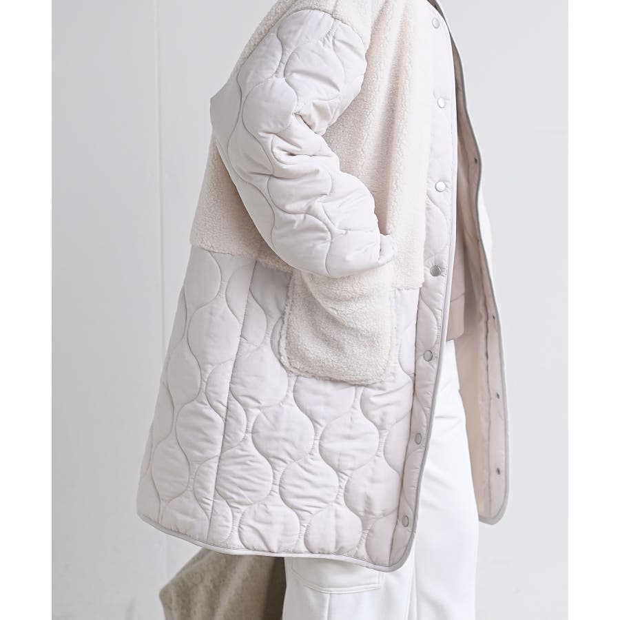 ボア×ウェーブキルト切替ノーカラーコート
