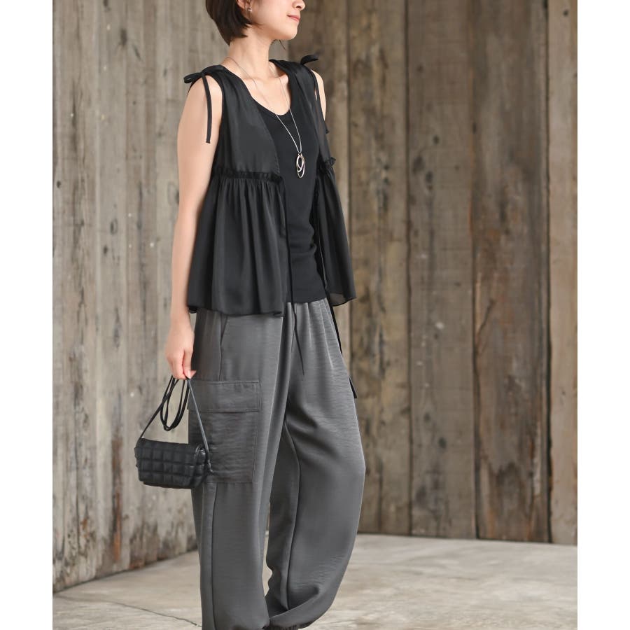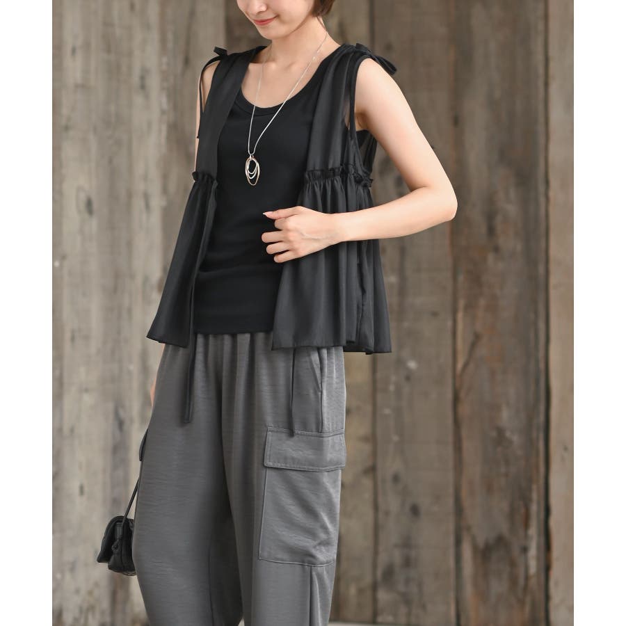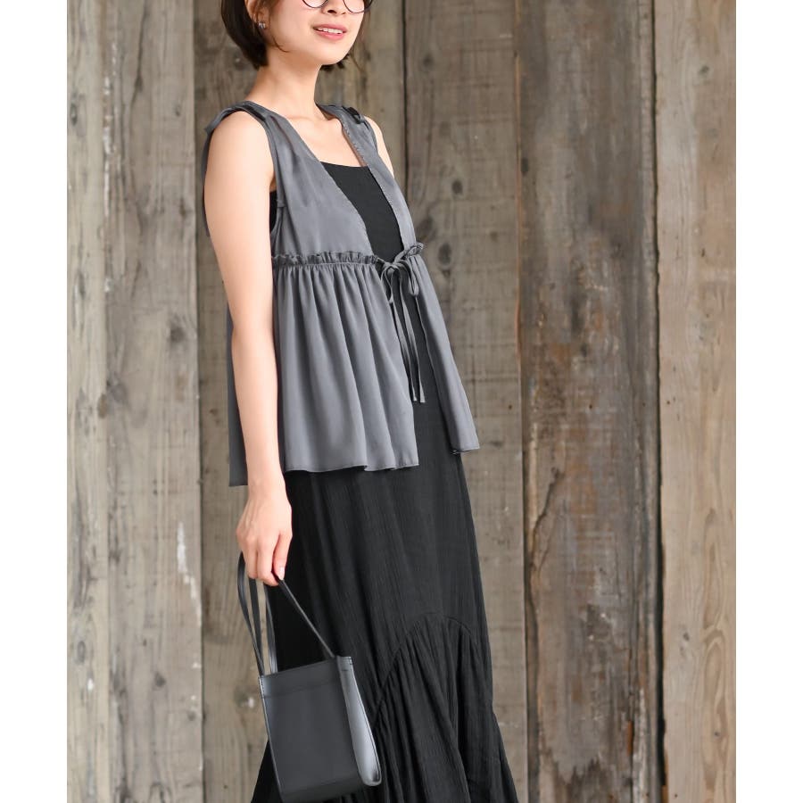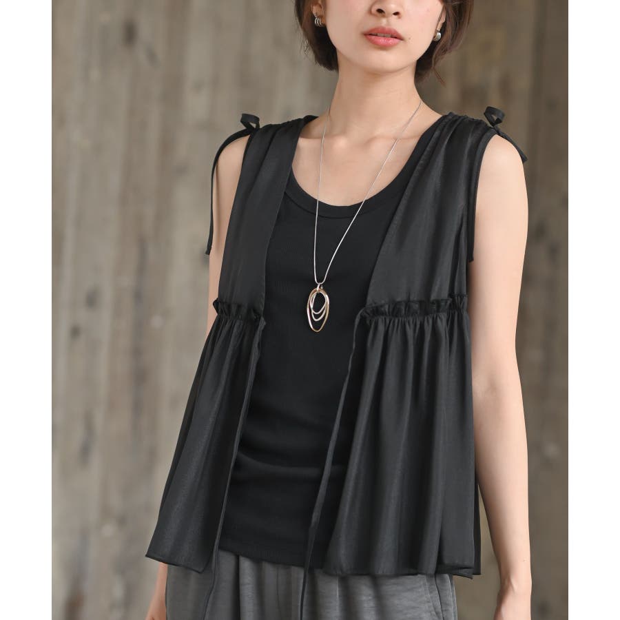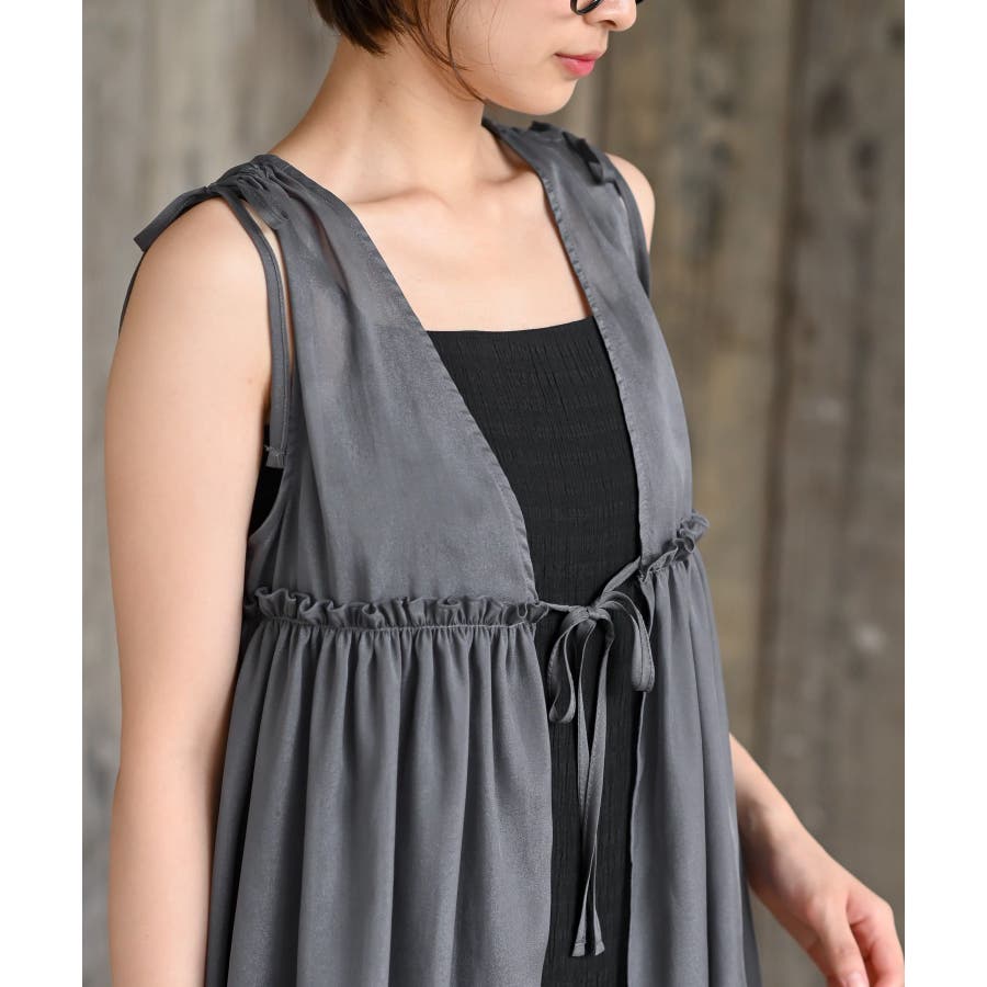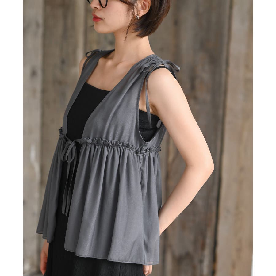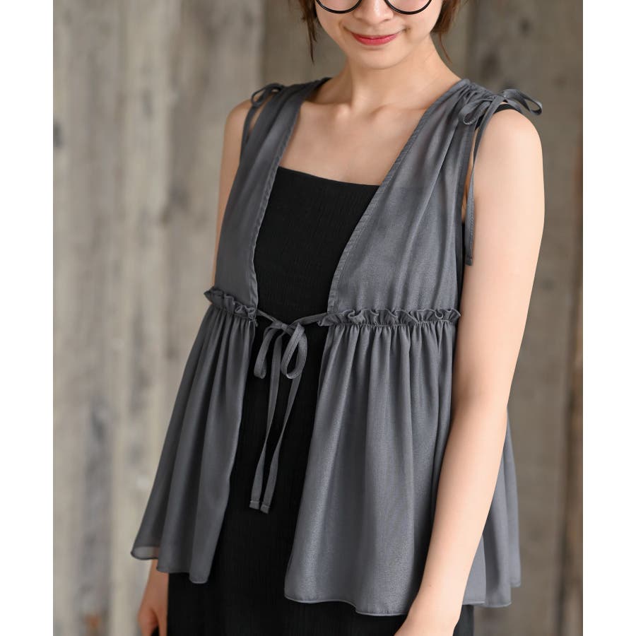 【CHACグレー】光沢シアーリボンベスト