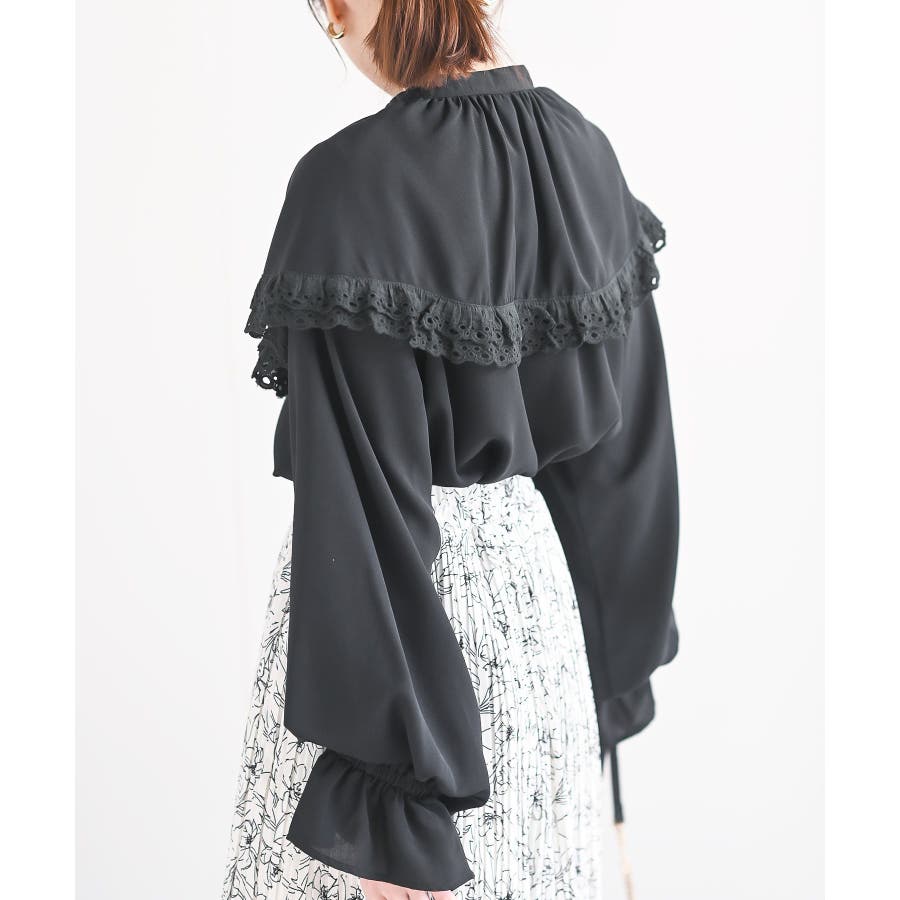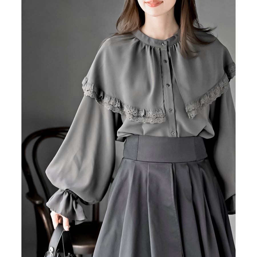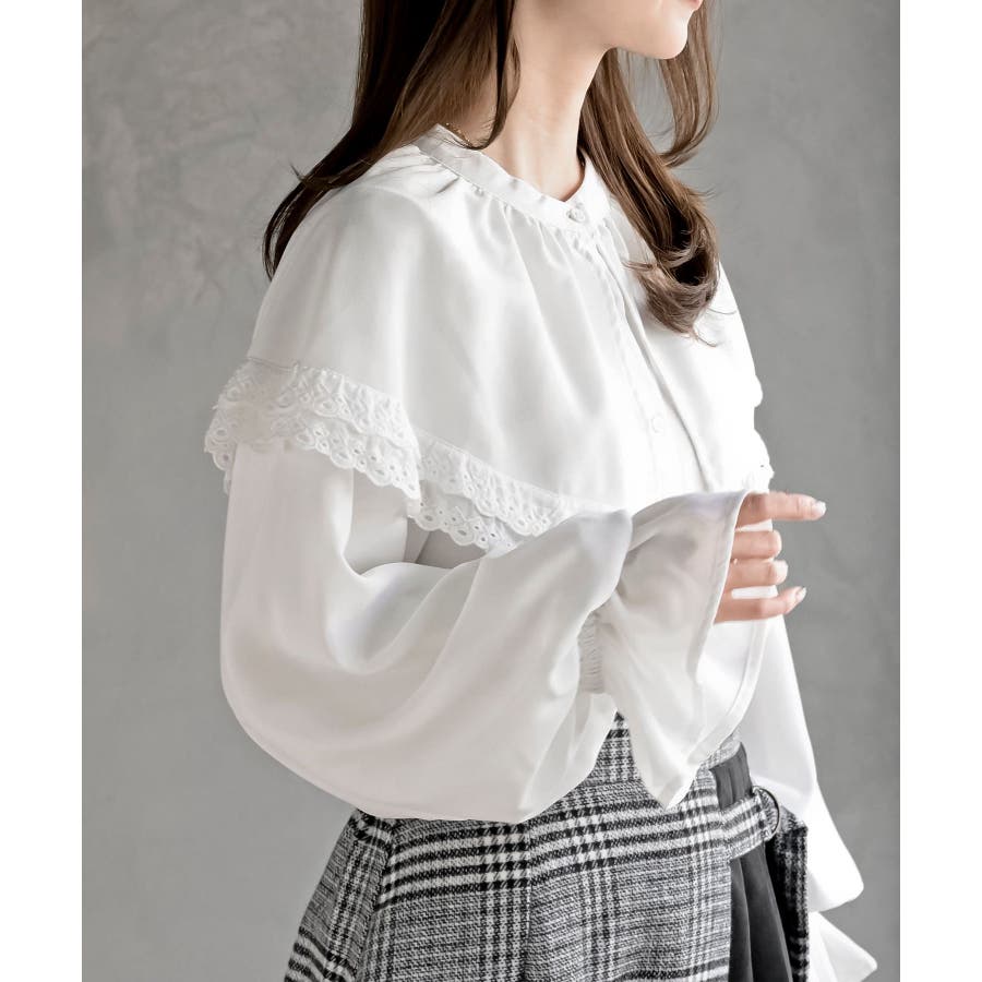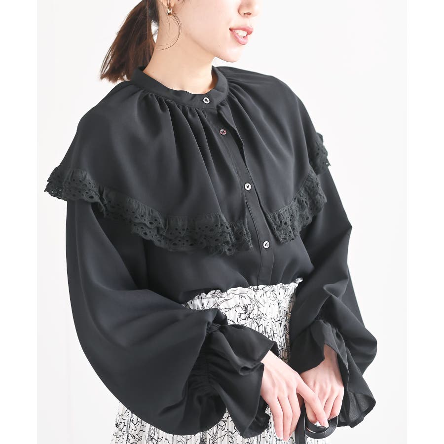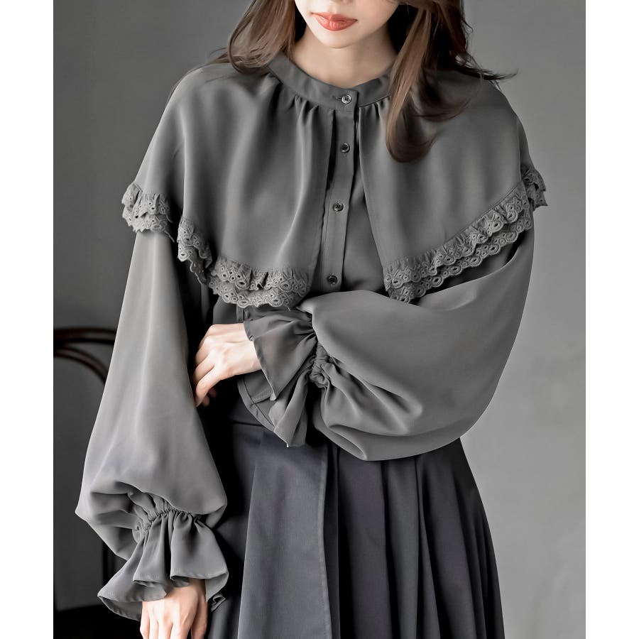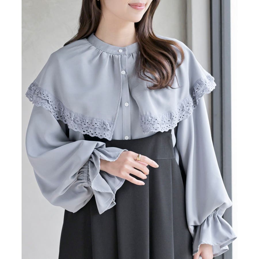 袖分が広がっており、ゆったりとしたシルエットになります。ケープのような襟が可愛く、キレイめの印象になります。