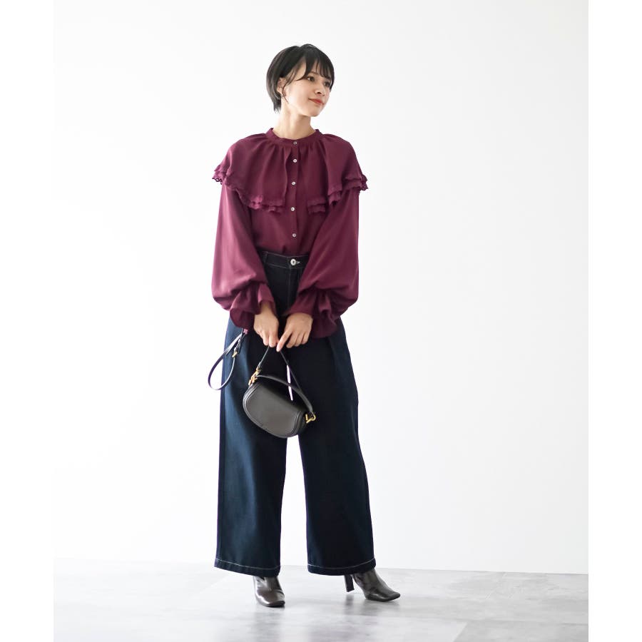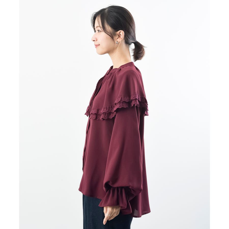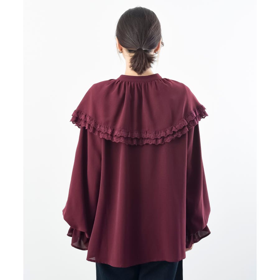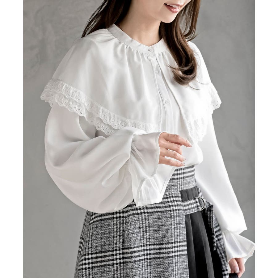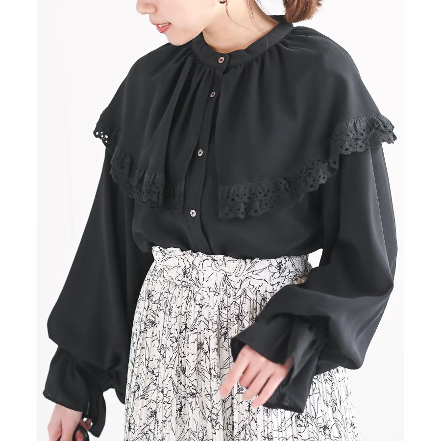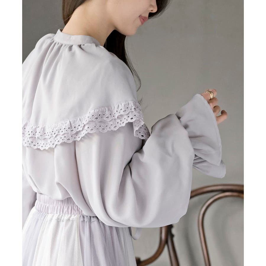 袖分が広がっており、ゆったりとしたシルエットになります。ケープのような襟が可愛く、キレイめの印象になります。