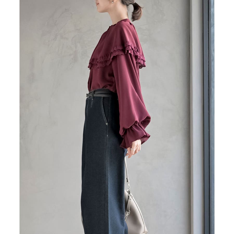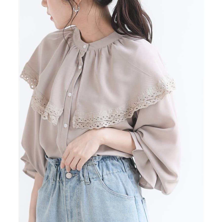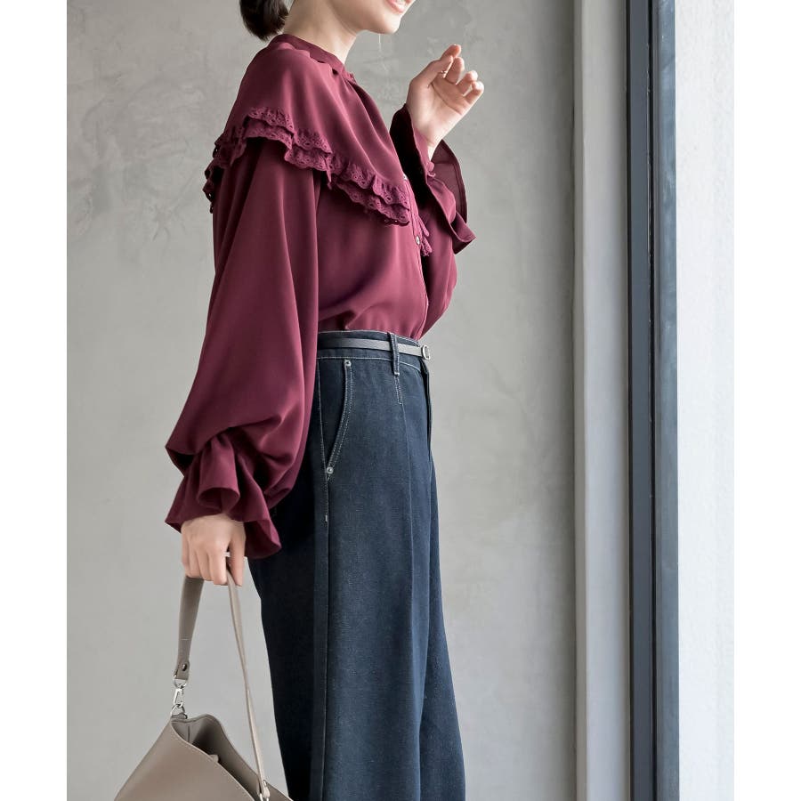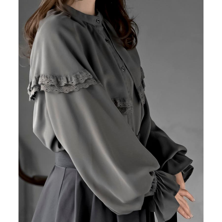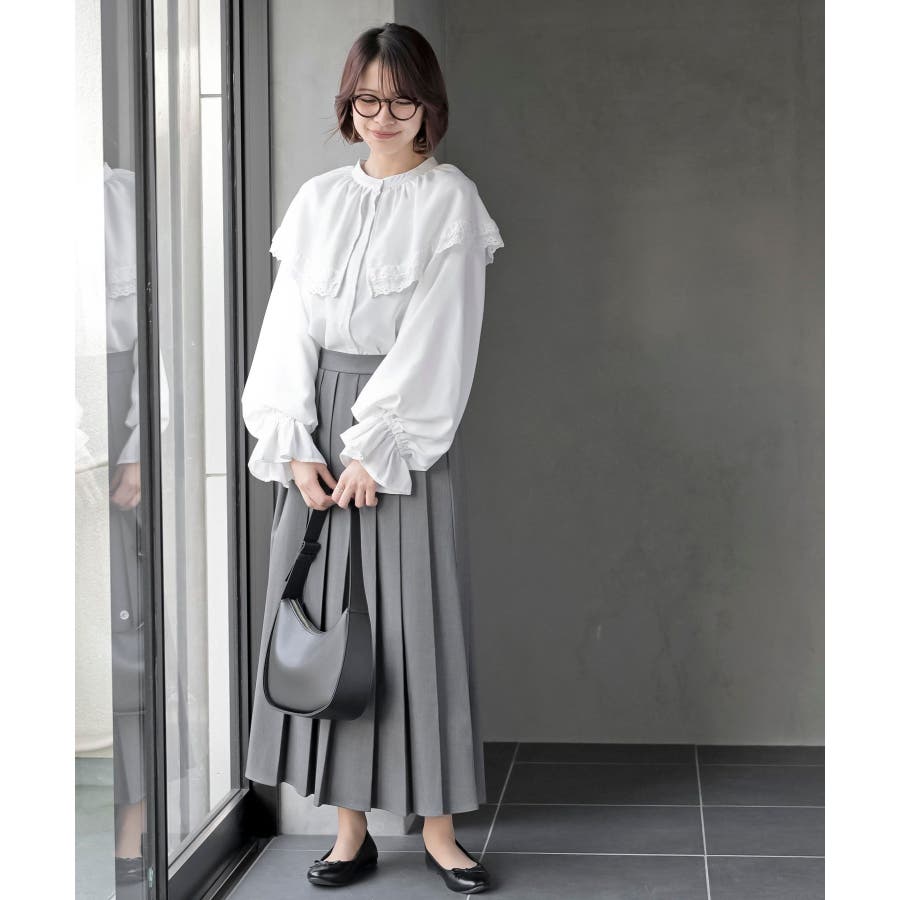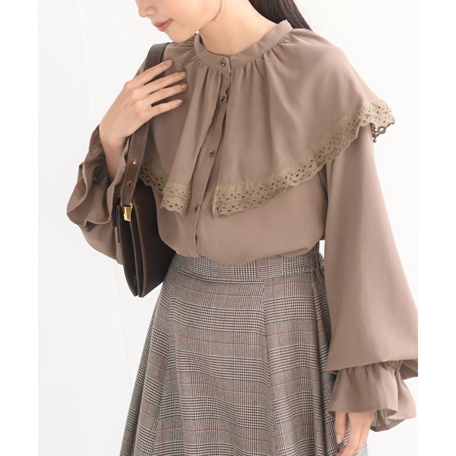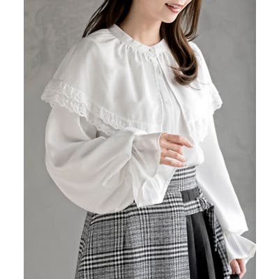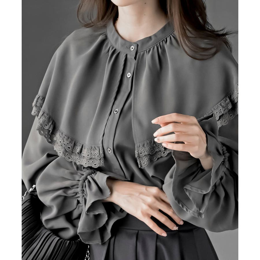 袖分が広がっており、ゆったりとしたシルエットになります。ケープのような襟が可愛く、キレイめの印象になります。