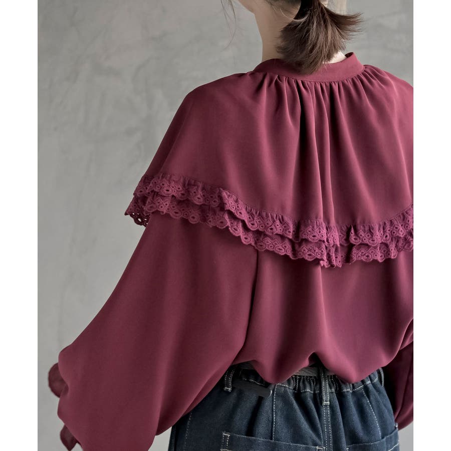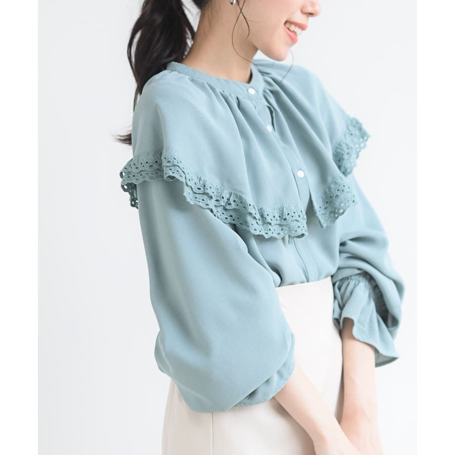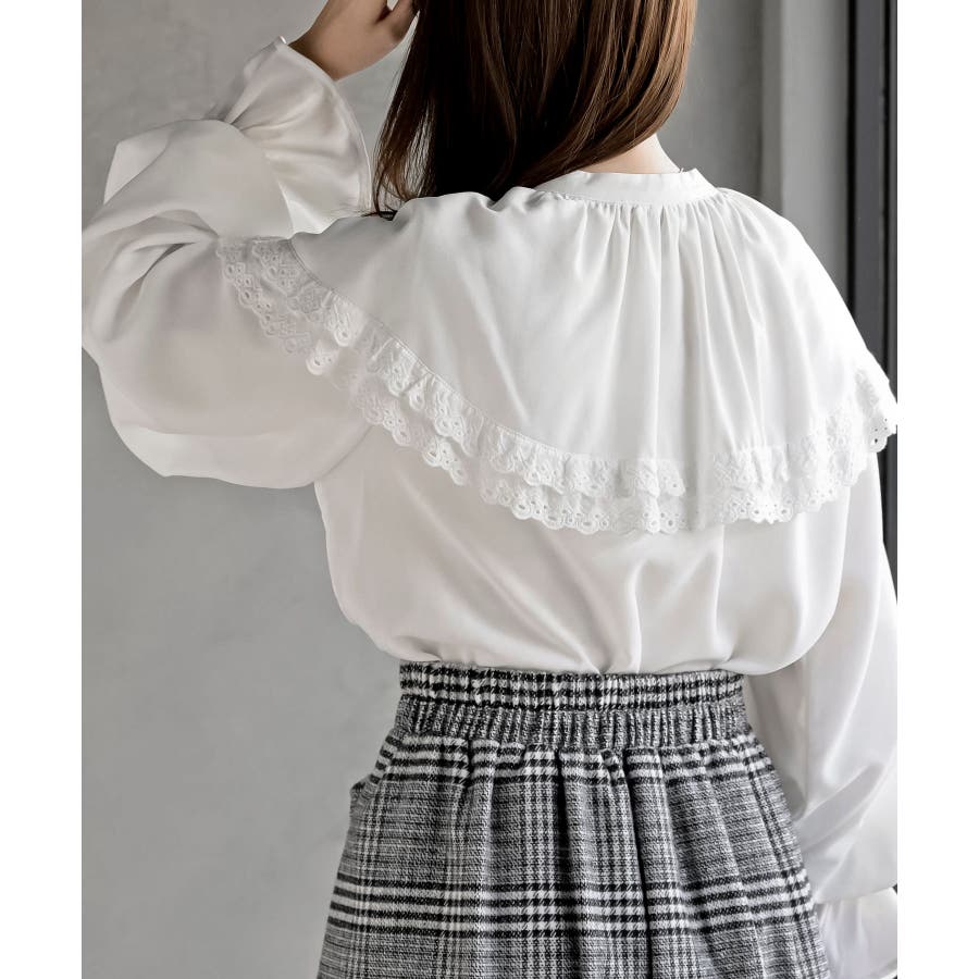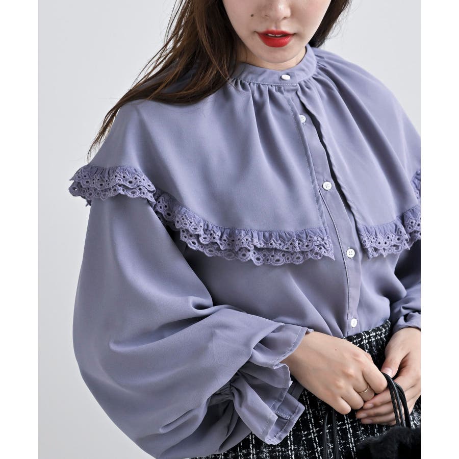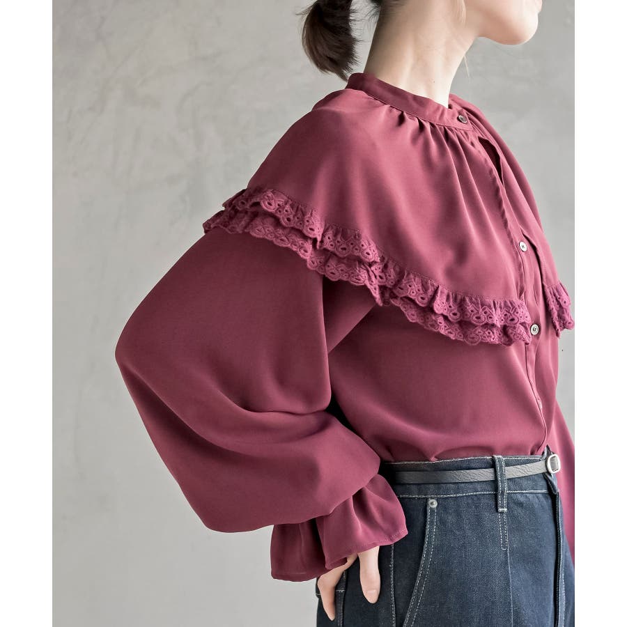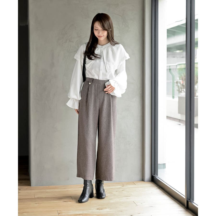 袖分が広がっており、ゆったりとしたシルエットになります。ケープのような襟が可愛く、キレイめの印象になります。