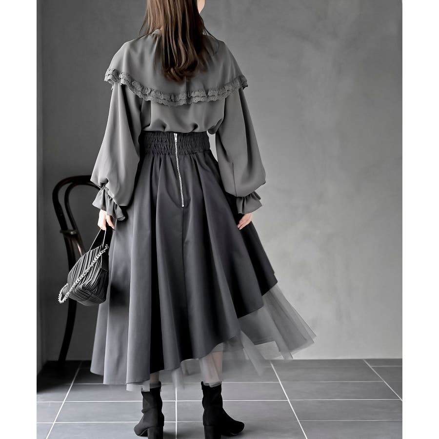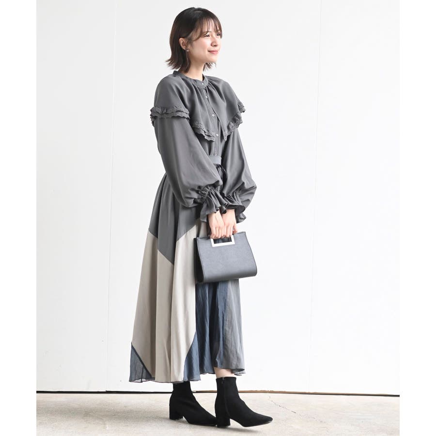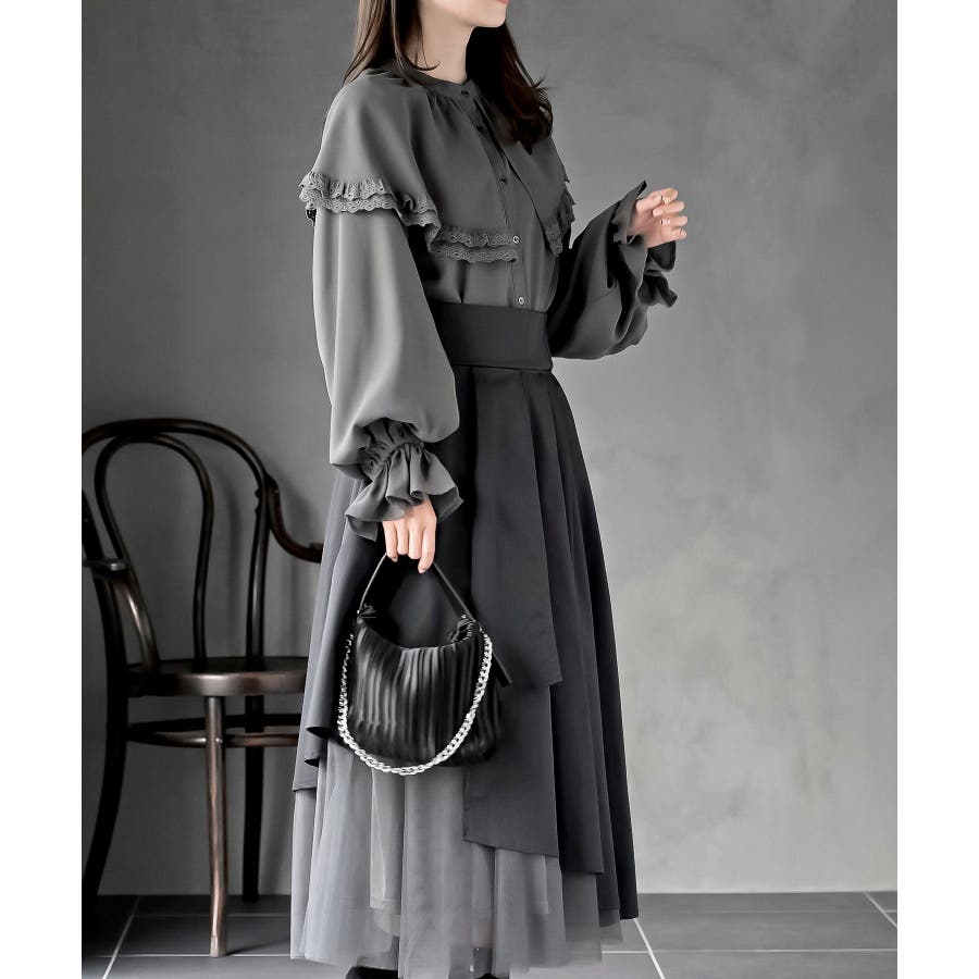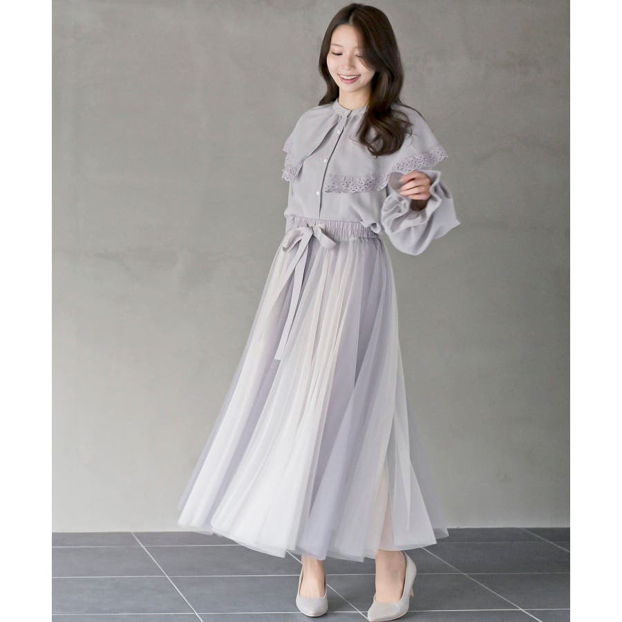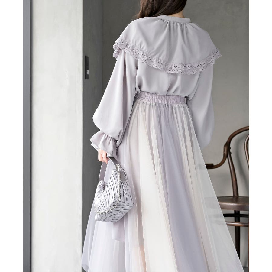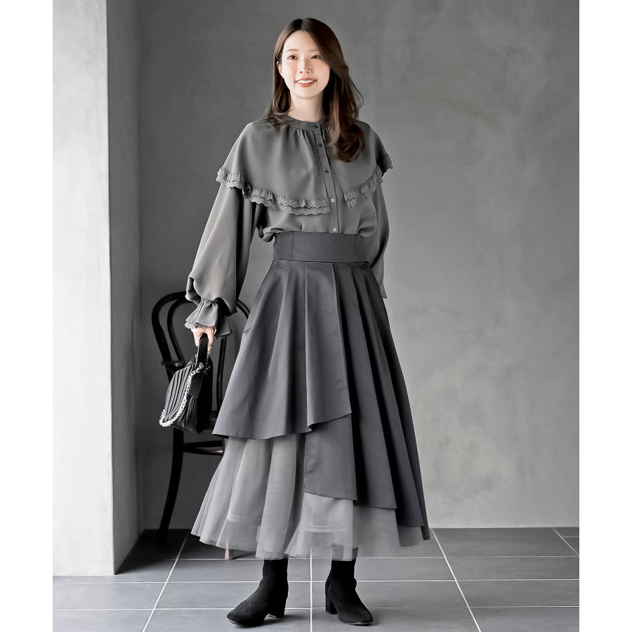 袖分が広がっており、ゆったりとしたシルエットになります。ケープのような襟が可愛く、キレイめの印象になります。