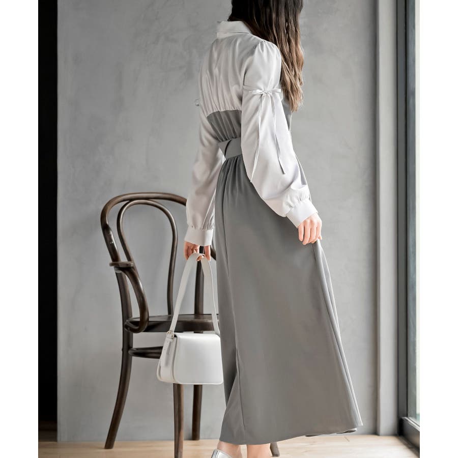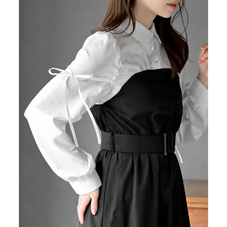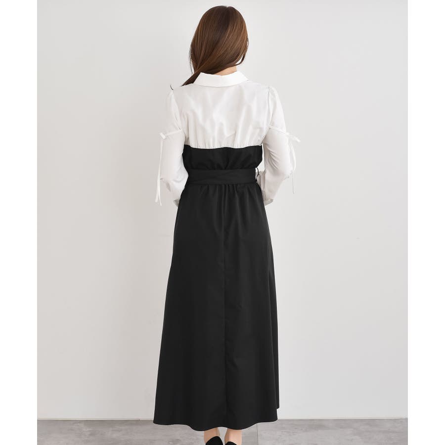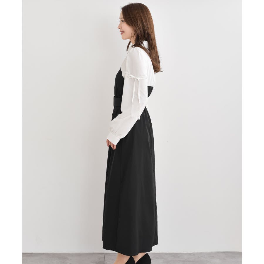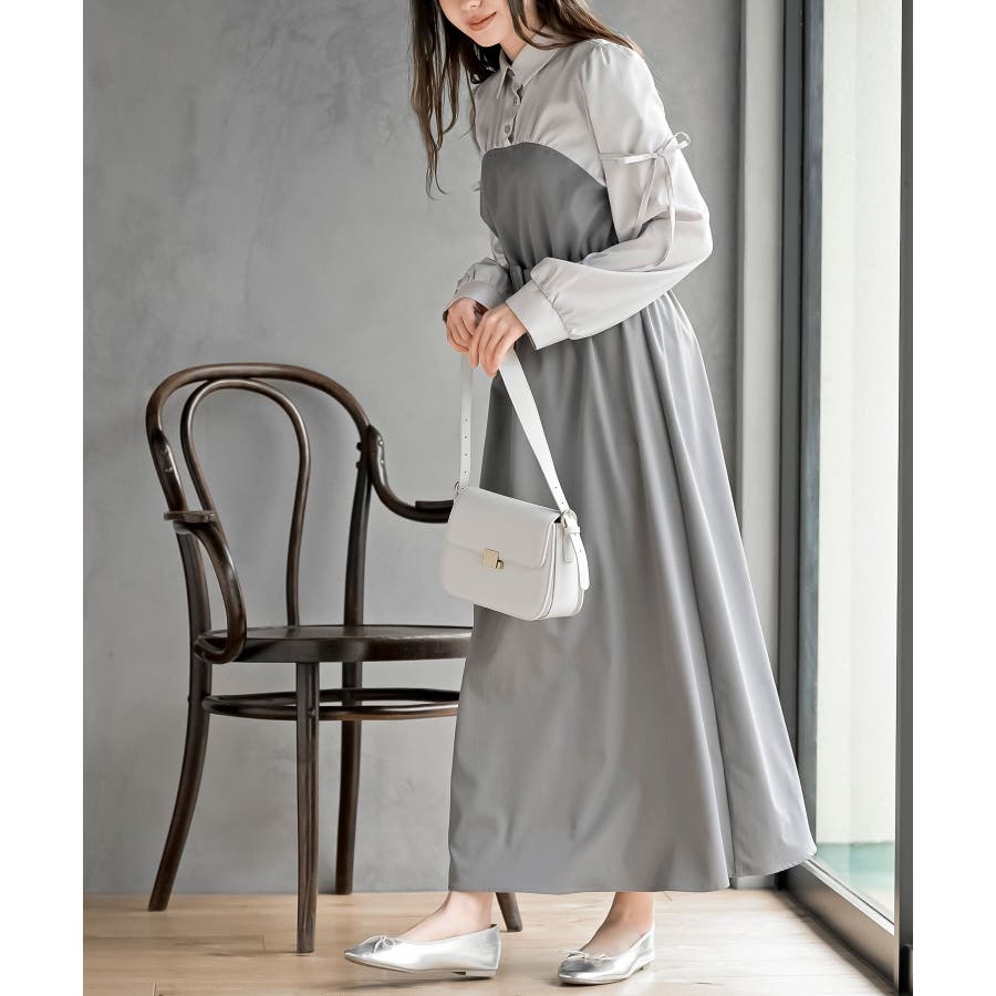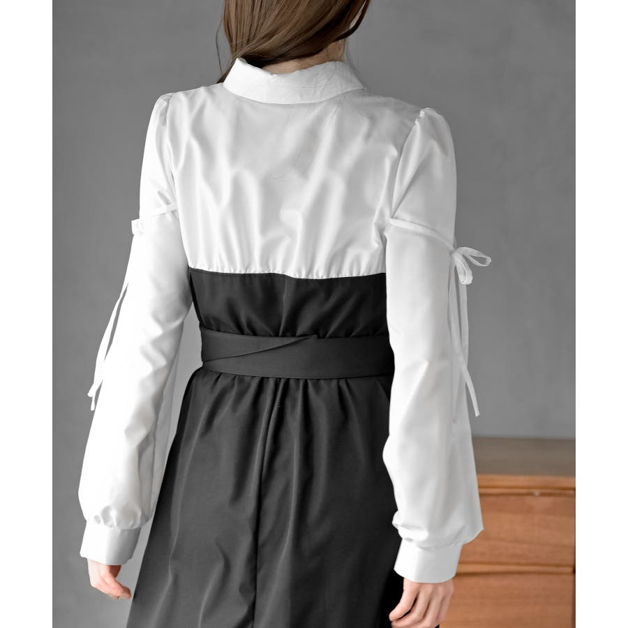 異素材切替リボン袖ドッキングワンピース