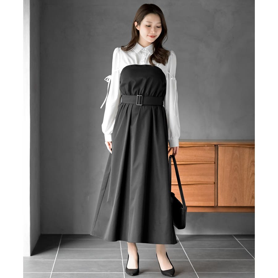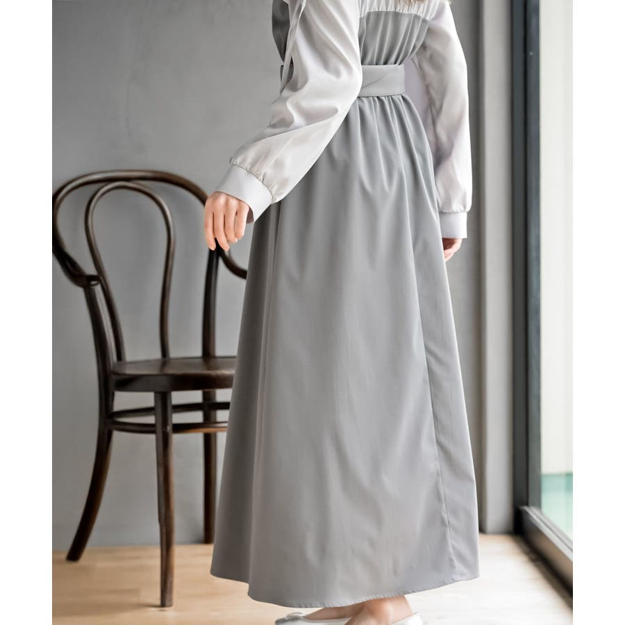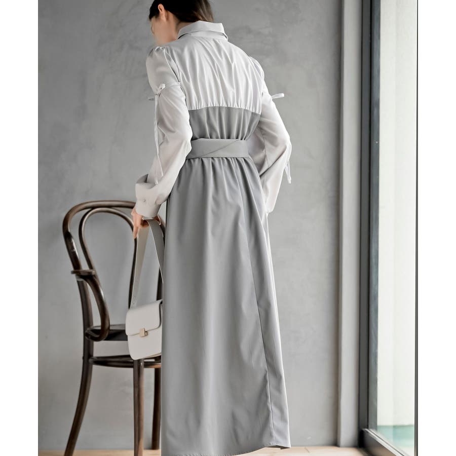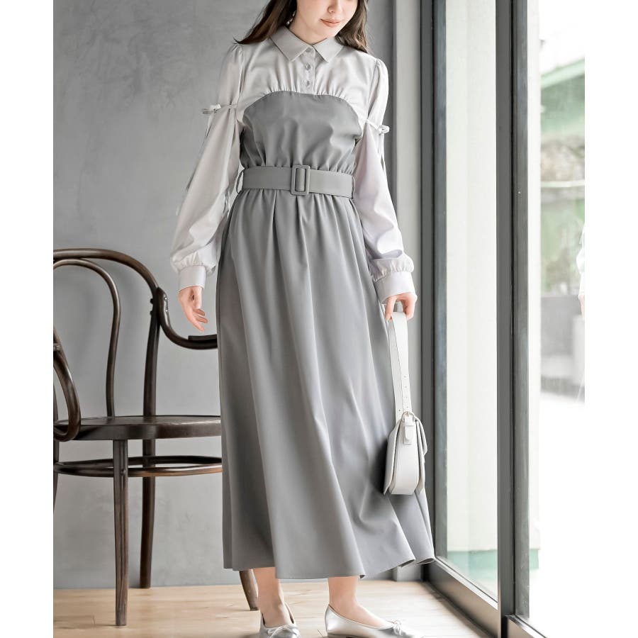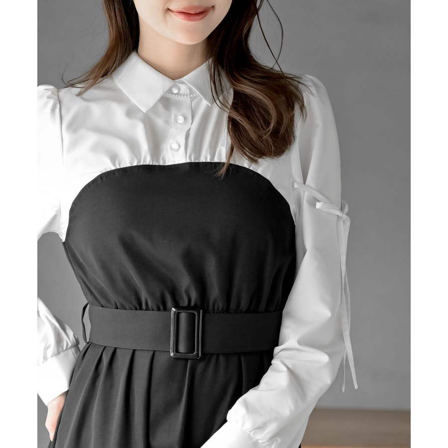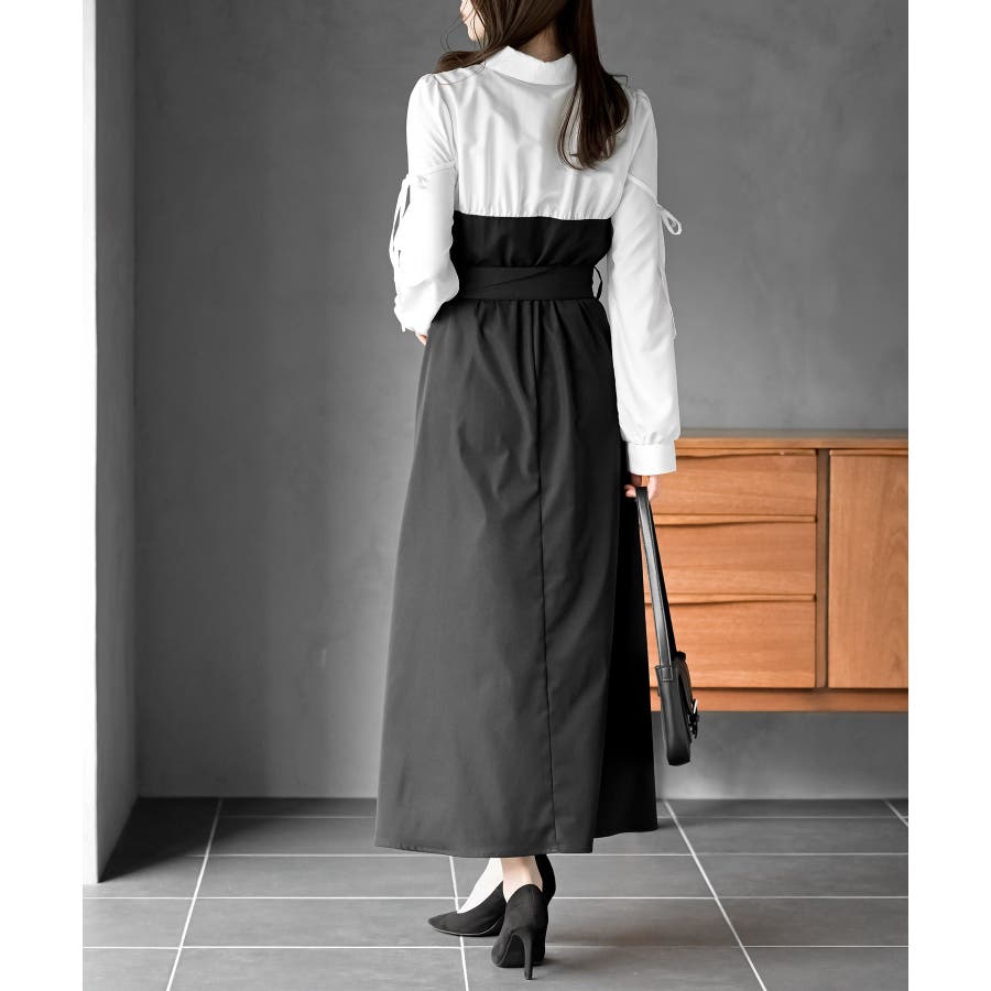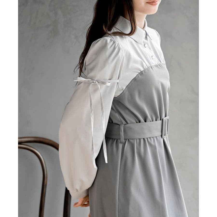 異素材切替リボン袖ドッキングワンピース