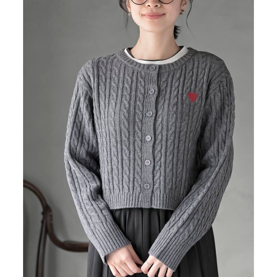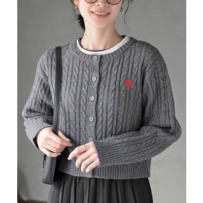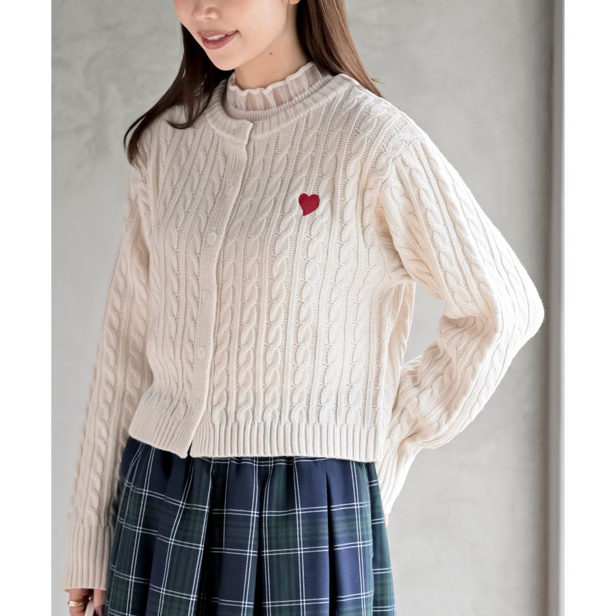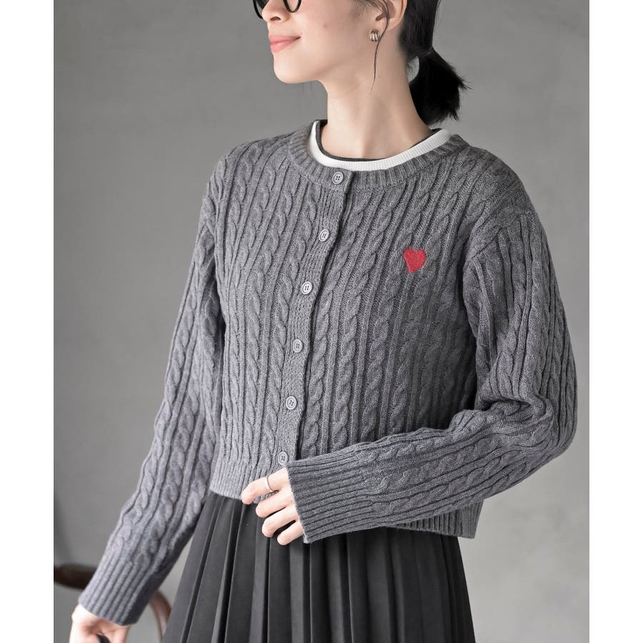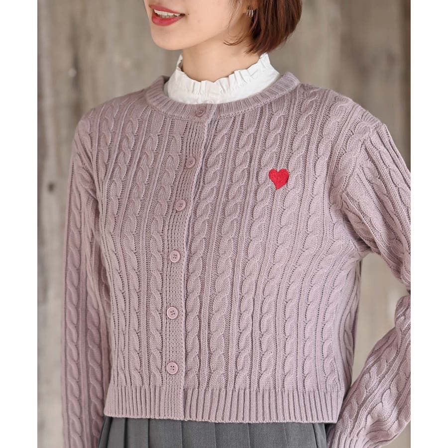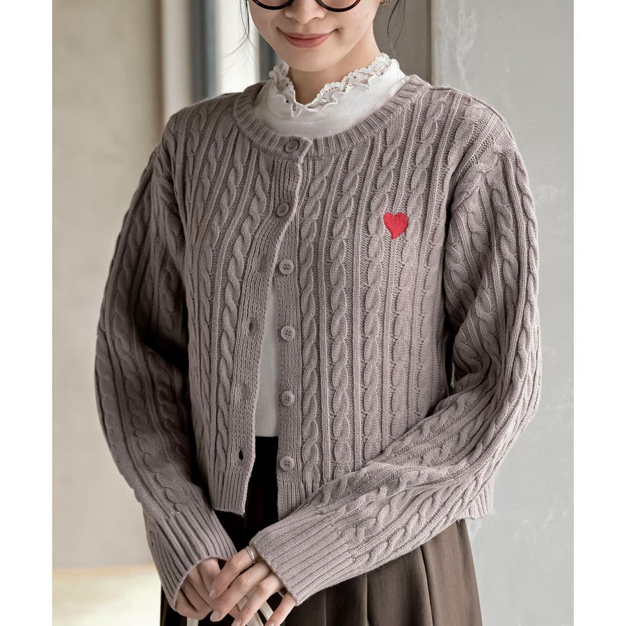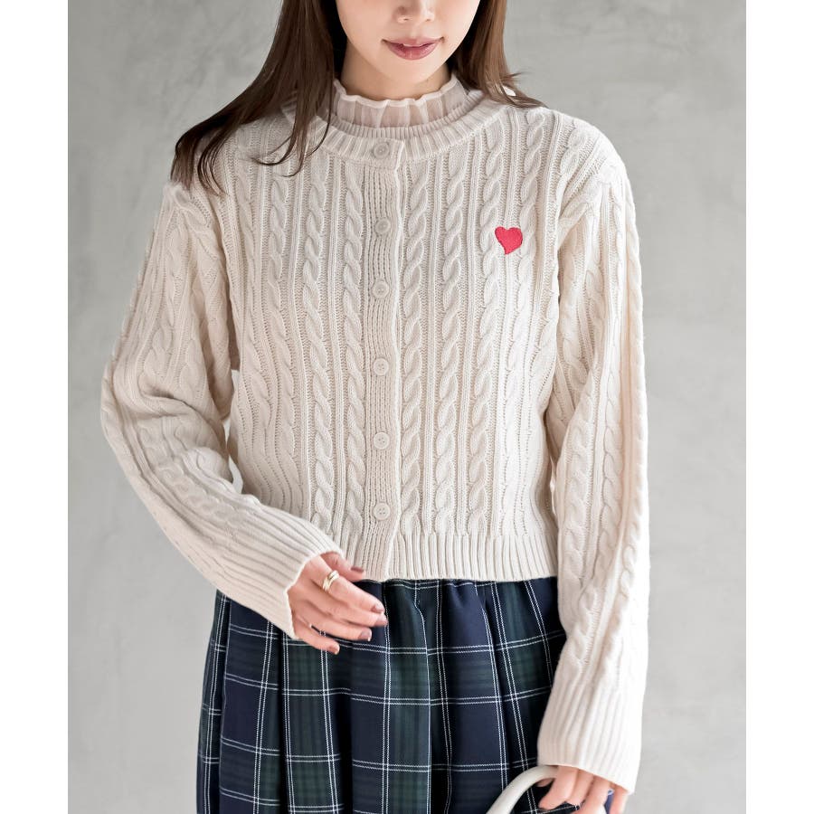 ハート刺繍ケーブルニットクルーネックカーディガン