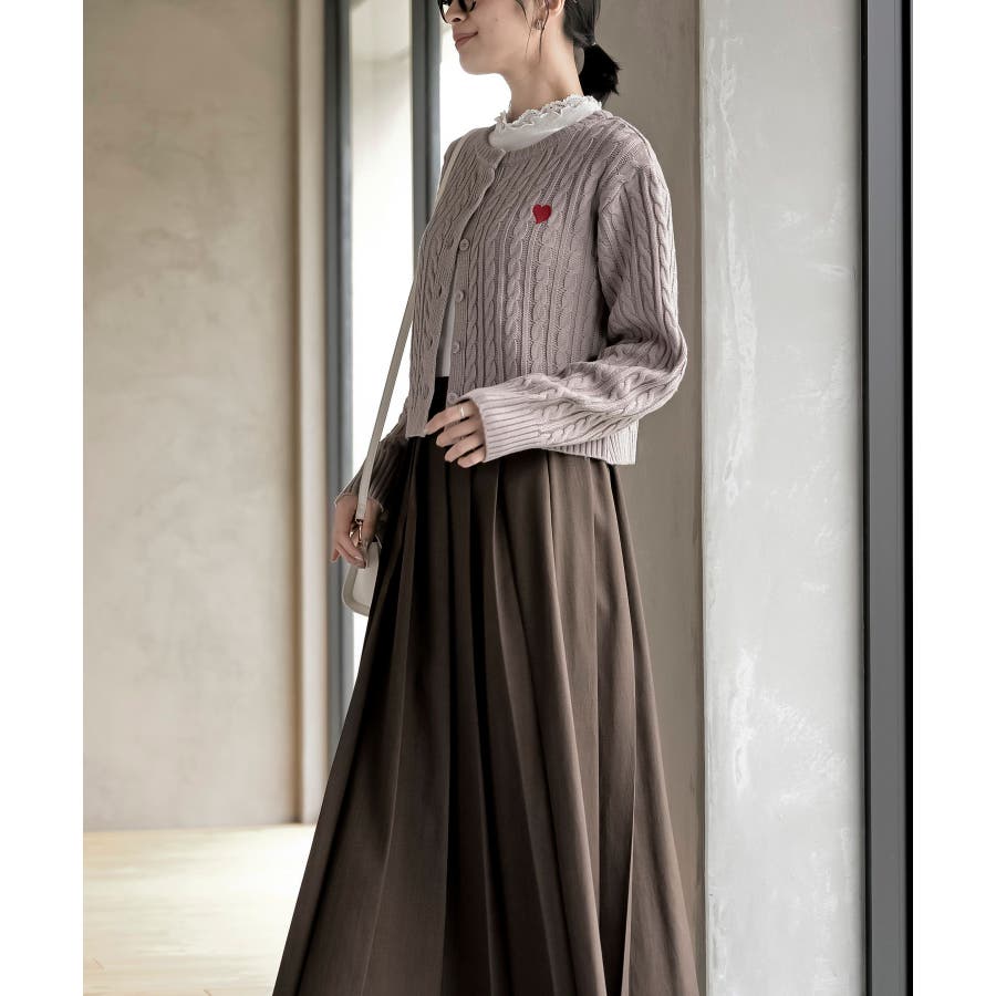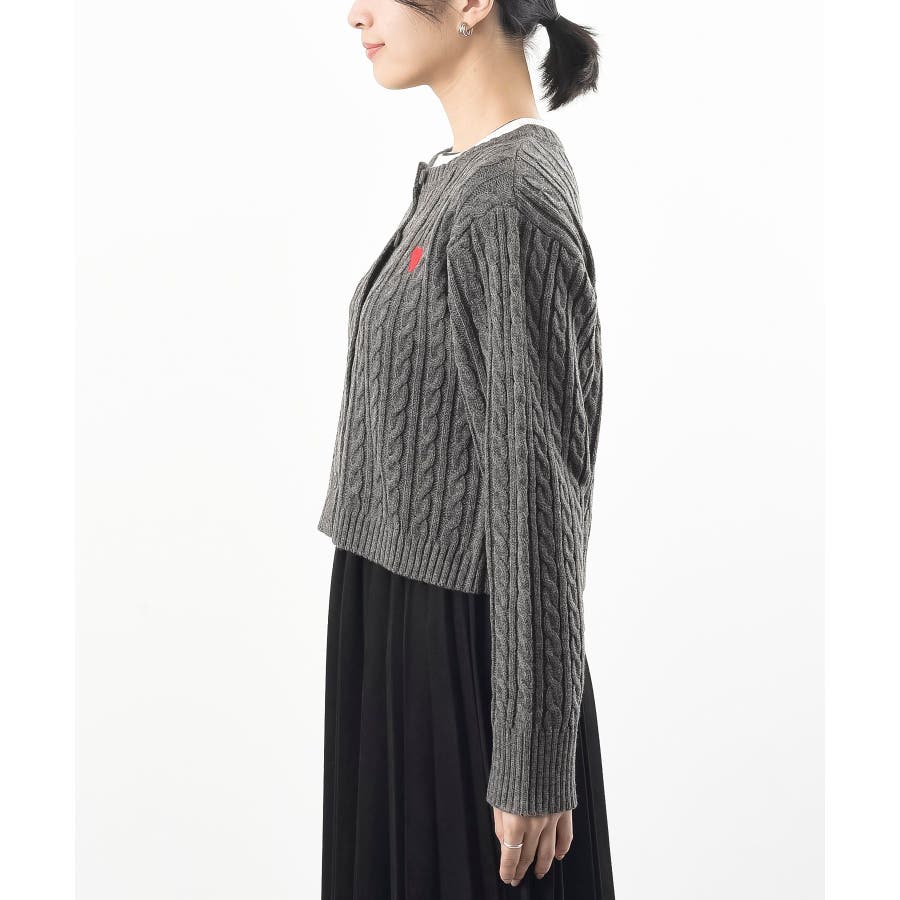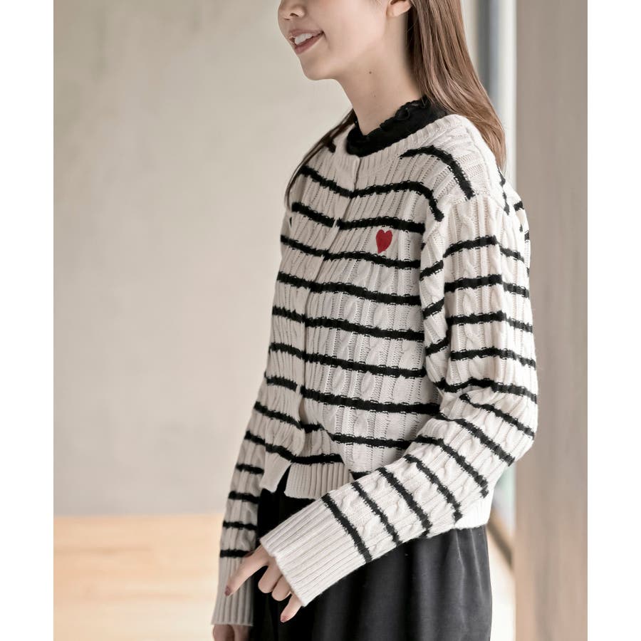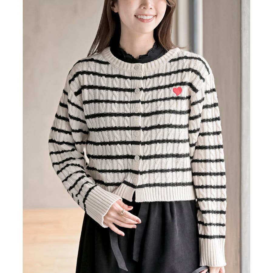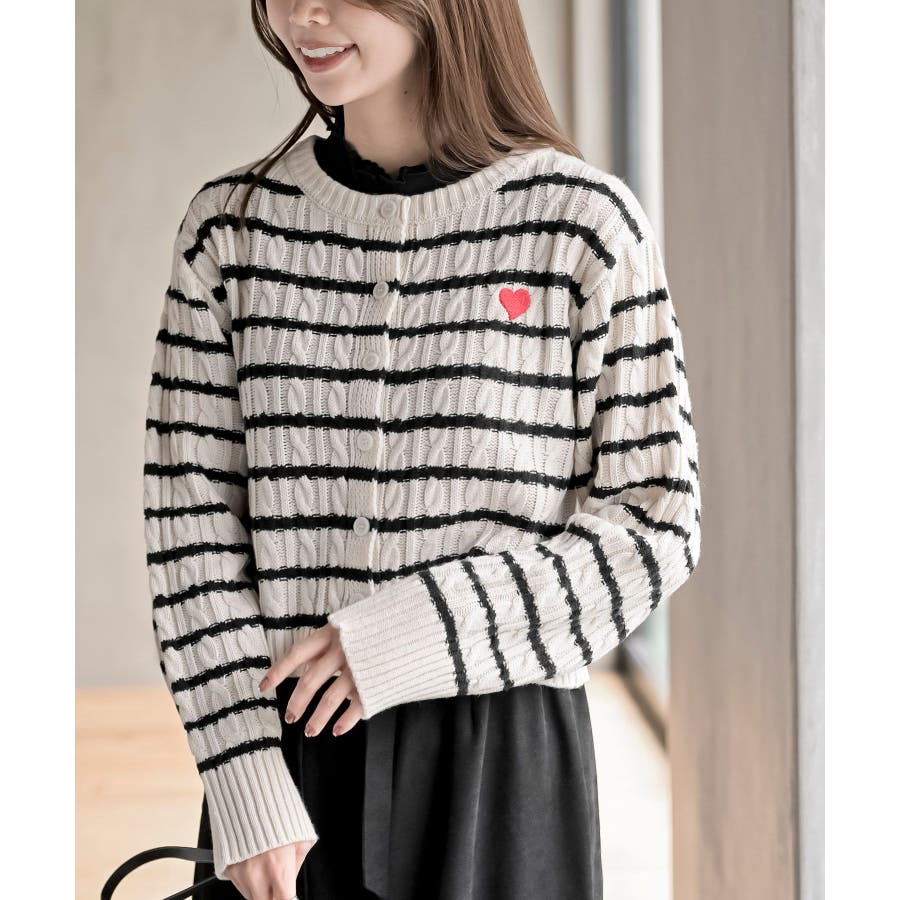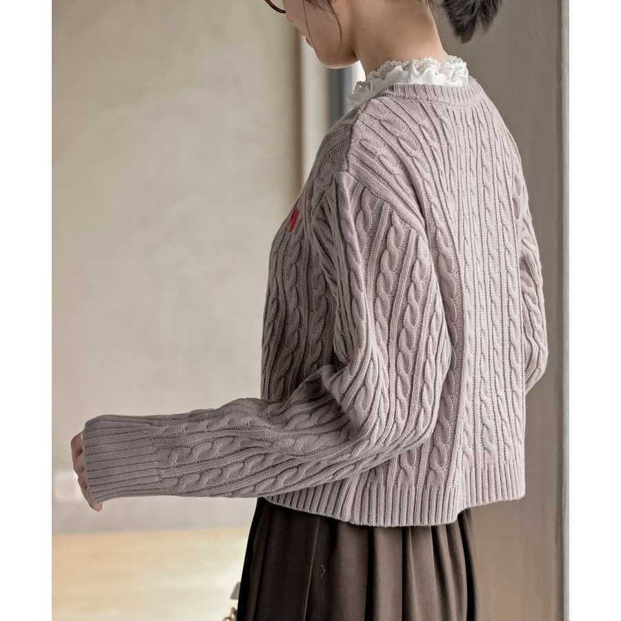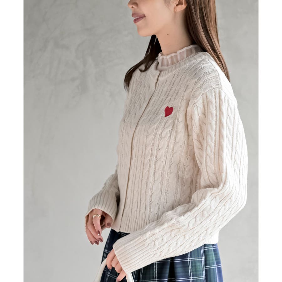 ハート刺繍ケーブルニットクルーネックカーディガン