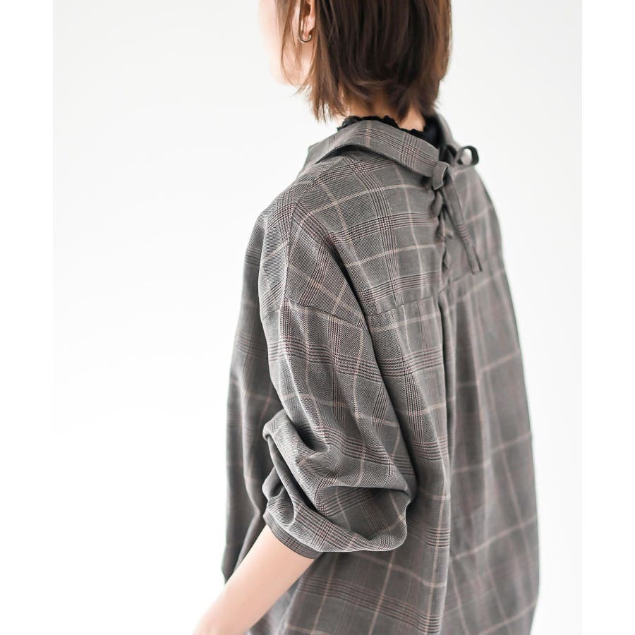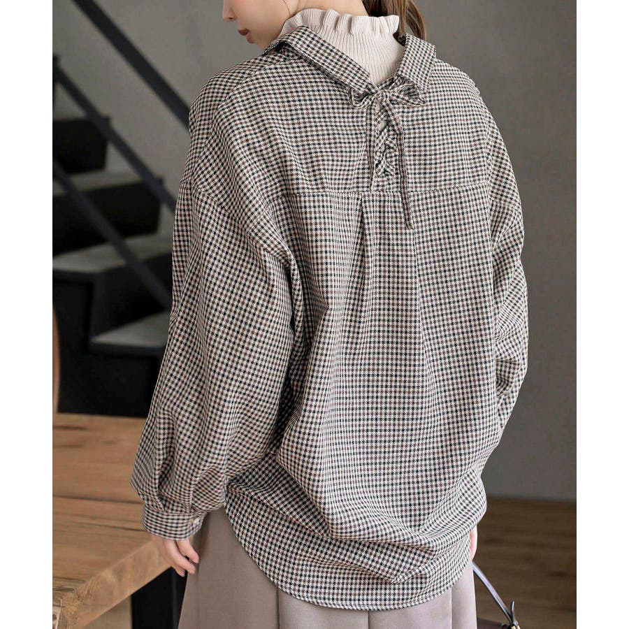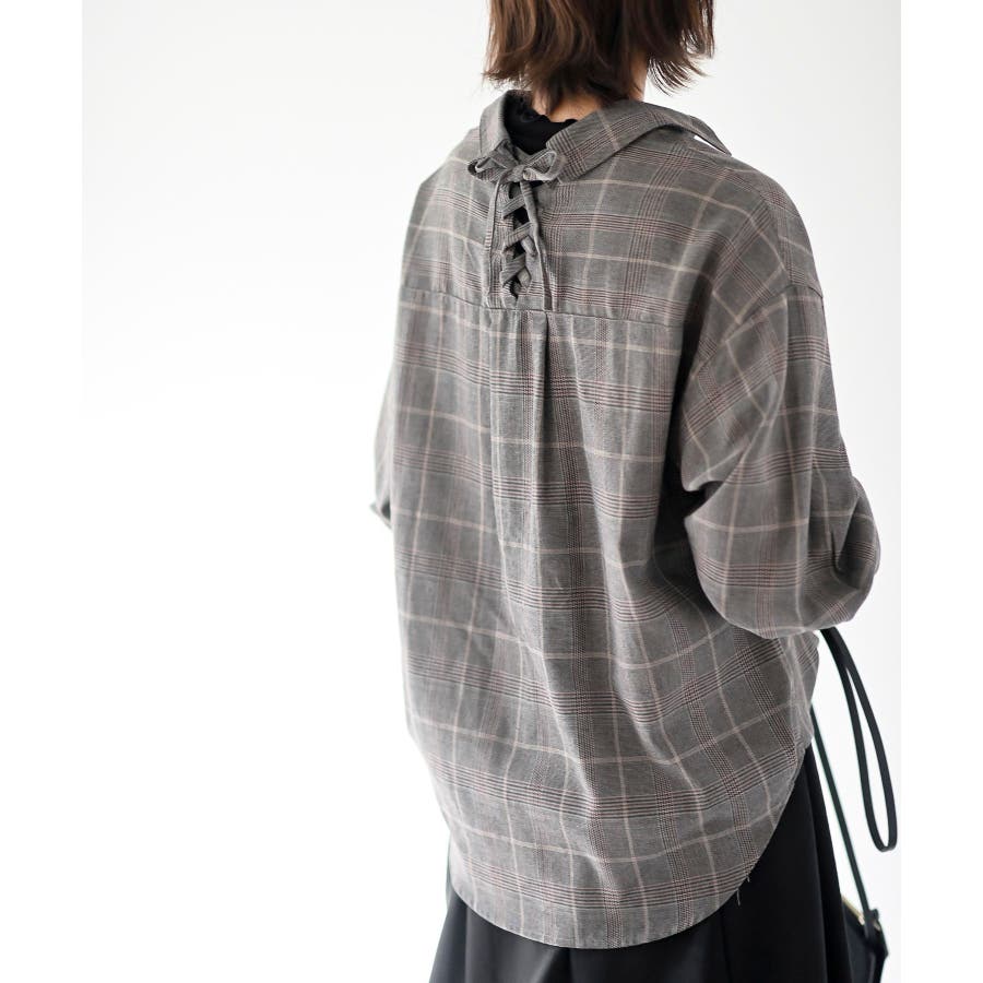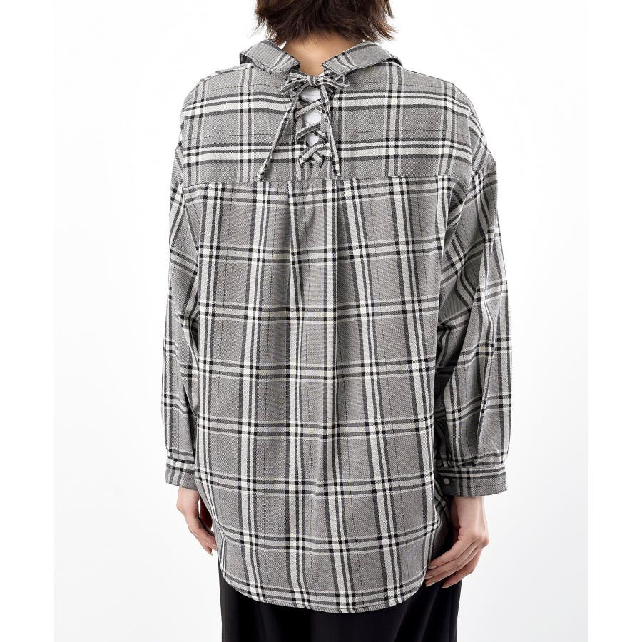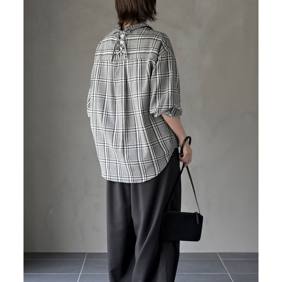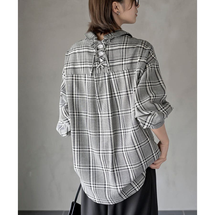 BACKレースアップ裾タックチェックブラウス